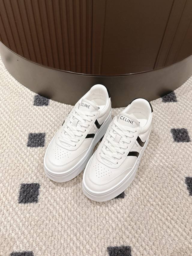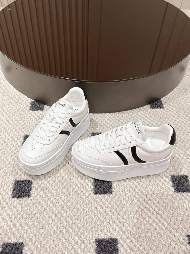 Celine 2025 New Platform 5cm Classic White Sneakers, adorned with simple yet stylish colorful lines, exuding a subtle yet sophisticated feel, every detail is exquisite. The 5cm platform design subtly adds height without looking bulky, making walking super stable.