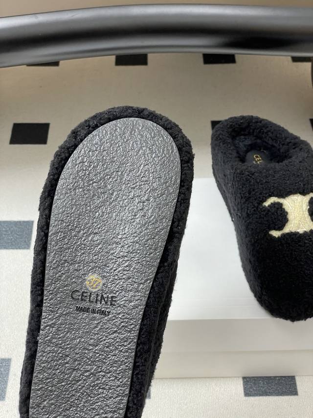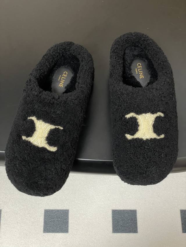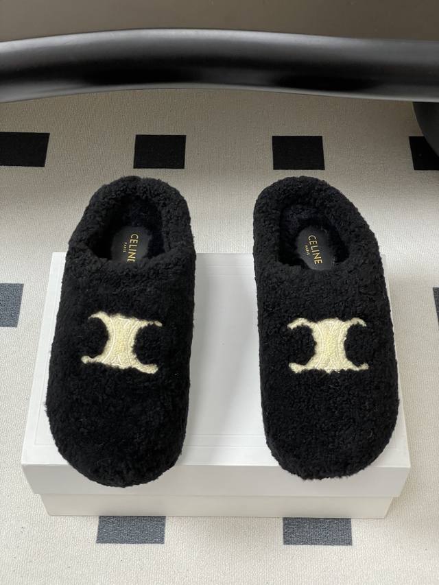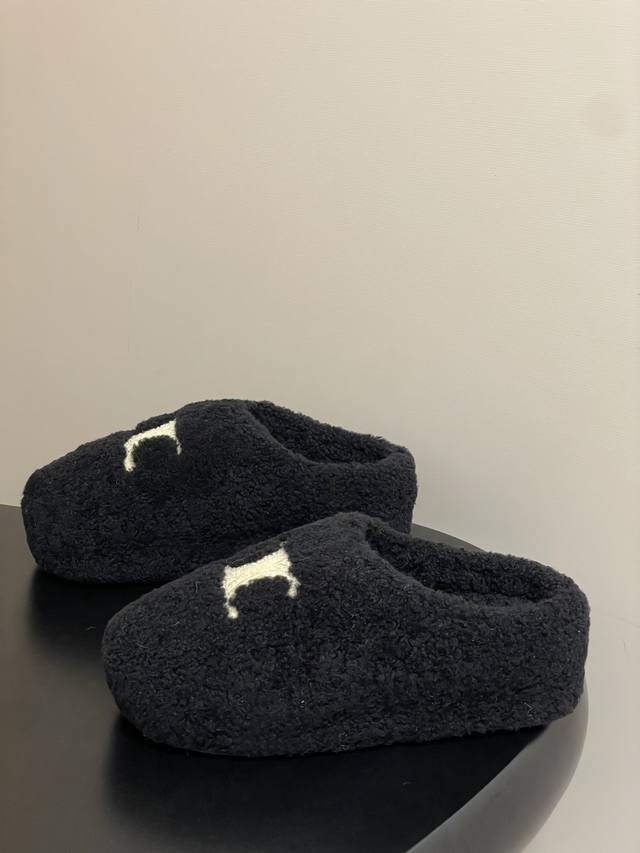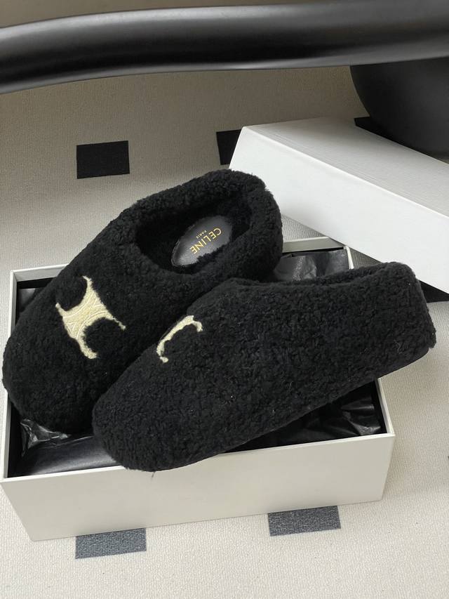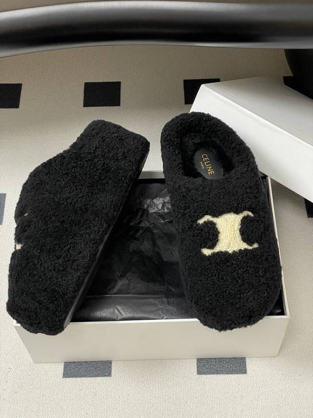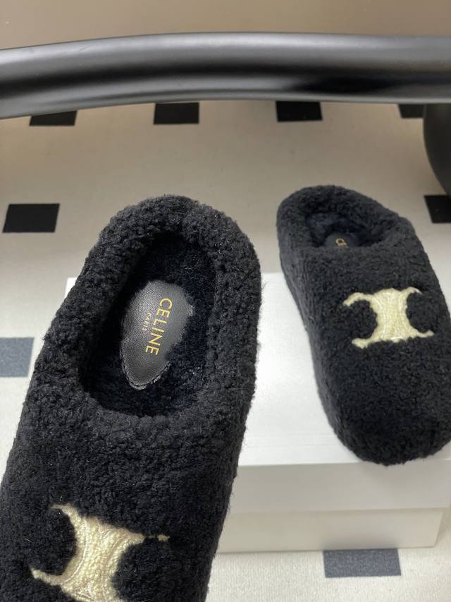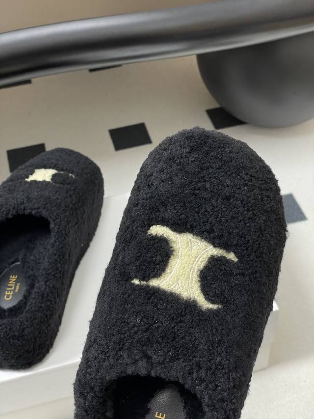 25Fw New autumn and winter Celine Arc de Triomphe thick-soled mules, wool half-slippers, furry shoes