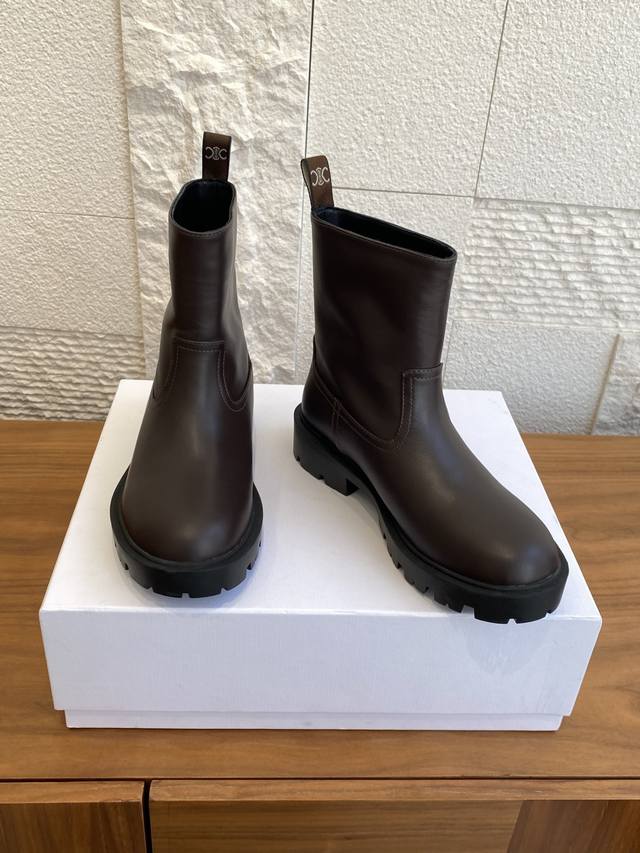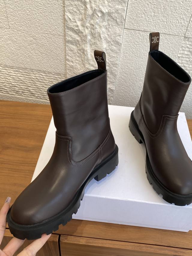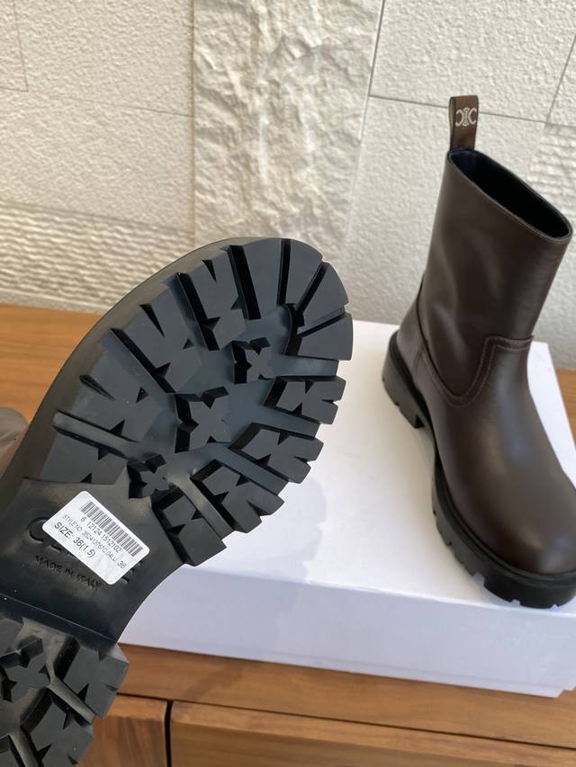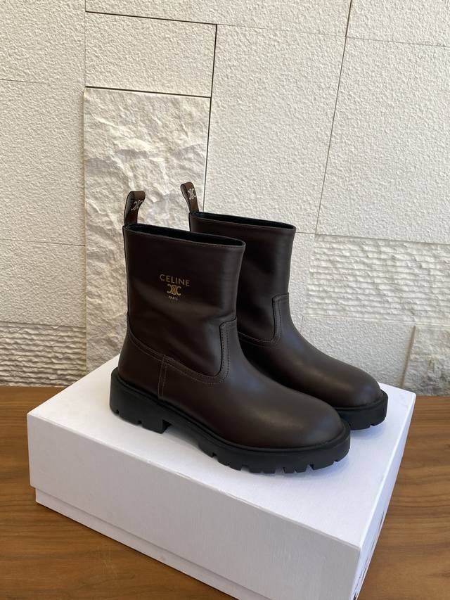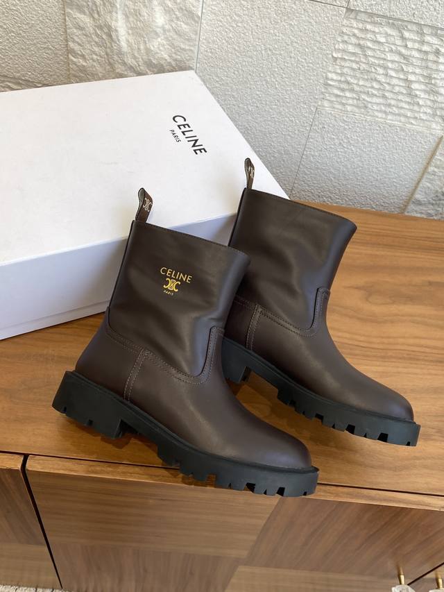 Top Version: Ankle Boots & High Boots DDD Celine 2025 Autumn/Winter New Arrival Triumphal Arch Thick-Soled Chelsea Martin Boots & Rider Boots DDD Celine Triumphal Arch Martin Boots & Rider Boots, featuring a cowhide upper with a gold-stamped logo, understated yet recognizable. The inner lining is soft and comfortable sheepskin, and the thick rubber outsole provides strong grip, is wear-resistant, and durable. The round toe design is retro and versatile, and the moderate boot height flatters the leg shape without looking bulky. Perfect for pairing with coats and knit dresses in autumn and winter! DDD Material: Imported cowhide DDD Lining: Cowhide DDD Outsole: Original molded rubber outsole DDD Size: 35-41 40 41 Custom orders are non-refundable DDD