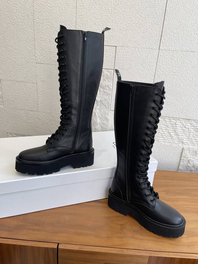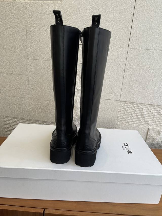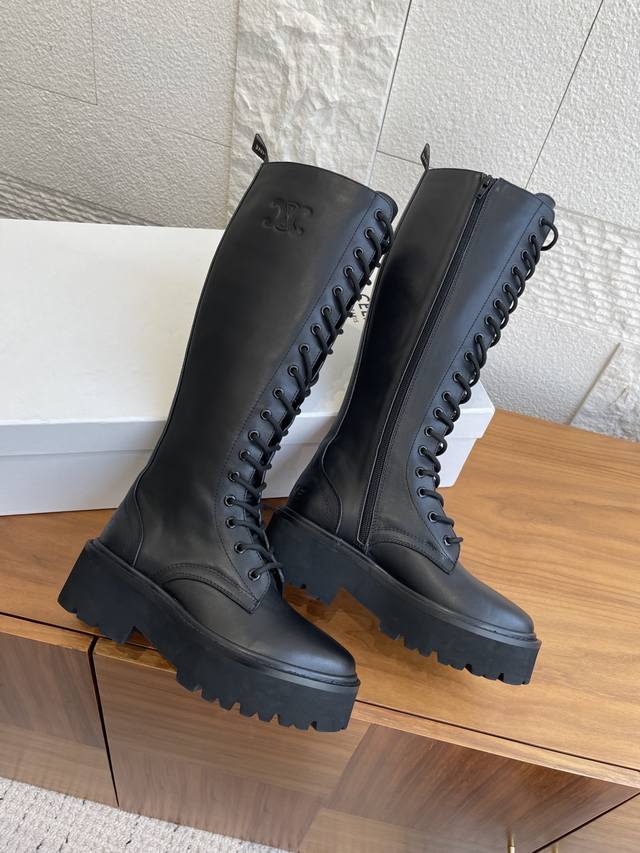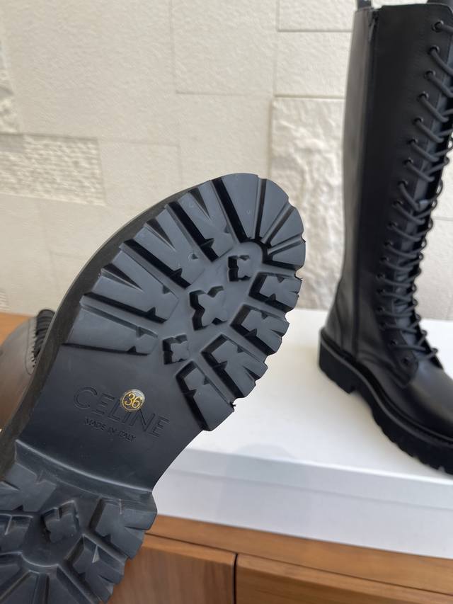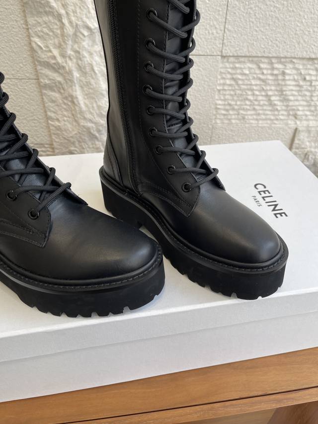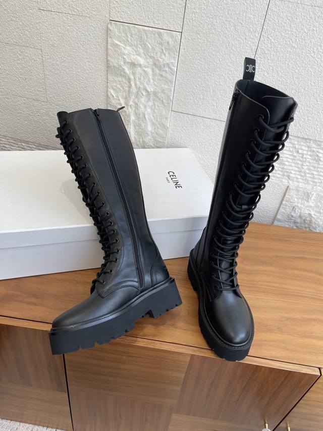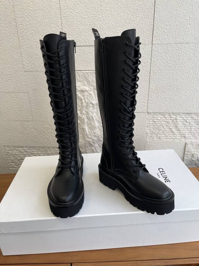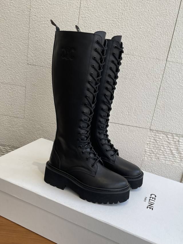 Top Version: Celine 2025 Autumn/Winter New Round Toe Thick-Soled Lace-Up Riding Boots. These riding boots feature custom waxed calfskin and imported lambskin lining for an incredibly delicate texture! The tall boot shaft is adorned with the Arc de Triomphe logo, and the exclusively developed durable suede leather welt features a multi-layered outsole. The thick sole design adds height and elongates the legs, while the adjustable elastic laces suit all leg types. Comfortable and stylish, these boots exude British style and pair beautifully with coats, skinny jeans, or denim. A must-have for autumn/winter, favored by celebrities and bloggers! Practical yet sophisticated, they're perfect for both work and leisure. Material: Imported calfskin; Lining: Imported cowhide; Outsole: Original molded foam outsole; Sole thickness: 4.5cm; Size: 35-41 (40 & 41 are custom-made and non-refundable).