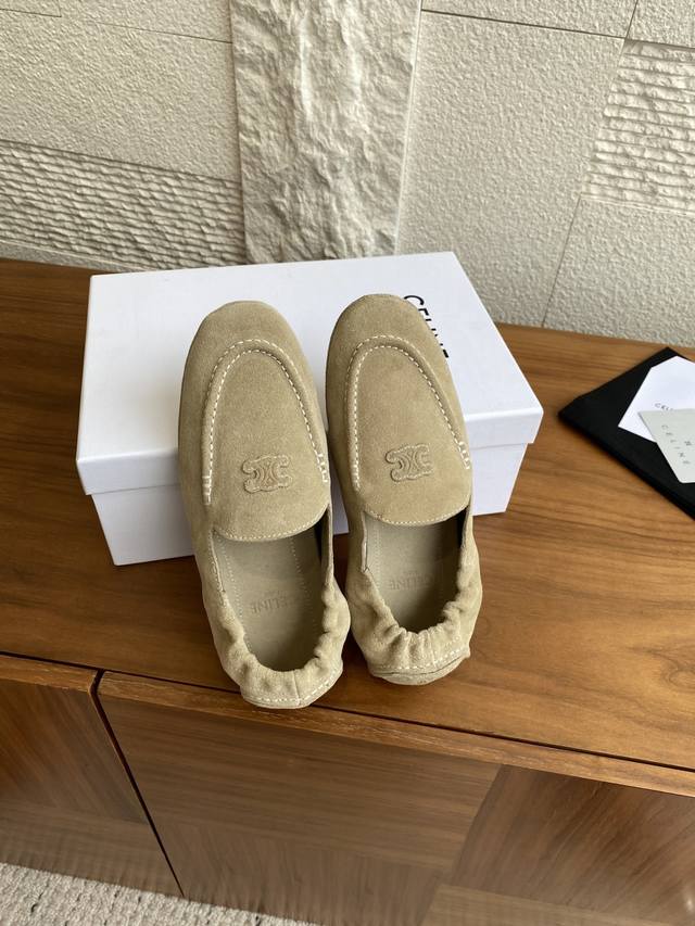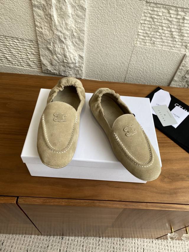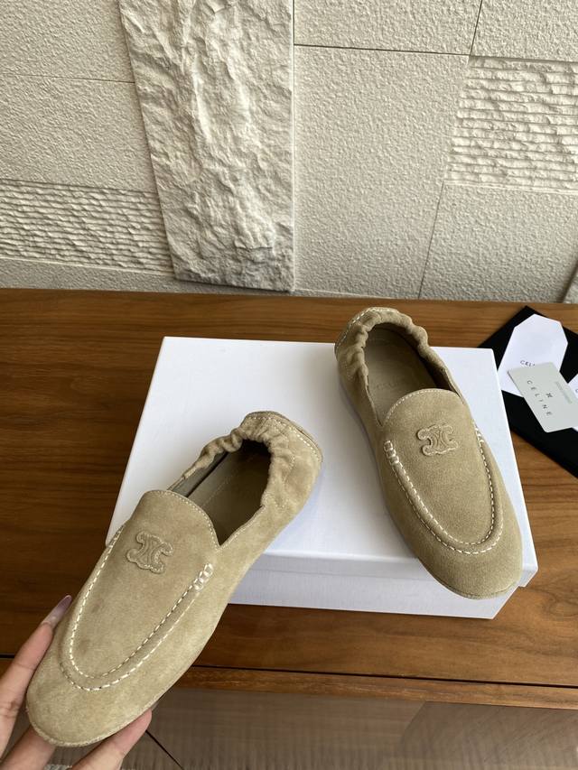Top Version: Celine 25Ss Autumn/Winter New Adam Triumph Flat Loafers. These Celine flat loafers feature a suede upper, a round toe design, and the Triomphe logo on the top. The Triomphe logo is embossed on the instep , and the Celine logo is embossed on the heel. An elastic band at the heel provides better support, and a simple leather insole offers comfort and flexibility. They are versatile enough to be paired with any outfit, showcasing the brand's style. Material: Imported suede. Lining: Imported nubuck leather. Outsole: Original molded rubber outsole. Size: 35-40. Size 40 is custom-made and non-refundable.