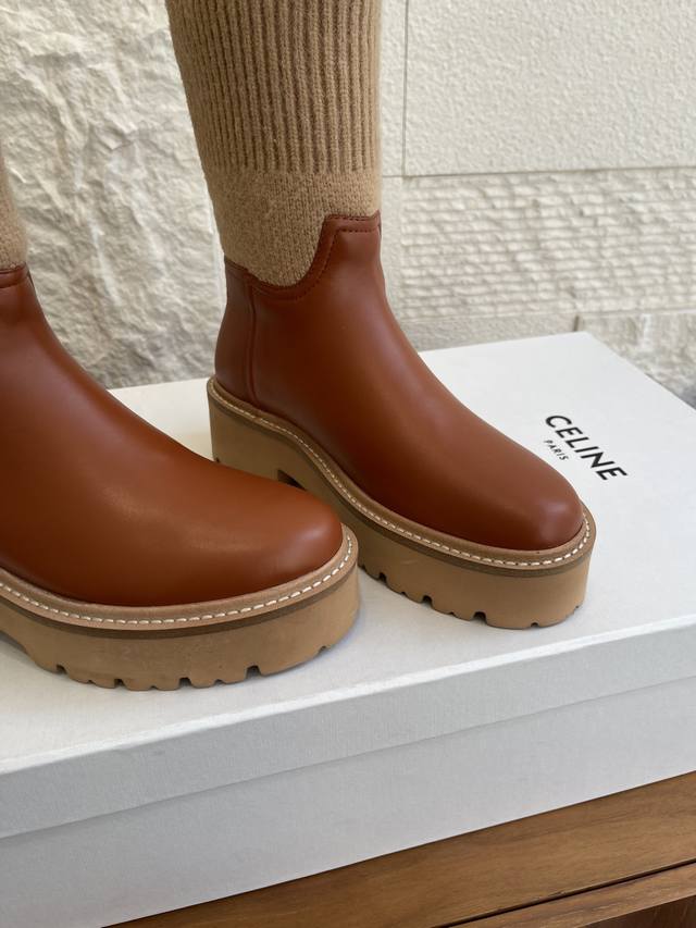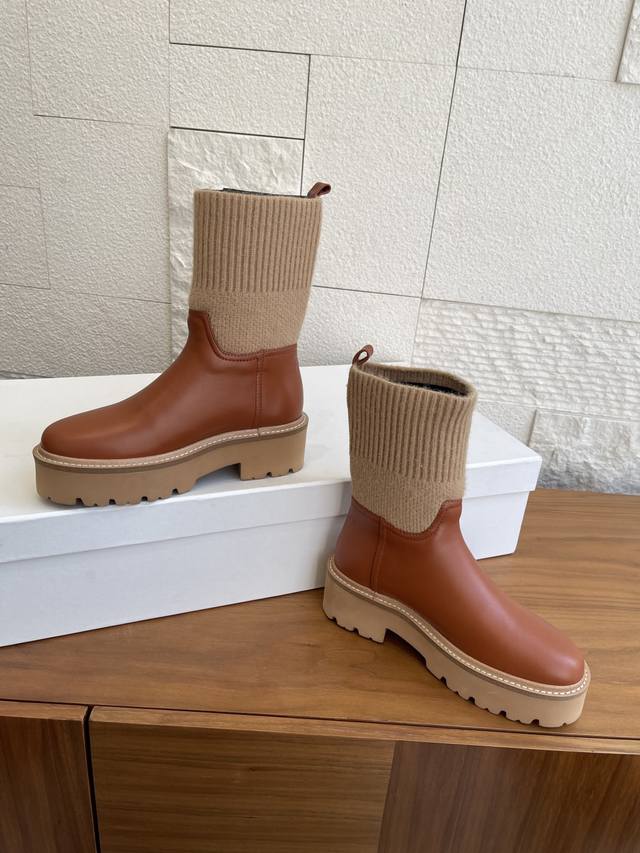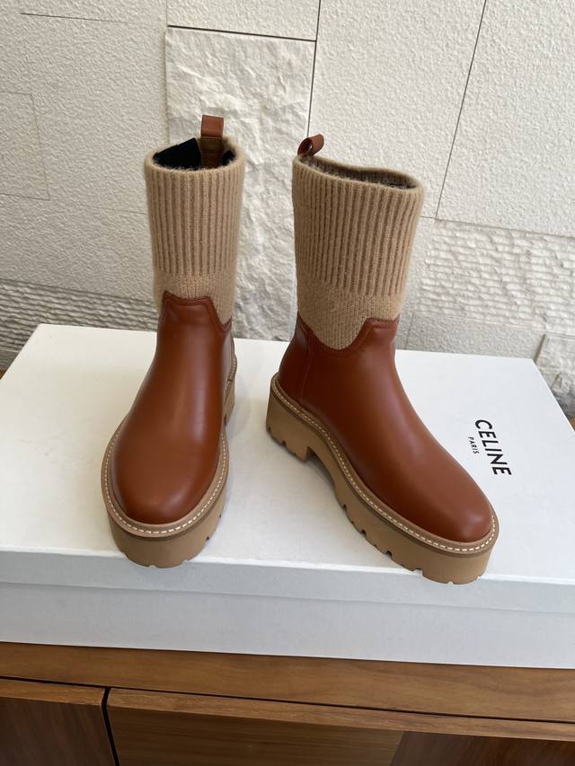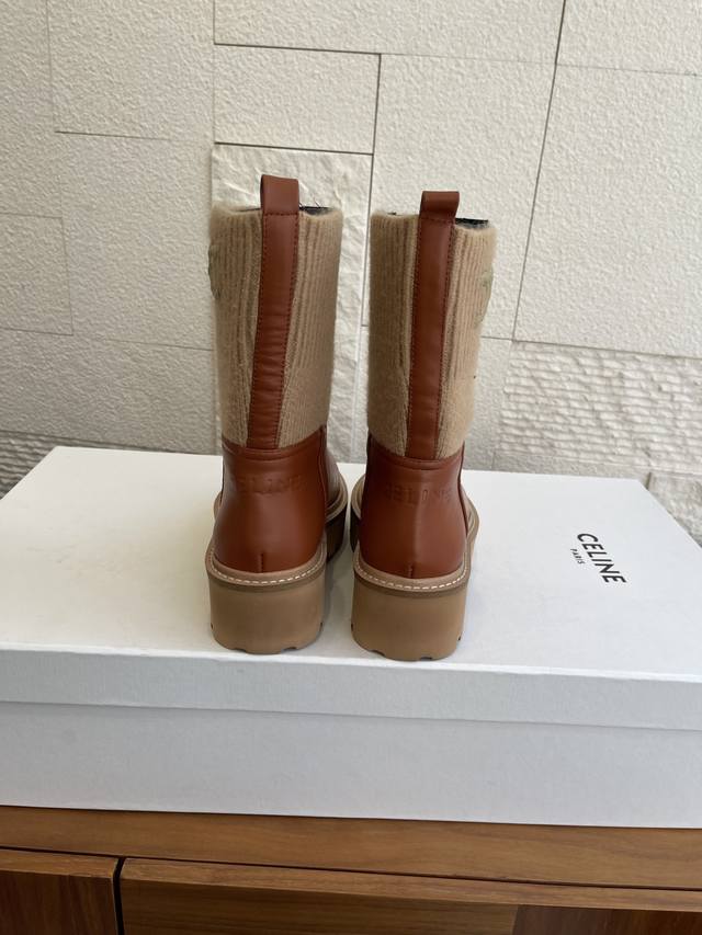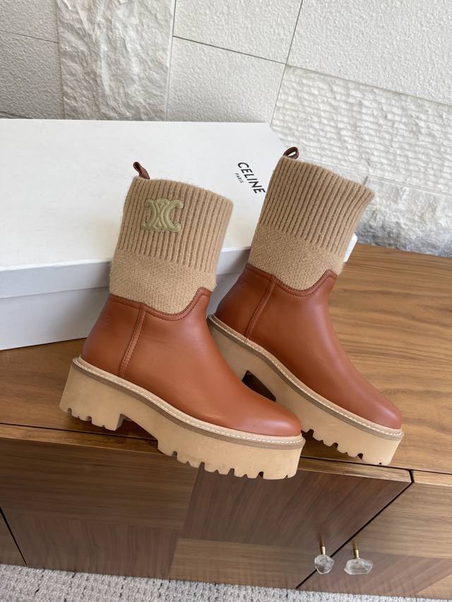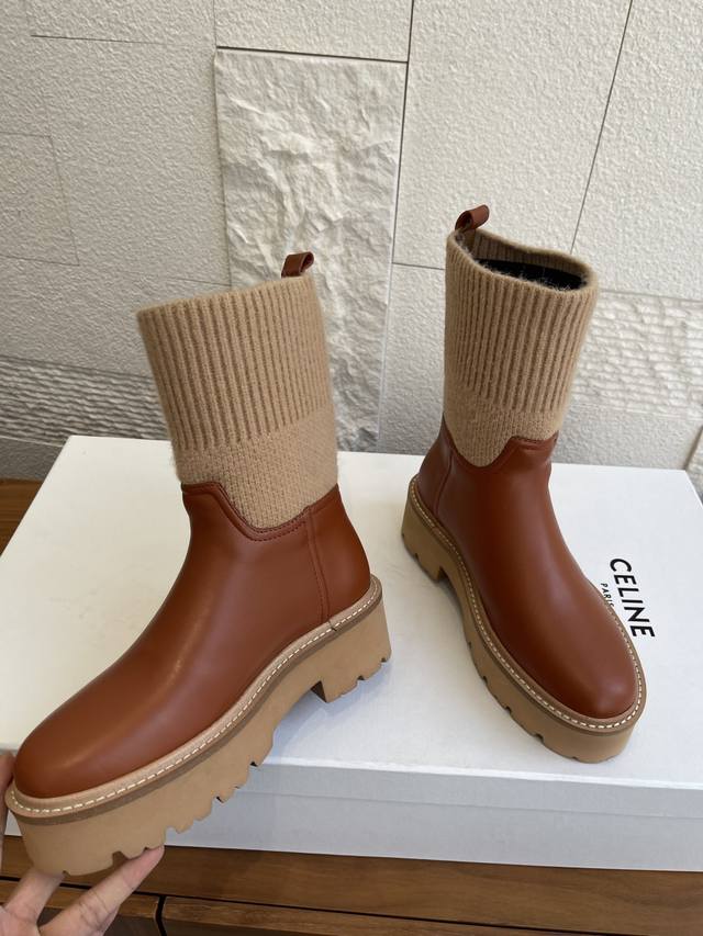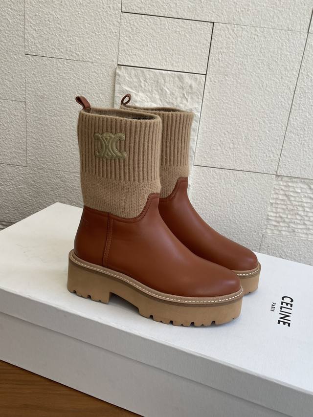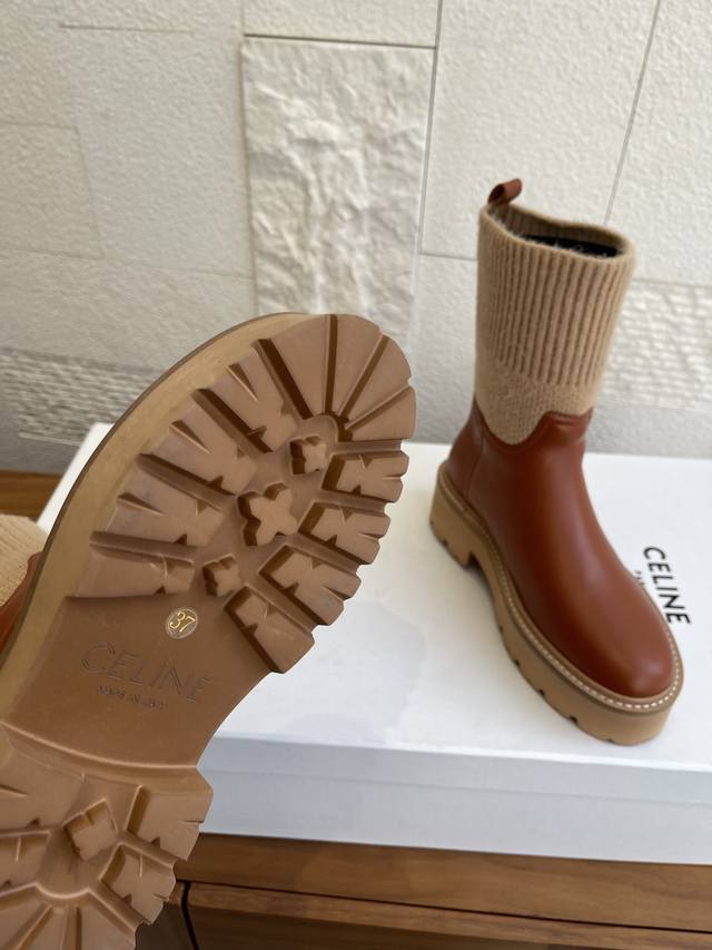 Top Version: Short Boots & Long Boots (Celine 2025 Fall/Winter Round Toe Arc de Triomphe Color Block Knit Sock Boots) This Celine Bulky Buckled series color block boot features custom waxed calfskin and imported knit sock-like cuffs, creating a layered and stylish look! The long boot shaft is adorned with the Arc de Triomphe logo, offering excellent elasticity and resistance to deformation. It boasts a retro British style and pairs beautifully with skirts or skinny jeans, making legs appear slimmer and more fashionable. It features an exclusively developed durable suede leather welt with a multi-layered outsole and a soft, comfortable sheepskin lining, perfect for fall and winter. Material: Imported calfskin knit sock-like cuffs; Lining: Imported sheepskin; Outsole: Original molded foam outsole; Sole thickness: 4.5cm; Size: 35-42 (40, 41, 42 are custom-made and non-refundable).