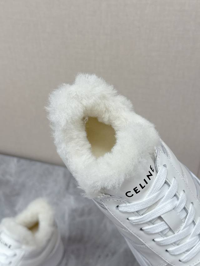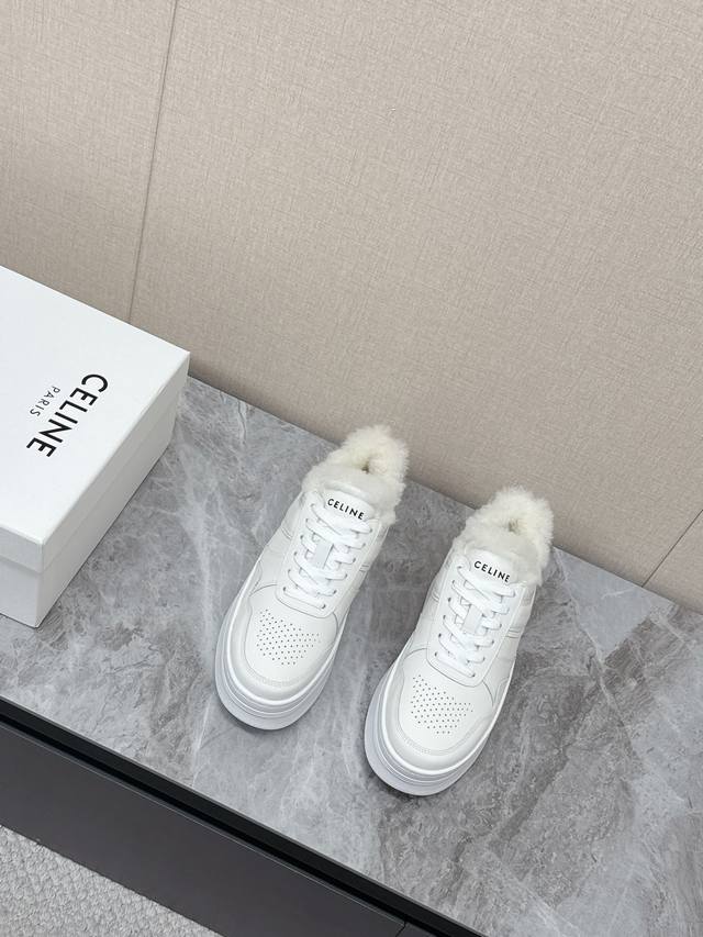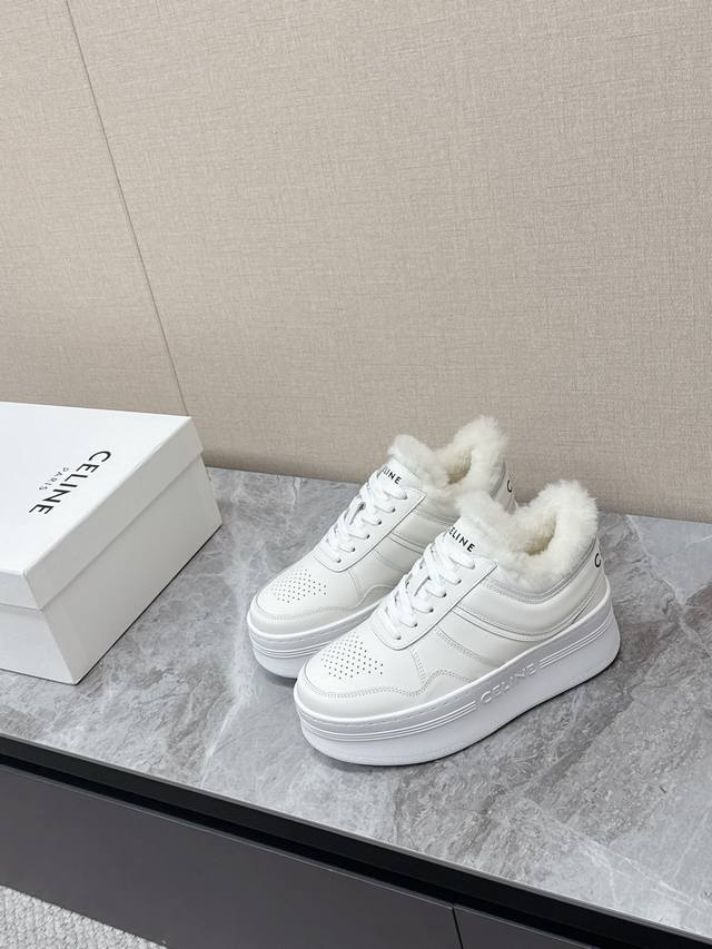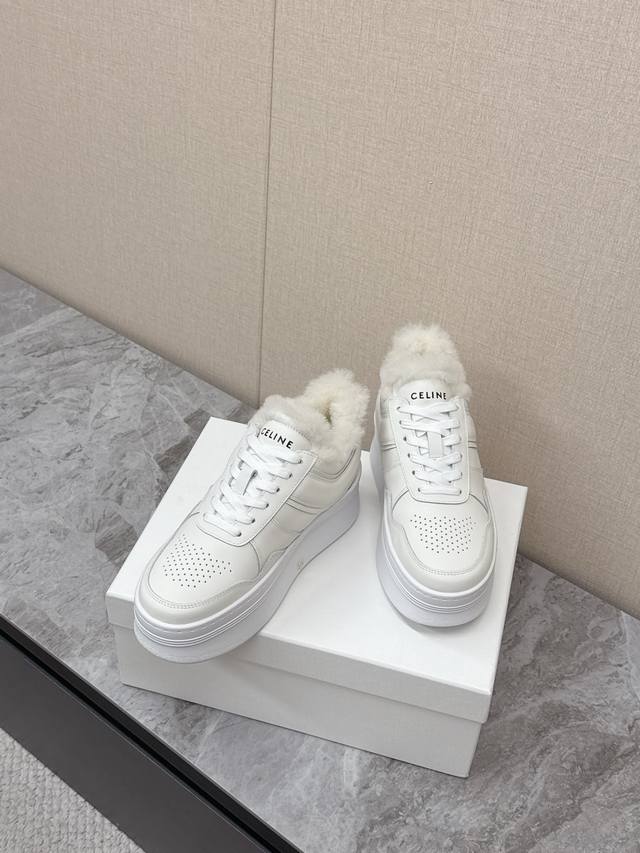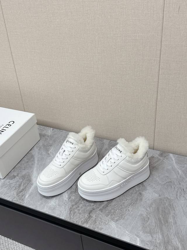 Celine's latest Fall/Winter platform white sneakers, fluffy and casual, are highly recommended by celebrities and influencers. Lisa's style is a premium white sneaker, simple, comfortable, clean, and flattering. They add height and make legs look slimmer. Whether worn alone or paired with wide-leg pants, they offer a high-street yet retro look. Celine girls' upper: top-grain calfskin; lining: genuine wool for extra warmth; outsole: 1:1 replica, custom mold outsole; size: 35-40.