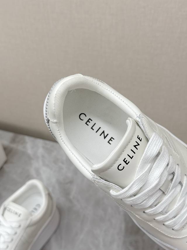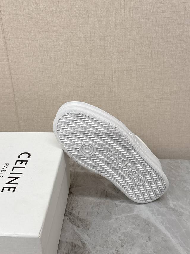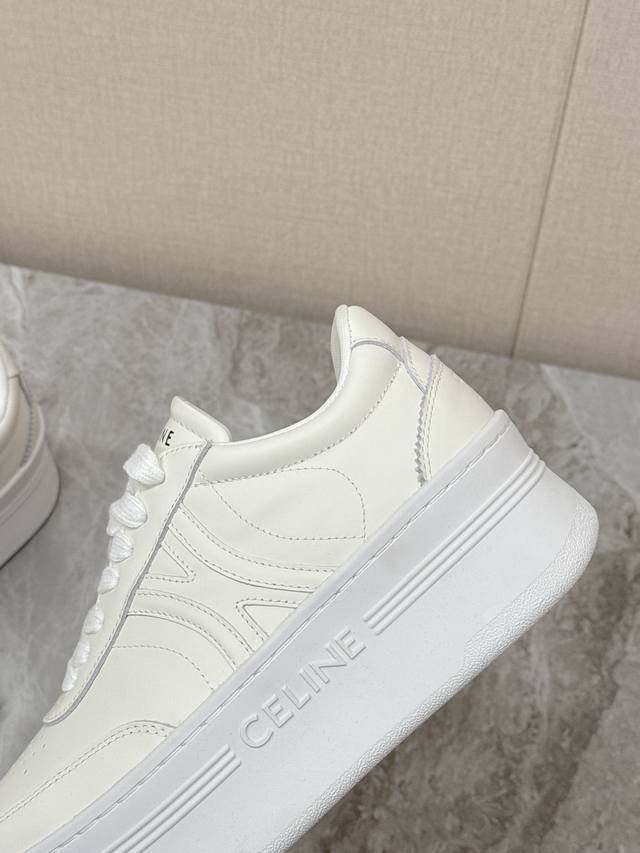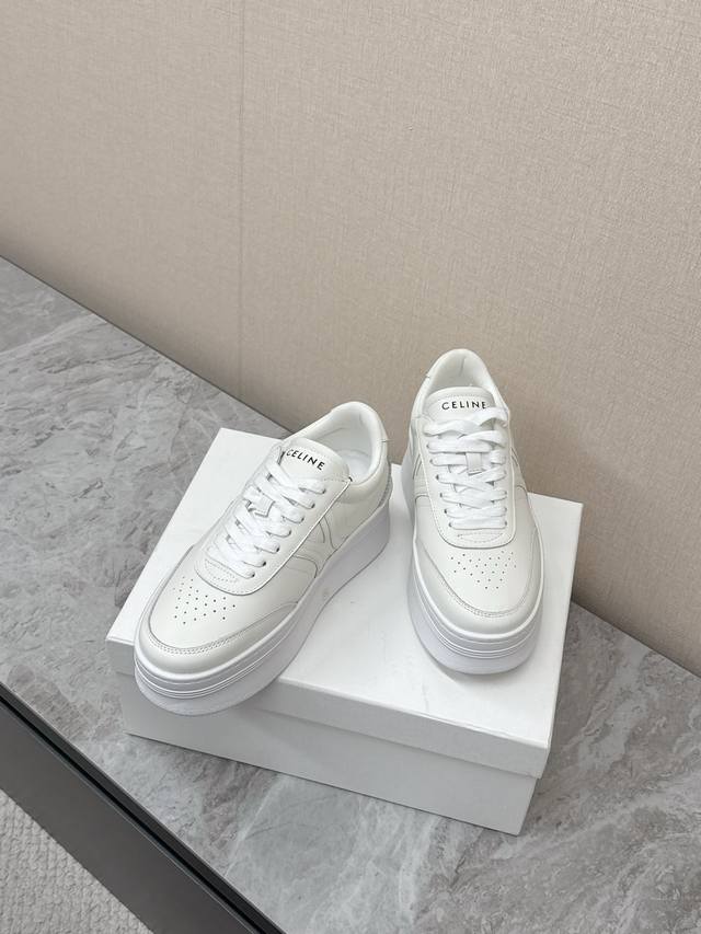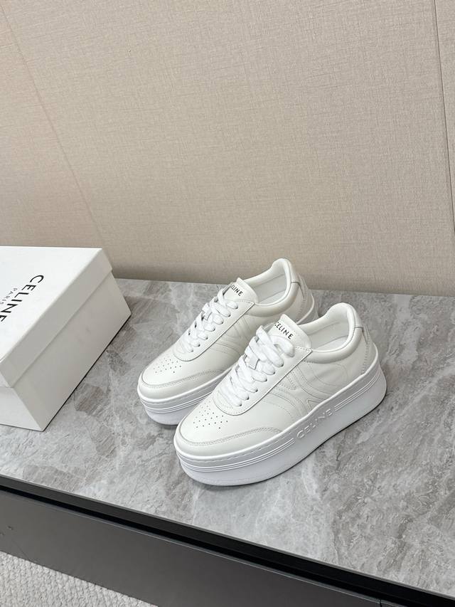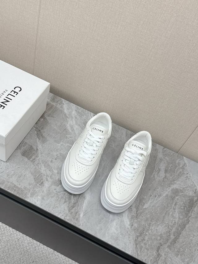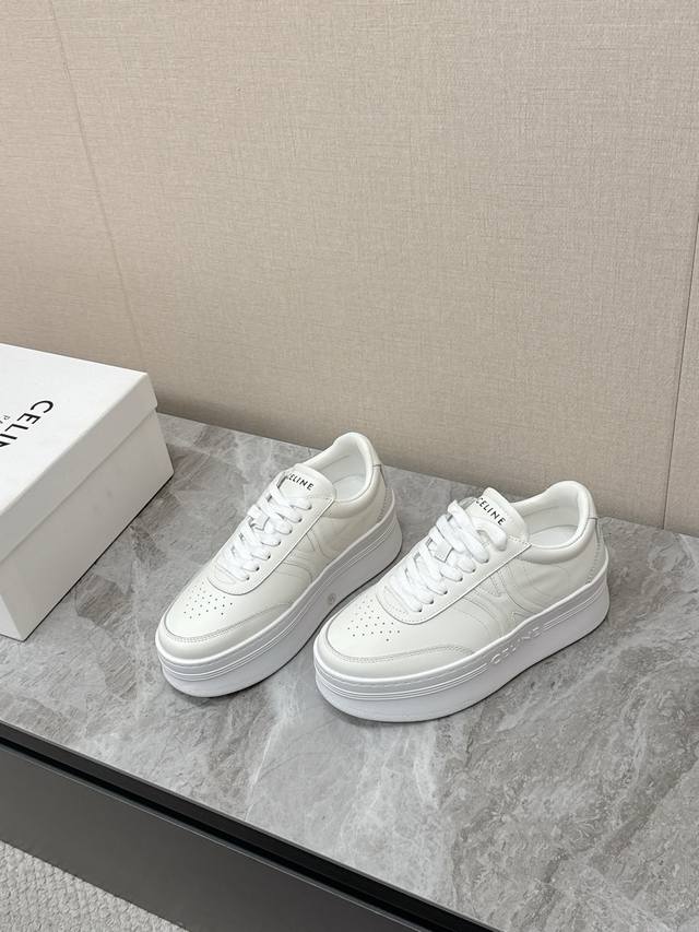 Celine's latest Spring/Summer platform white sneakers are super popular with celebrities and influencers. These white sneakers, as seen on Lisa, have a luxurious style. They're simple, comfortable, clean, and flattering, making legs look slimmer. Whether worn alone or paired with wide-leg pants, they offer a high-street yet retro look. Celine girls' shoes: Upper: Top-grain calfskin; Lining: Imported mesh; Outsole: 1:1 replica, custom mold; Size : 35-4 DDD