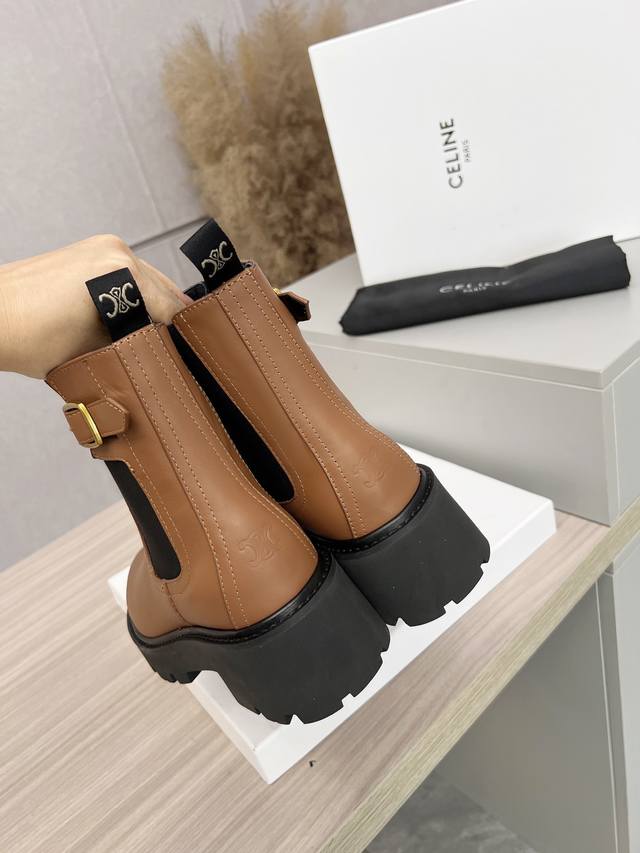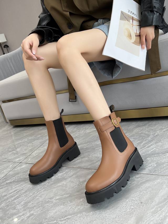 Factory price women's clothing and shoes, original Celine Celine 25 new Arc de Triomphe belt buckle Chelsea chunky heel ankle boots, invincible slimming, height-enhancing, leg-slimming, about 5cm heel height, Napa top layer cowhide leather, sheepskin lining, size 35-41