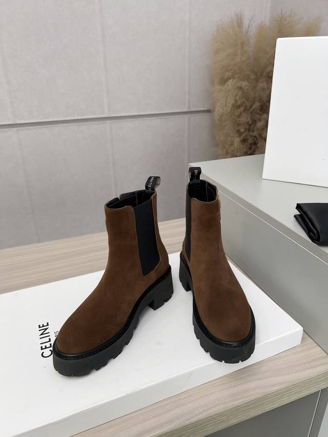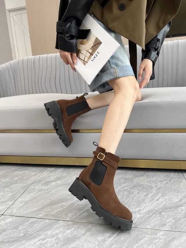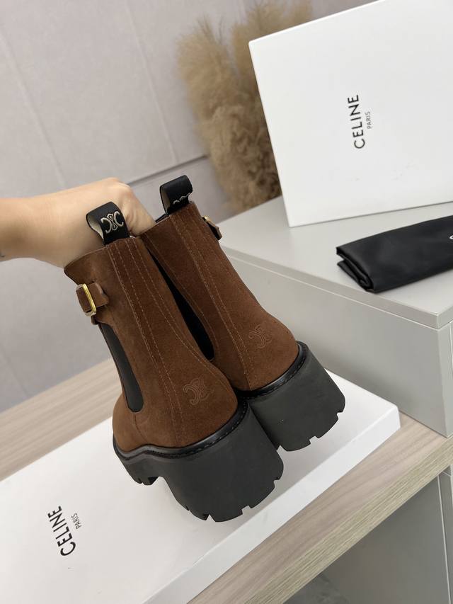 Factory price women's clothing and women's sports shoes original Celine Celine 25 new Arc de Triomphe belt buckle Chelsea block heel ankle boots, invincible slimming height increase, leg slenderization about 5cm heel height, high mercerized cow suede, sheepskin lining, 35-41