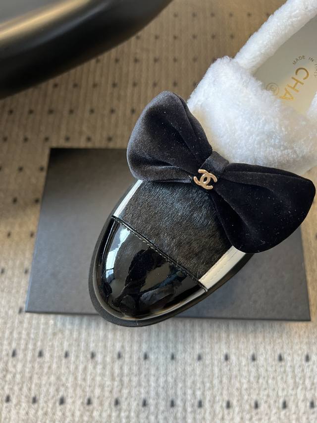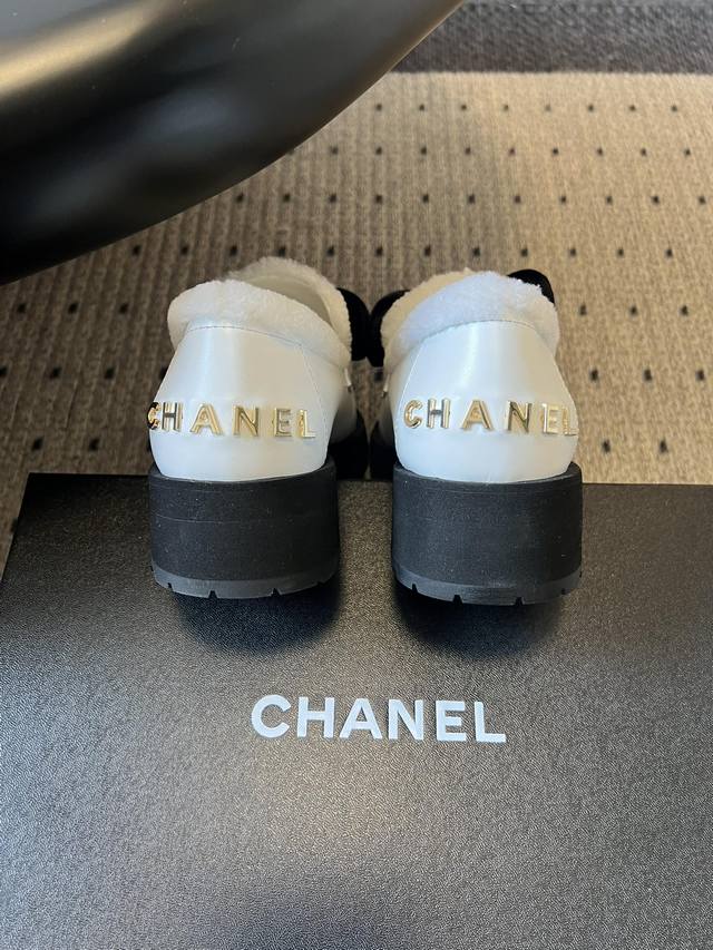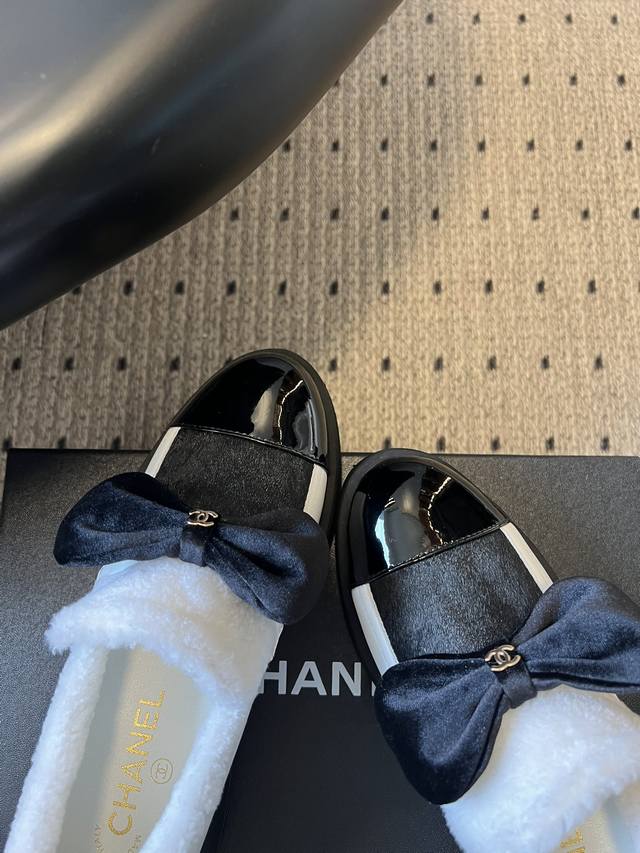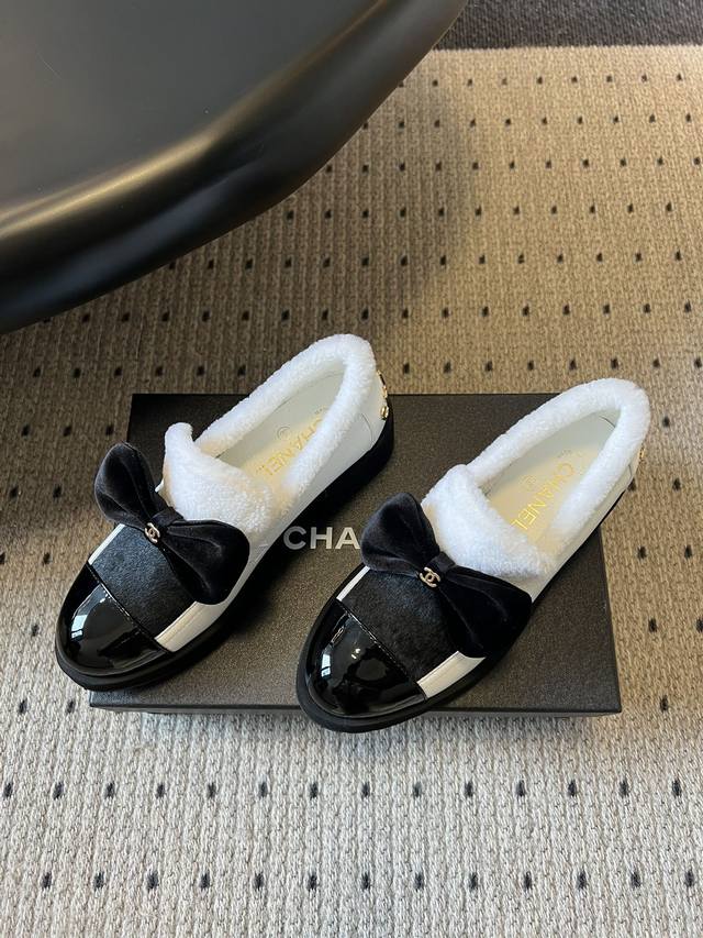 Chane* Bow-Tie Plush Loafers Casual Shoes DDD The upper combines patent leather and horsehair plush materials, with a fleece lining for both texture and warmth; available in black and white, black and gold, and all-black colorways, each with its own style emphasis. DDD The toe is decorated with the iconic black bow and double C metal buckle, a classic Chanel logo, enhancing brand recognition. Featuring a low-top slip-on loafer design with a thick, flat sole, it combines casualness and comfort, making it a stylish and practical autumn/winter shoe. DDD Upper: Wool Ddd Lining: Sheepskin Ddd Outsole: Original mold outsole Ddd Height increase: 3cm Ddd Size: 35-41, sizes 40 and 41 are custom-made and non-refundable DDD