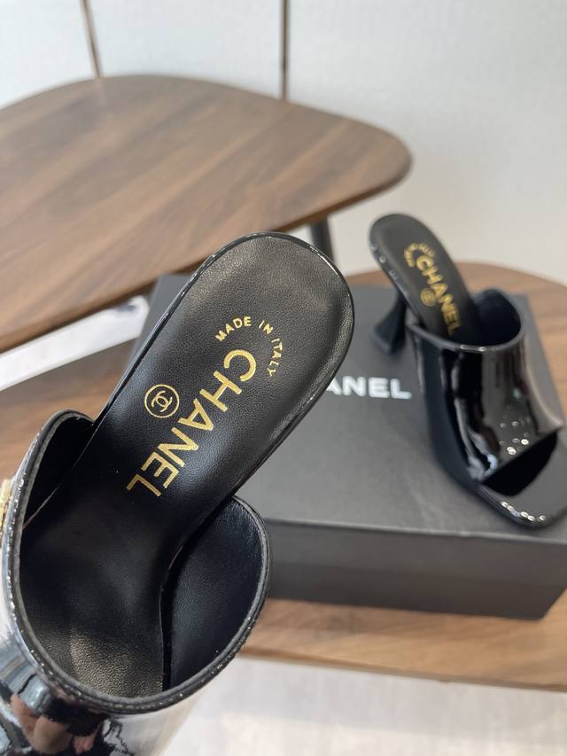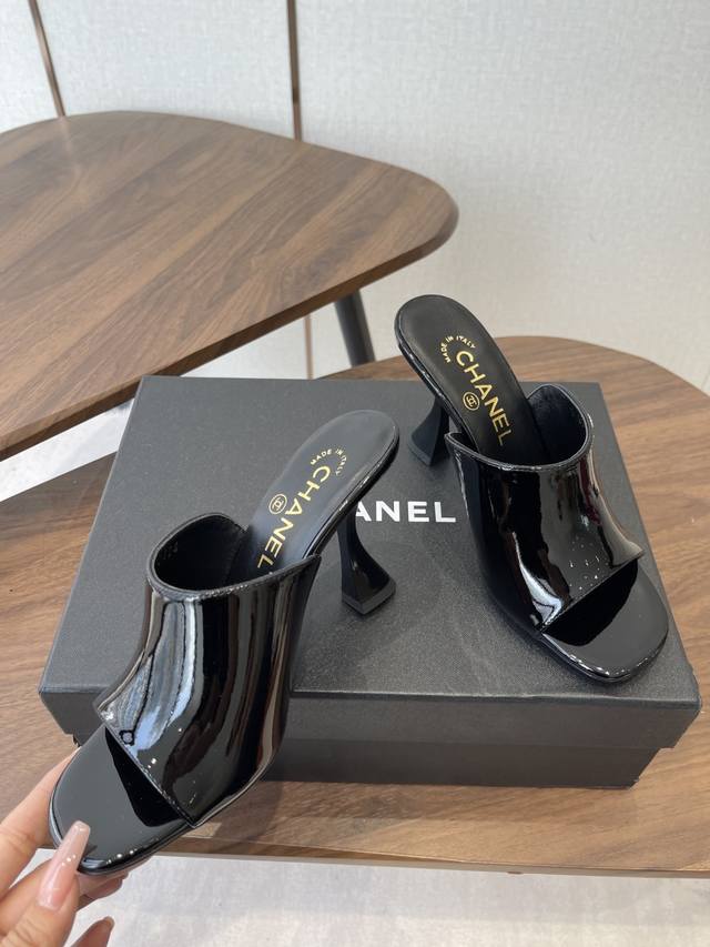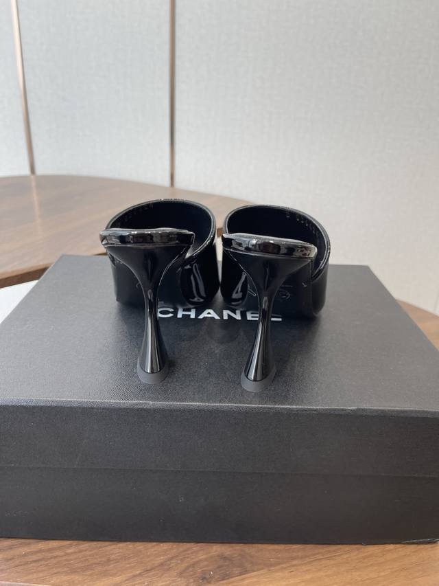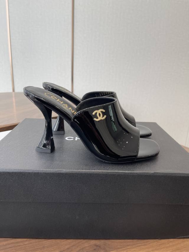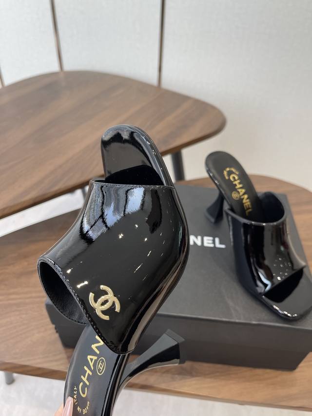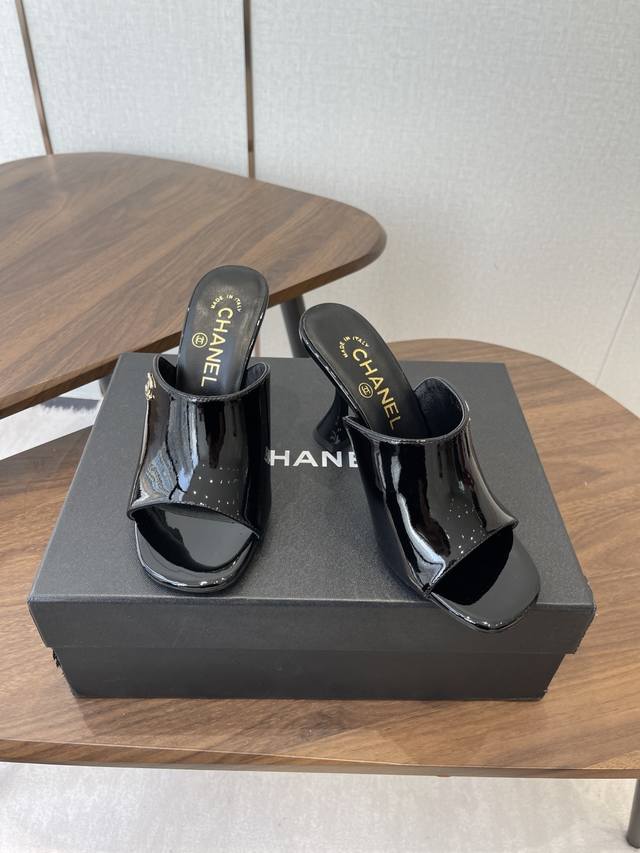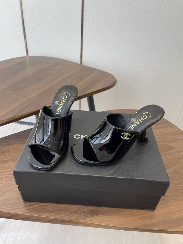 Chanel 2026 Early Spring Resort Collection Hot Item: Double C Buckle Peep Toe Low-Heeled Slippers. Simple and stylish, these mule-style sandals are easy to put on and take off without laces or complicated fastenings, showcasing clean, flowing lines that align with modern fashion aesthetics. The arched heel design enhances the wearer's height and leg line, while also lending an elegant and sexy touch. Upper: Patent Leather; Lining/Insole: Lambskin; Sole: Italian Leather Outsole; Heel Height: 8.5cm; Sizes: 35-39; 40.41: Custom-made, no returns or exchanges.