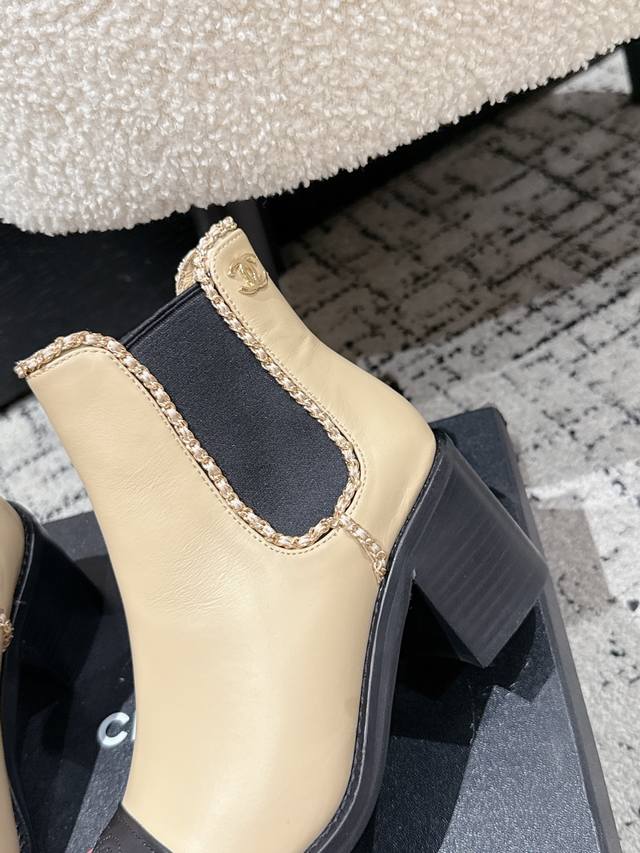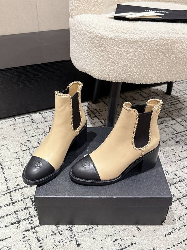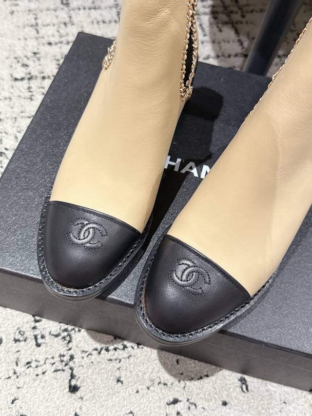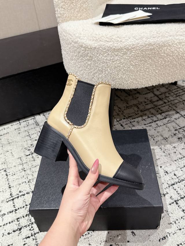 Autumn/Winter New Chanel 25 Classic Color-Blocked Chain Chunky Heel Ankle Boots, Platform Chelsea Boots