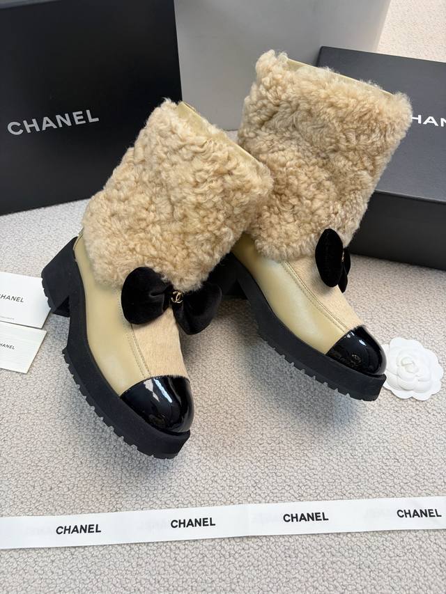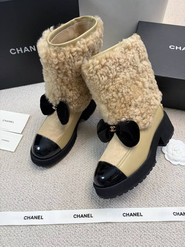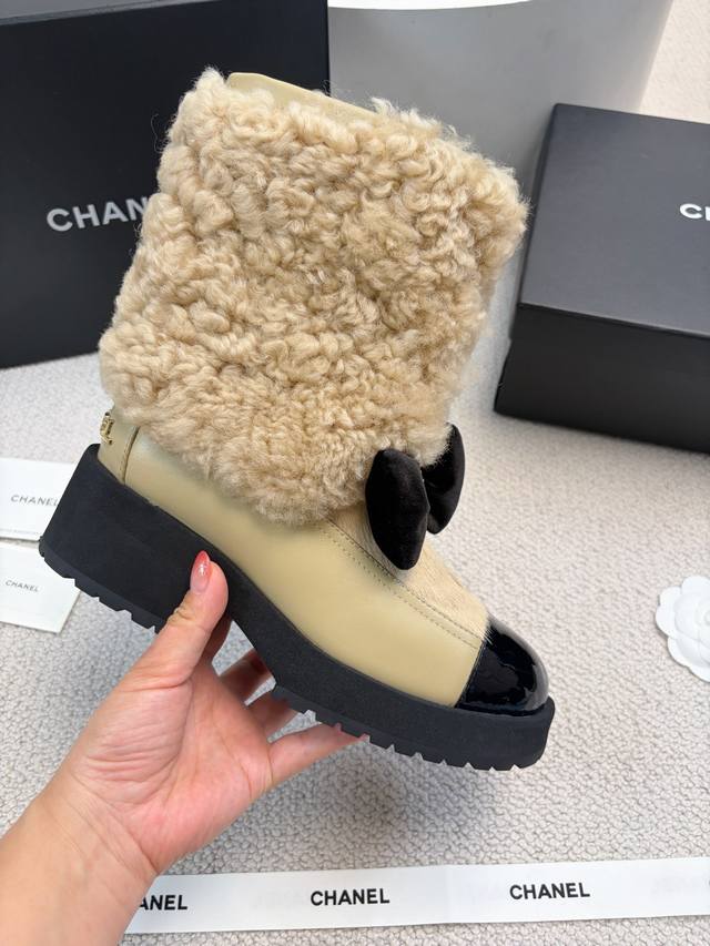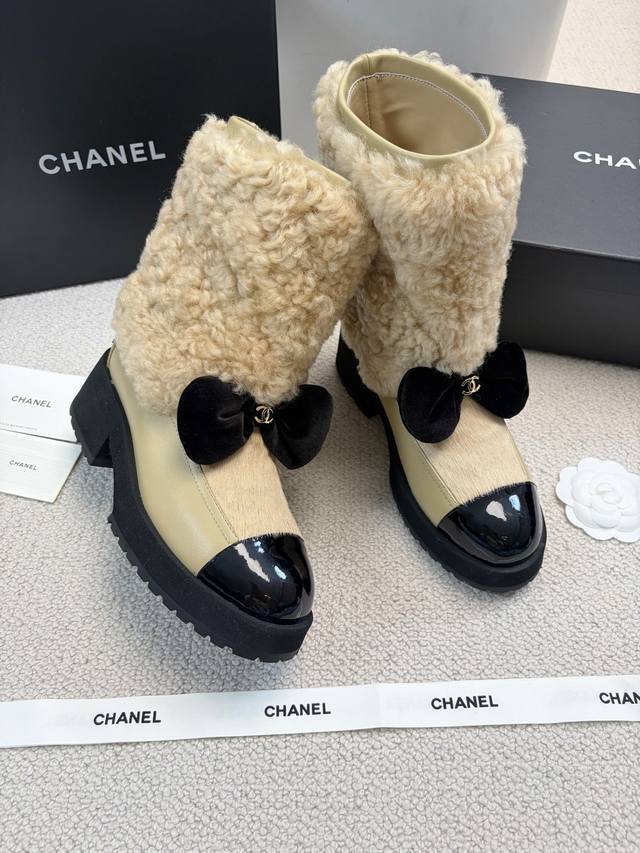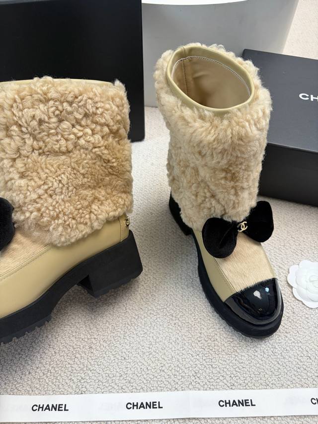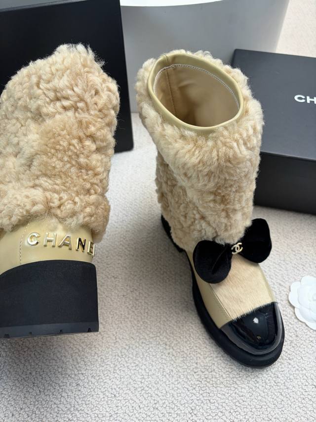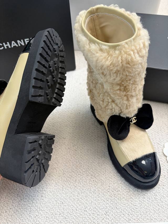Chane* 25Ss Autumn/Winter New Ski Series Mid-Calf Furry Shoes DDD Continuing Chanel's classic "patent leather toe + color blocking" combination, paired with a velvet bow featuring the double C logo, it exudes retro elegance. The shoe body is wrapped in lamb's wool, which is fluffy and soft, offering both a wintery feel and a touch of sophistication. DDD The upper is a combination of lamb's wool and patent leather, and the lining is likely to be fleece-lined for excellent warmth, suitable for the low temperatures of autumn and winter. The patent leather toe is durable and easy to care for, reducing daily wear and tear. Versatile and stylish, they pair well with coats and wool skirts for a sophisticated look, or with jeans and sweatshirts for a casual yet luxurious style, suitable for various autumn and winter outfits. DDD Material: Wool DDD Lining: Sheepskin DDD Outsole: Original mold outsole DDD Heel height: 5cm, shaft height: 18cm DDD Size range: Sizes 35-40, size 40 is custom-made and non-refundable DDD