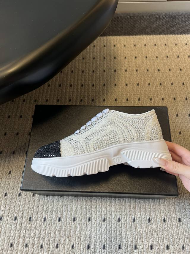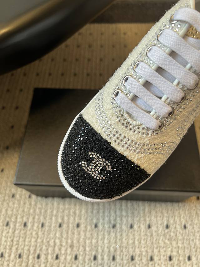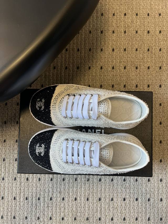 Chane* Platform Rhinestone Color-Blocked Lace-Up Sneakers DDD The upper features a large area of rhinestone inlay, with closely spaced and sparkling rhinestones. The color-blocked sections between the toe and body are meticulously crafted using rhinestones. Continuing the brand's classic black and white color-blocking style, two versions are available: "white body with black toe" and "black toe with white body." A double-C metal logo is subtly placed on the toe, highlighting the brand identity. DDD The classic low-top sneaker silhouette is simple and clean, with a rounded toe for a comfortable fit, balancing everyday comfort and versatility. Combining the casualness of sneakers with the luxury of rhinestones, it blurs the lines between accessible luxury accessories and casual footwear, suitable for both everyday wear and sophisticated looks. DDD Upper: Cowhide Ddd Lining: Sheepskin Ddd Outsole: Original molded outsole Ddd Height increase: 5cm Ddd Size: 35-40, size 40 is custom-made and non-refundable DDD