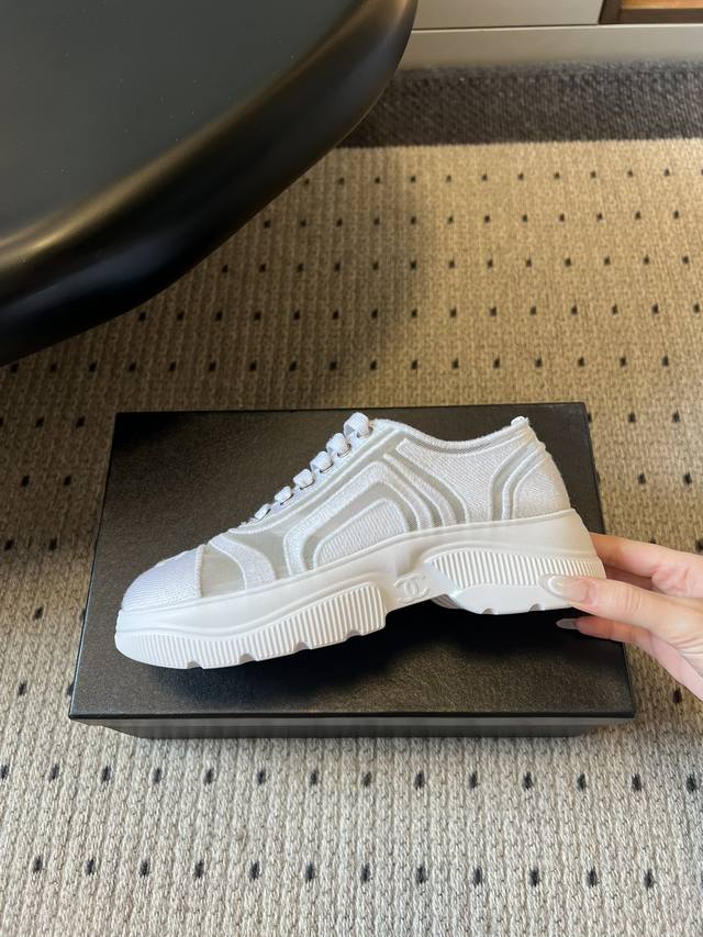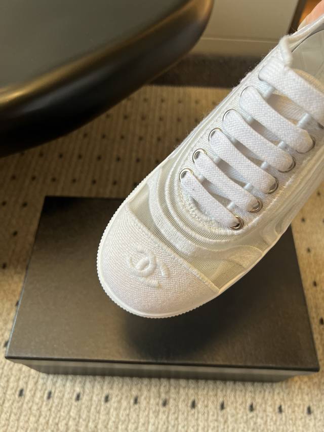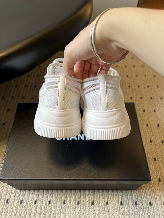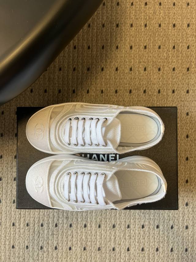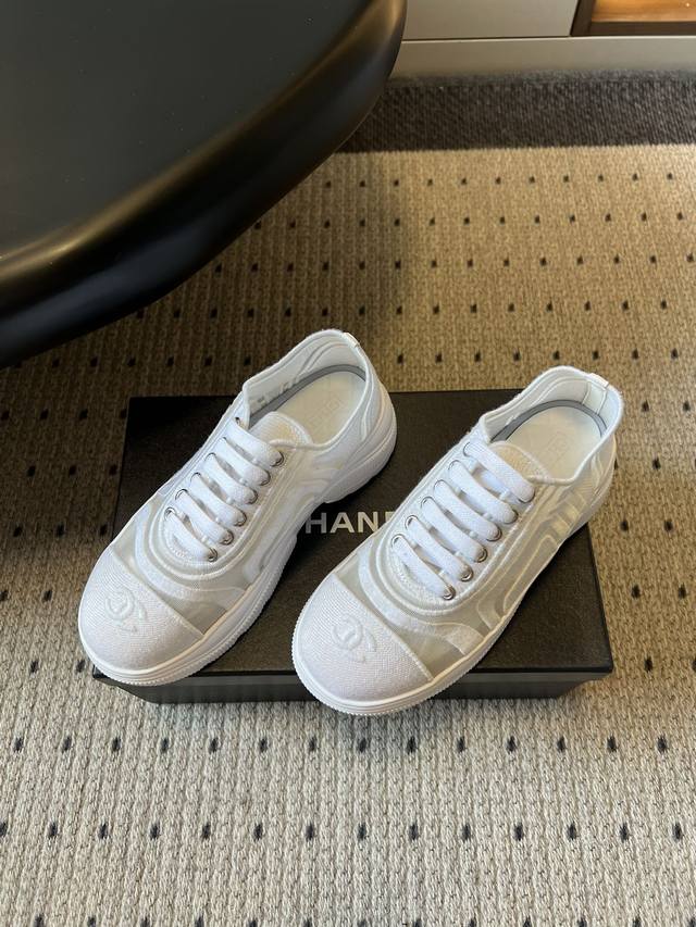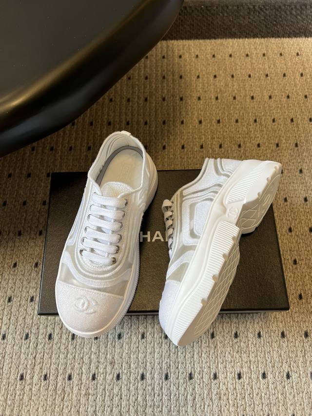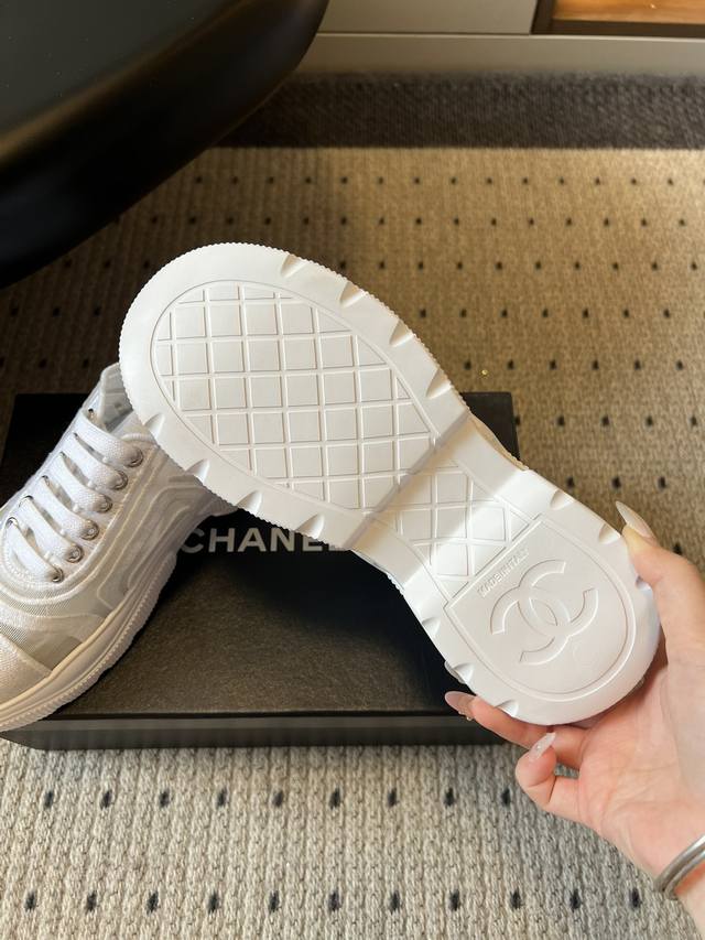 Chane* Thick-soled Breathable Color-blocked Canvas Sneakers DDD Featuring Chanel's classic double-C embroidered logo at the toe, these shoes are highly recognizable. The simple lace-up design and rounded toe shape combine a casual feel with the brand's classic aesthetic. Available in pure white, black and white colorways, they are versatile and match the brand's minimalist luxury style. DDD The upper and outsole are connected by hand-stitched seams, with smooth and neat stitching and meticulous attention to detail. The insole is thickened, not only improving comfort but also providing a slight height increase. DDD Upper: Fabric mesh Ddd Lining: Sheepskin Ddd Outsole: Original molded outsole Ddd Height increase: 4cm Ddd Size: 35-40, size 40 is custom-made and non-refundable DDD