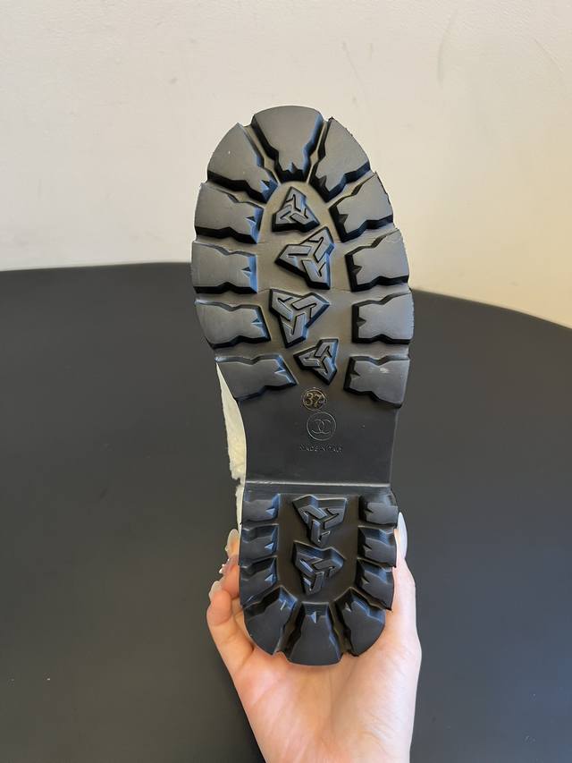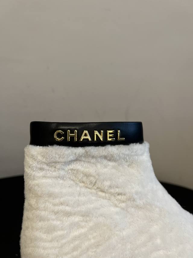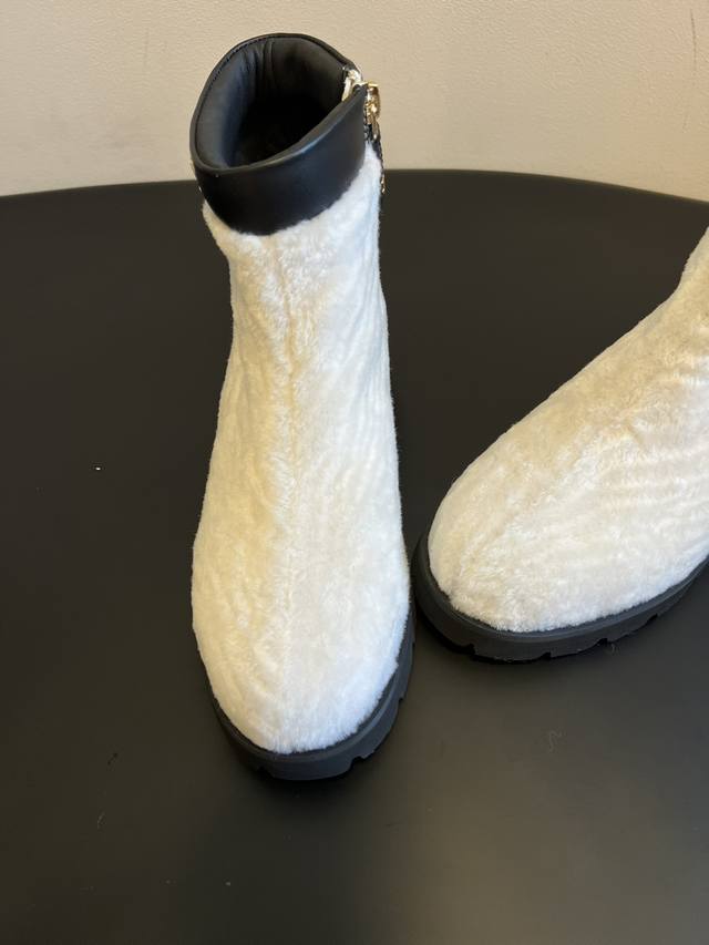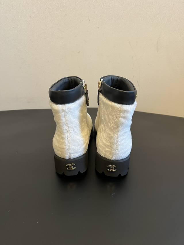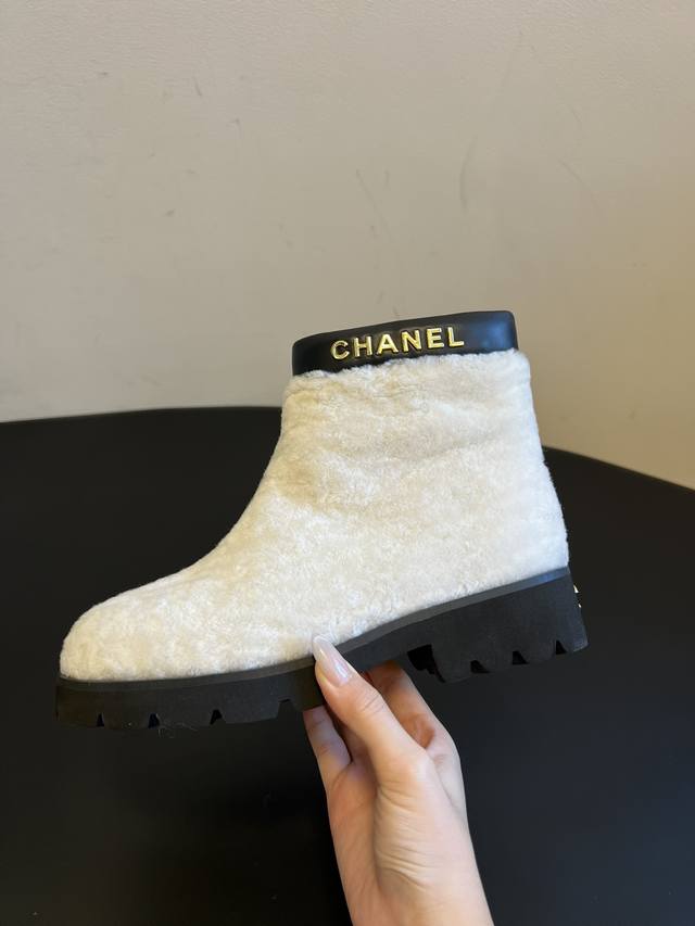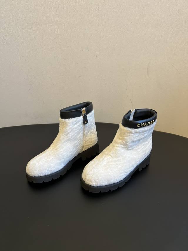 Chane*25Ss Autumn/Winter Sweet Luxury Warm Plush Ankle Boots DDD The boot opening features calfskin trim and a gold "Chanel" logo, paired with a thick rubber outsole. This combination provides brand recognition while balancing the soft, cute feel of the plush boots, achieving a perfect sweet and cool look. DDD The ankle boot shape and 3.5cm thick sole provide height and make legs appear slimmer. A concealed side zipper and trim at the boot opening ensure easy on and off without deformation. The rubber outsole is also slip-resistant and durable. Available in white for a fresh and gentle look, and black for a cool and versatile style. Perfect for pairing with coats, down jackets, knit dresses, and other autumn/winter outfits, these are high-end autumn/winter boots that are "warm without being bulky and stylish." DDD Material: Wool Ddd Lining: Sheepskin Ddd Outsole: Original molded outsole Ddd Height Increase: 4cm Ddd Size: Sizes 35-41, size 40 is custom-made and non-refundable DDD