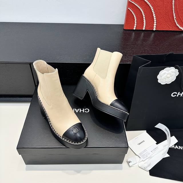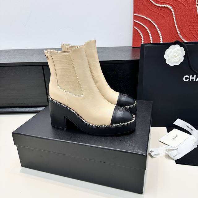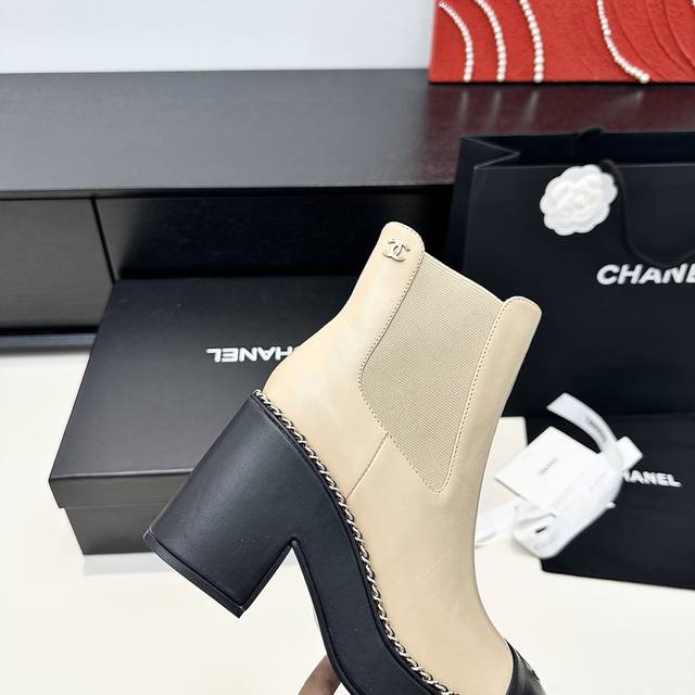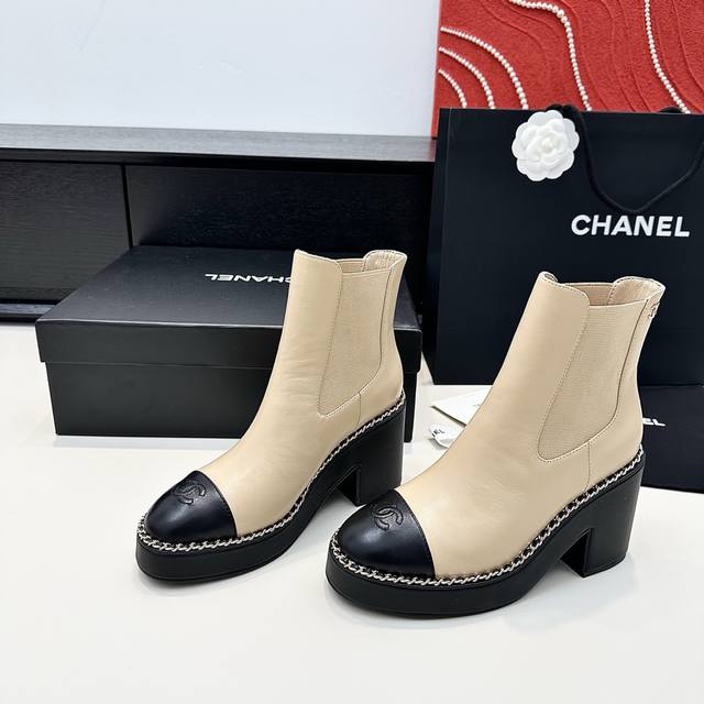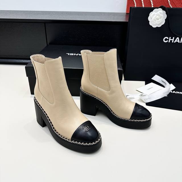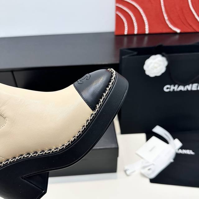 Chanel 2025 Early Autumn New Style Chunky Heel Color Block Chain Ankle Boots Upp