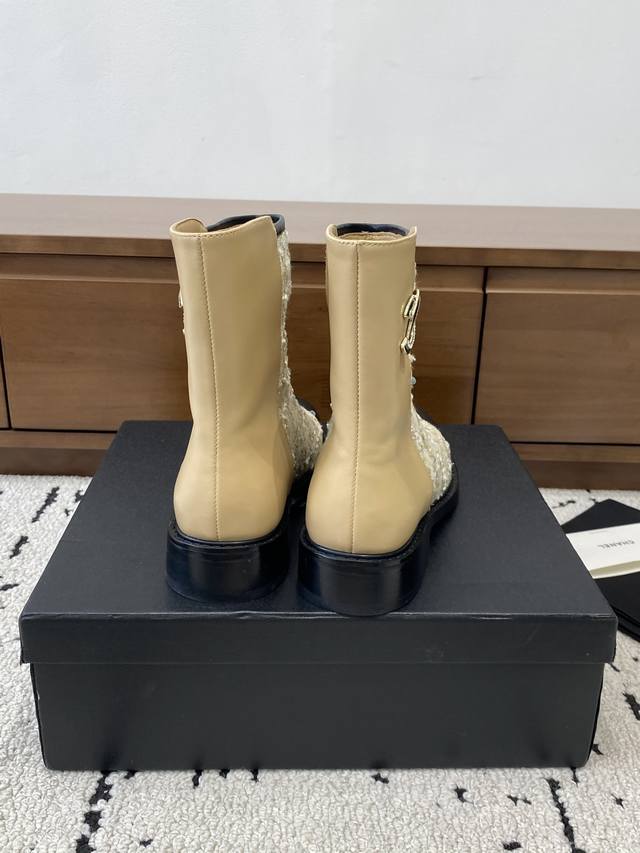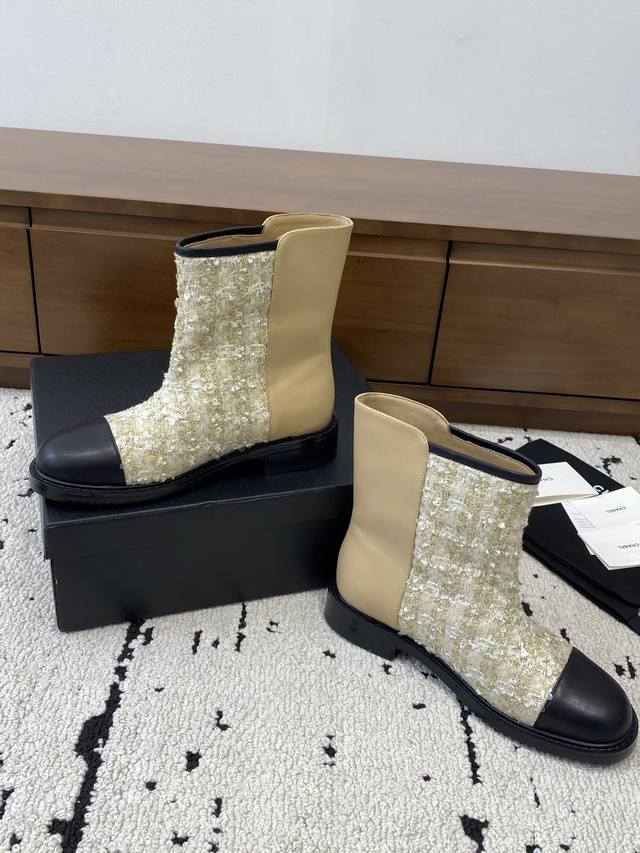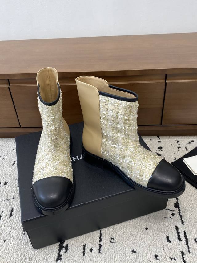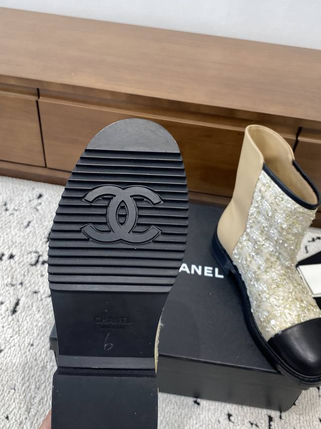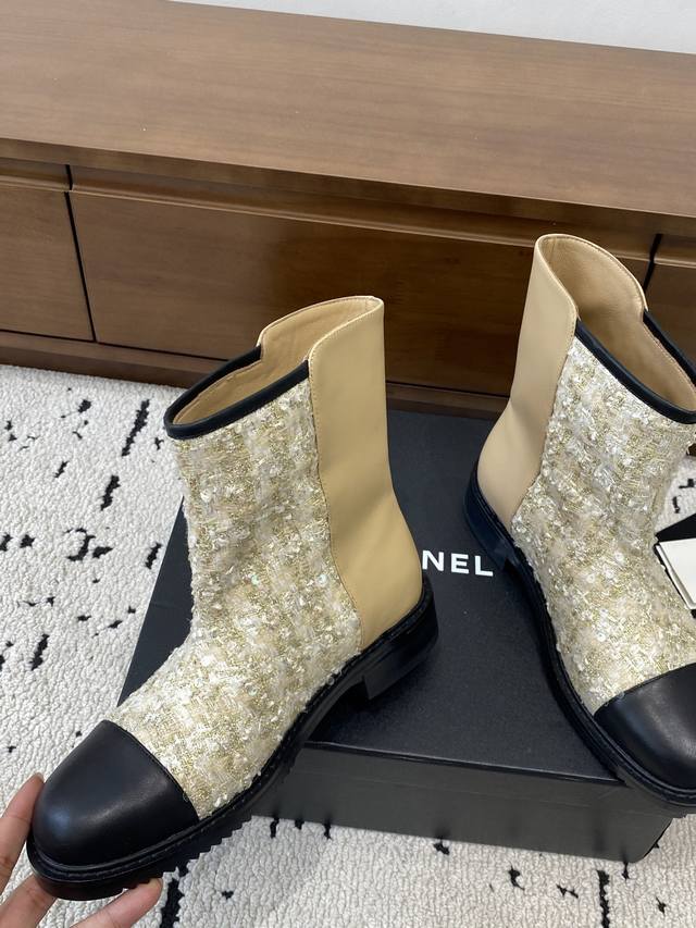 Chanel 2025 Fall/Winter Collection Strappy Openwork Embroidered Ankle Boots. The upper features classic brogue embroidery, and the boot shaft follows Chanel's classic design. I especially love them! This is a hot item Chanel created for this fall/winter season. They're easy to wear, super comfortable, and a must-have for this fall/winter! Upper material: Cowhide + special materials. Outsole: Rubber. Sizes: 35-40. Sizes 40 and 41 are custom-made, no returns or exchanges.