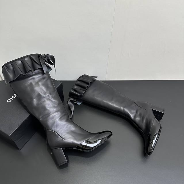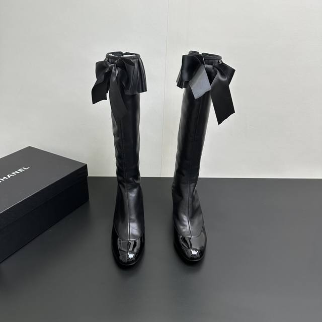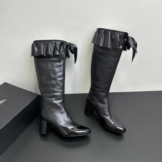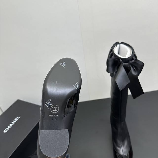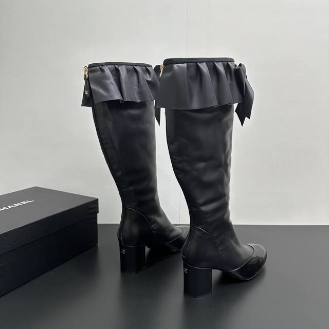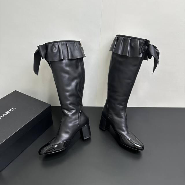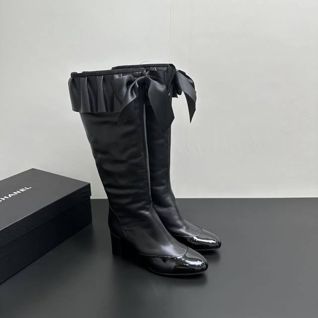 ) When classic Chanel aesthetics collide with trendy footwear design, these pleated bow-knot elastic boots are born, instantly becoming the dream boots of fashionistas. The iconic, exquisite bow adorns the center of the boot, its elegant satin bow paired with delicate metal buckles that shimmer in the sunlight, perfectly embodying the brand's elegant romance. Every step is the focus of attention. The pleated opening is the crowning touch of these boots; the layers of pleats, like gently surging waves, create a three-dimensional effect, effortlessly adding a touch of romance and casualness to the overall look.