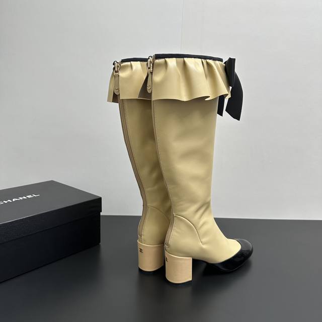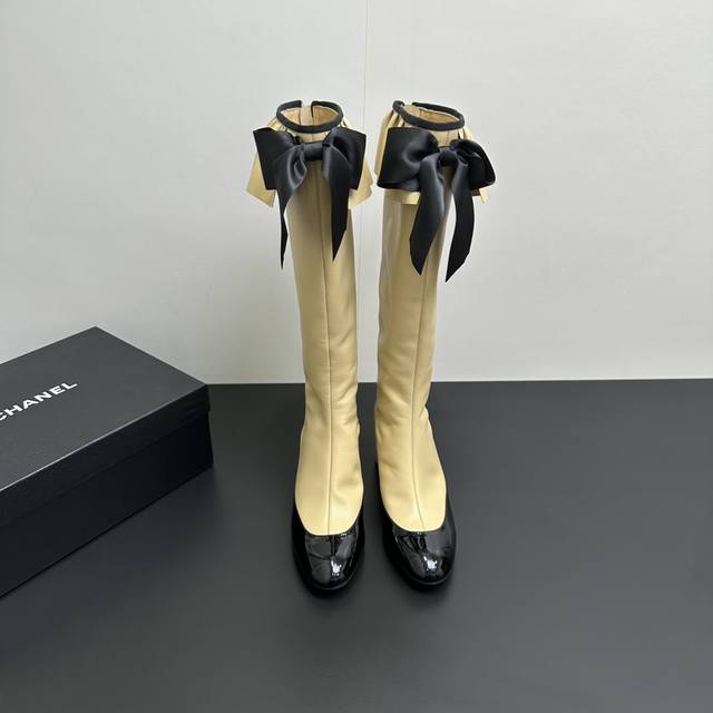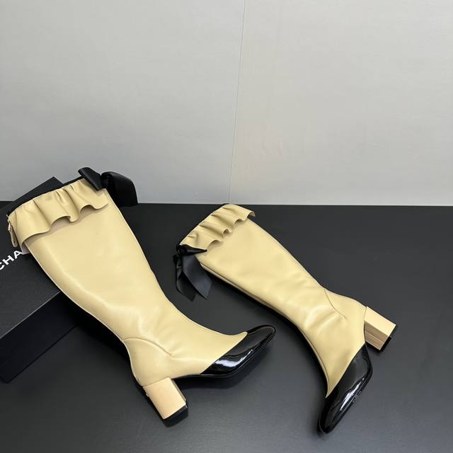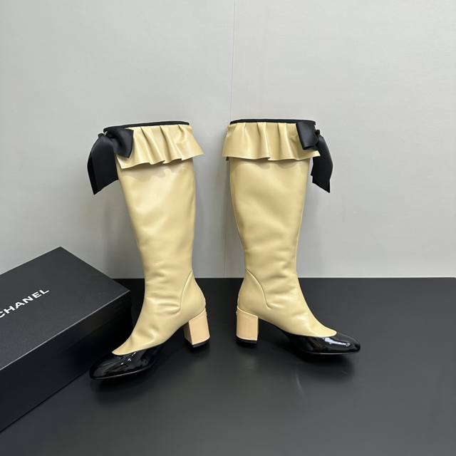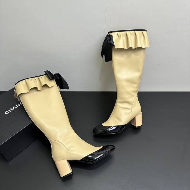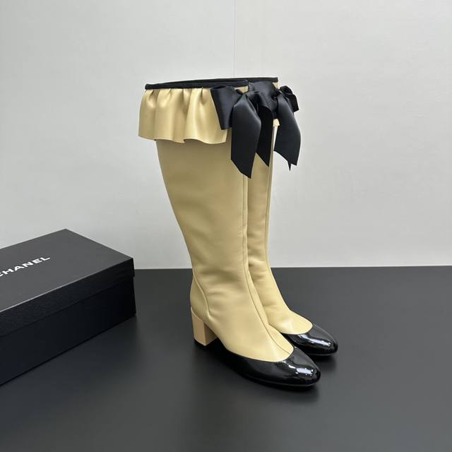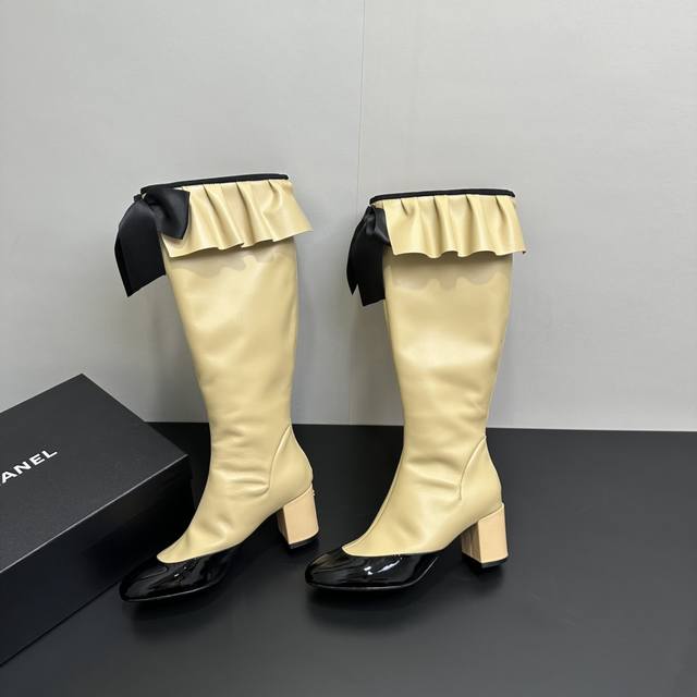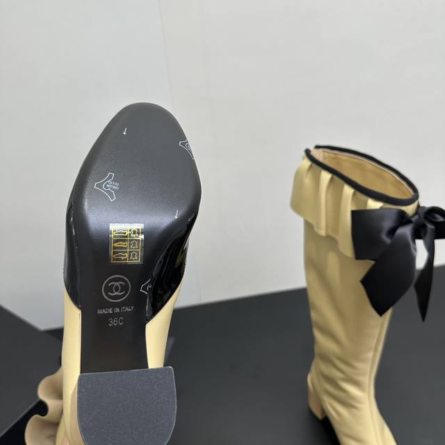 ) When classic Chanel aesthetics collide with trendy footwear design, these pleated bow-knot elastic boots are born, instantly becoming the dream boots of fashionistas. The iconic, exquisite bow adorns the center of the boot, its elegant satin bow paired with delicate metal buckles that shimmer in the sunlight, perfectly embodying the brand's elegant romance. Every step is the focus of attention. The pleated opening is the crowning touch of these boots; the layers of pleats, like gently surging waves, create a three-dimensional effect, effortlessly adding a touch of romance and casualness to the overall look.