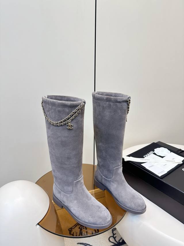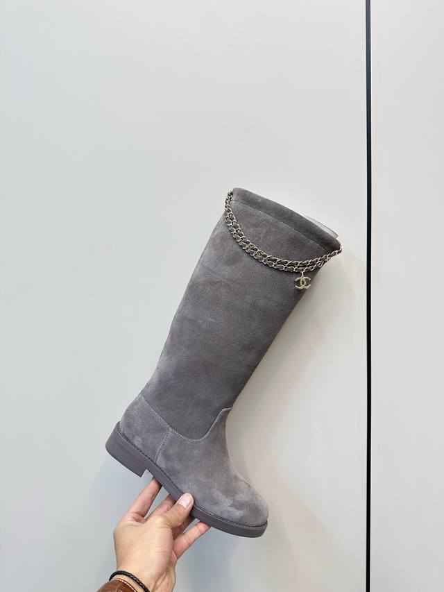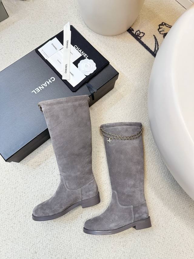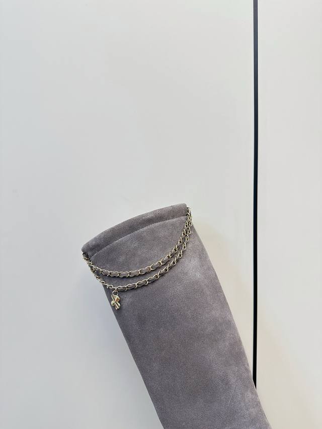 Chanel 25B Clover Chain Suede Riding Boots (Long Boots) Chanel 25B chain suede ankle boots feature a four-leaf clover metal chain embellishment and the classic double C logo for easy identification. The round toe and chunky heel design offer comfort and style, perfect for autumn and winter wear! The full sheepskin lining is soft and comfortable, ensuring long-lasting wear. The chain detail adds a retro-modern touch, easily complementing jeans and skirts, allowing you to switch between elegant and cool looks effortlessly. Suitable for everyday commuting and casual occasions, practical and enhancing your style. Upper: Deerskin/Calfskin Lining: Sheepskin Sizes: 35-40 40.41 Custom Made