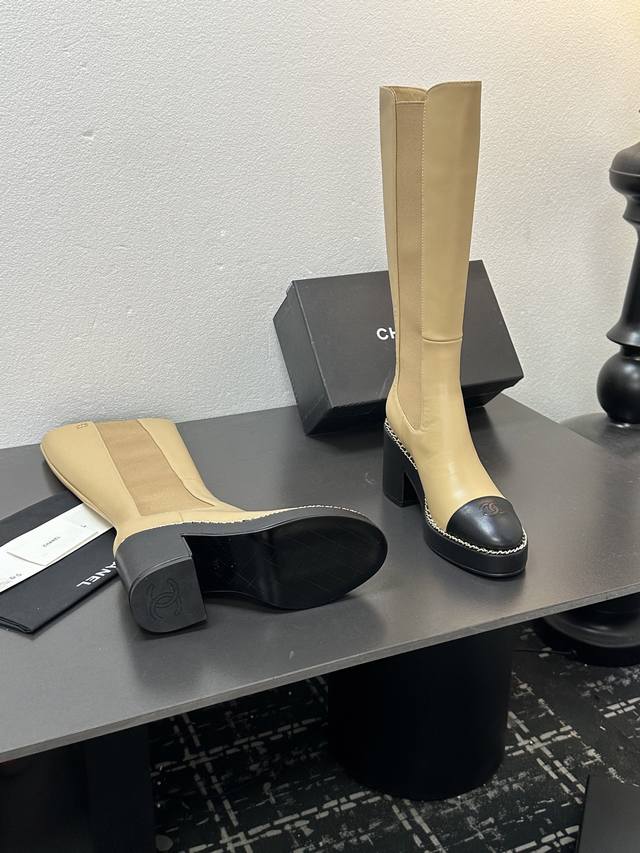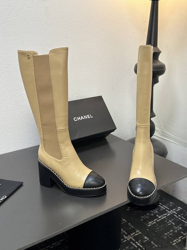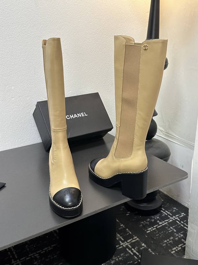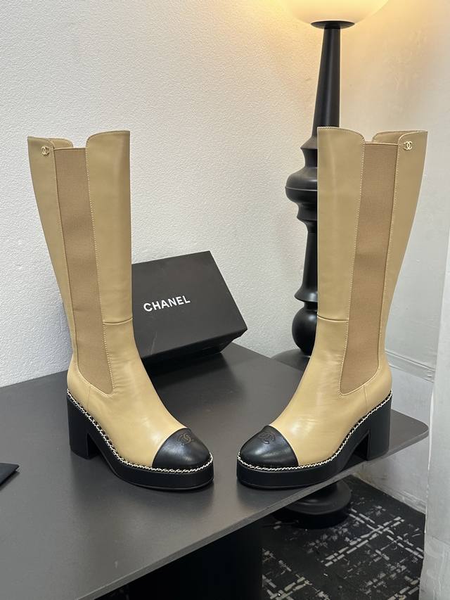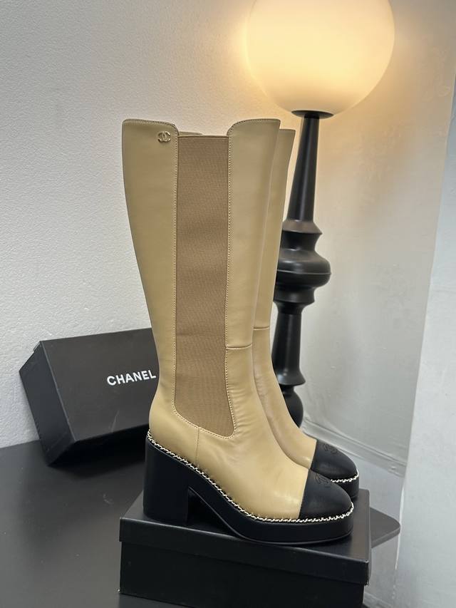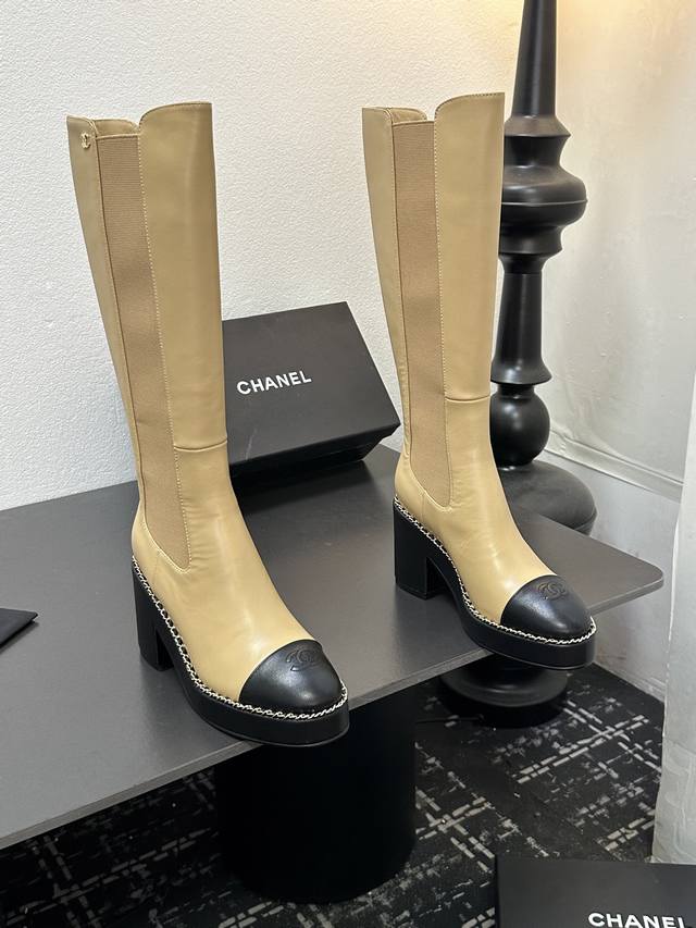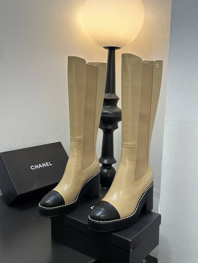 Chanel 25K New Chelsea Elastic Band Long Boots, Platform Chain High Boots, Autumn/Winter Runway Style , Super Flattering and Versatile, Easy for Any Girl to Wear. Imported calfskin leather, suede upper, sheepskin lining, original mold, wear-resistant rubber sole. Size: 35-39, 40, 41 (Made to order, no returns or exchanges).