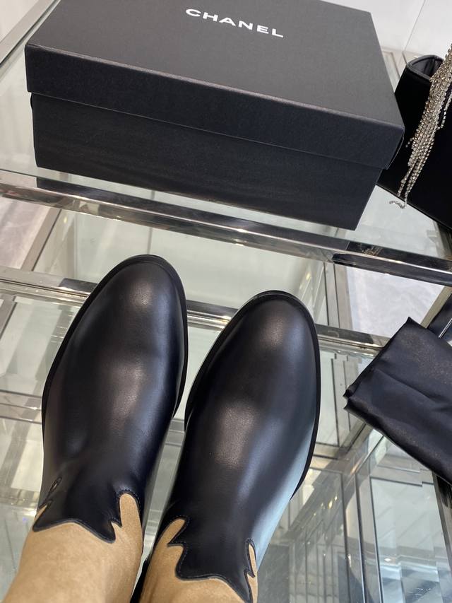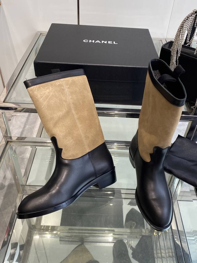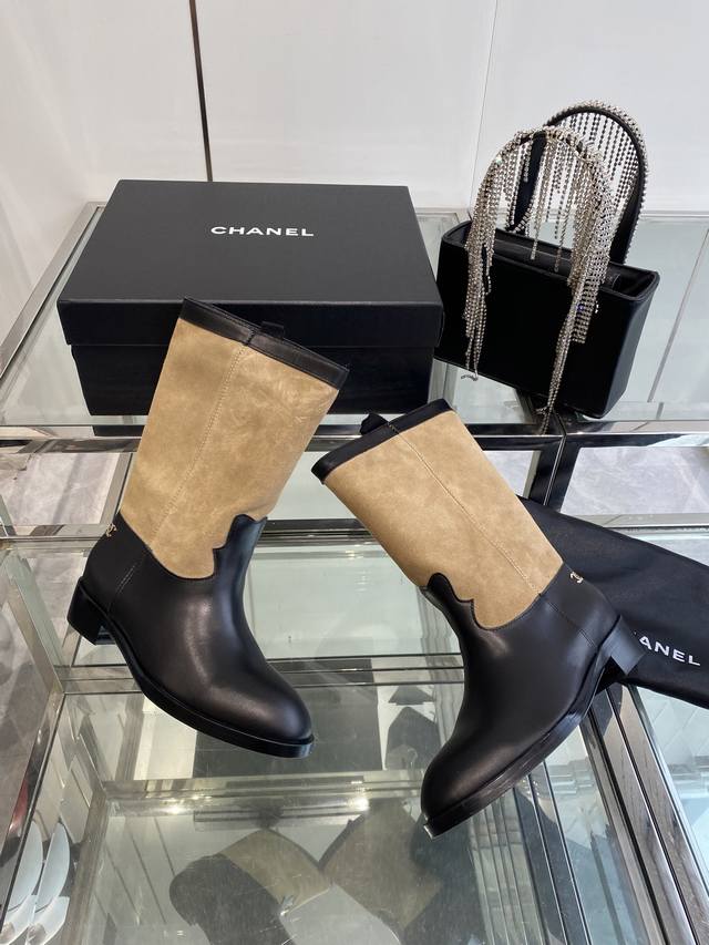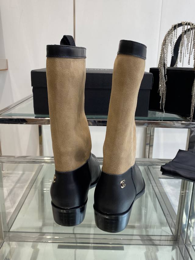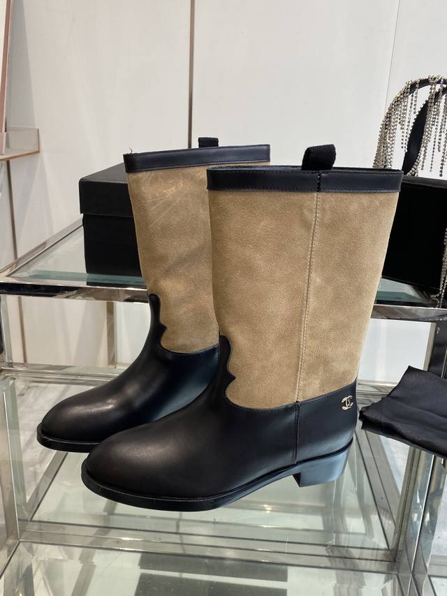 Chanel 25Ss Autumn/Winter New Style Suede Color-Block Slip-On Riding Boots, Retro Western Cowboy Boots. The unique western boot shaft design features smooth curves and irregular edges, reminiscent of free-flowing lines in the wilderness, exuding a casual and unrestrained feel, allowing every step to showcase both freedom and sophistication. Whether paired with tailored suit trousers for a cool urban look or with a flowing dress for a harmonious blend of strength and softness, the upper is made of top-grain cowhide combined with suede. The insole is made of water-dyed cowhide. Sizes: 35-41. 40.41 is custom-made.