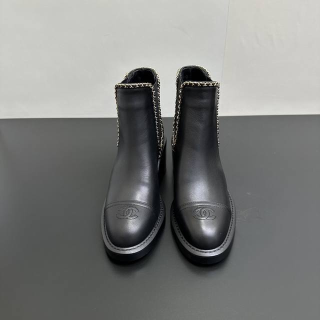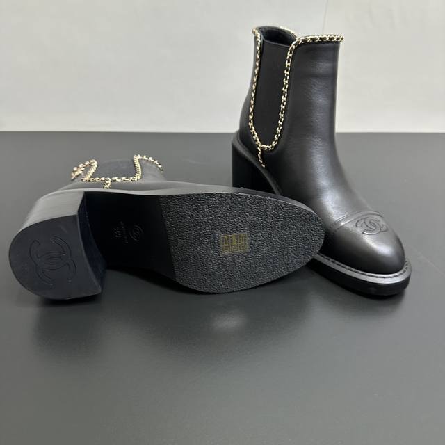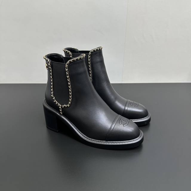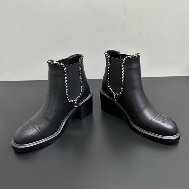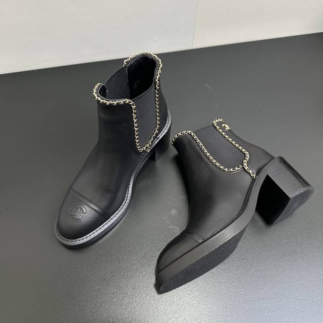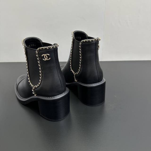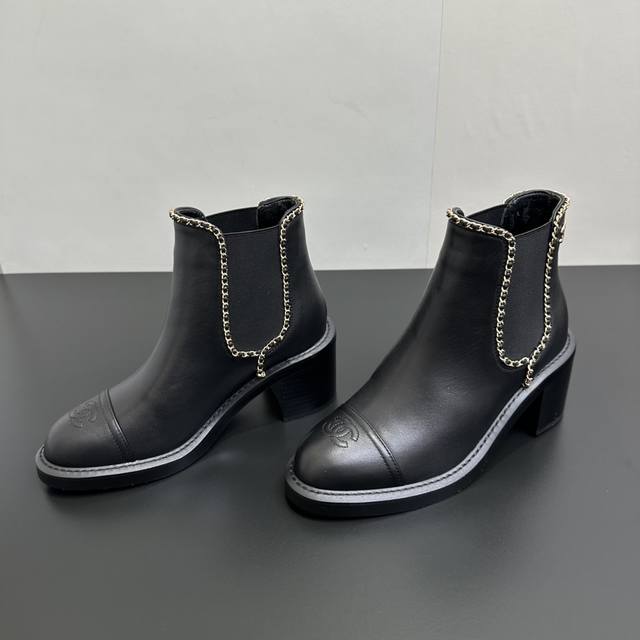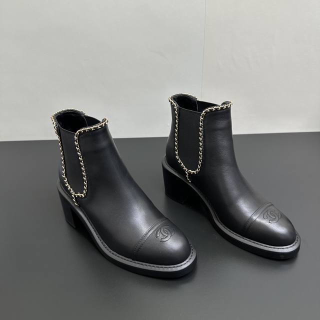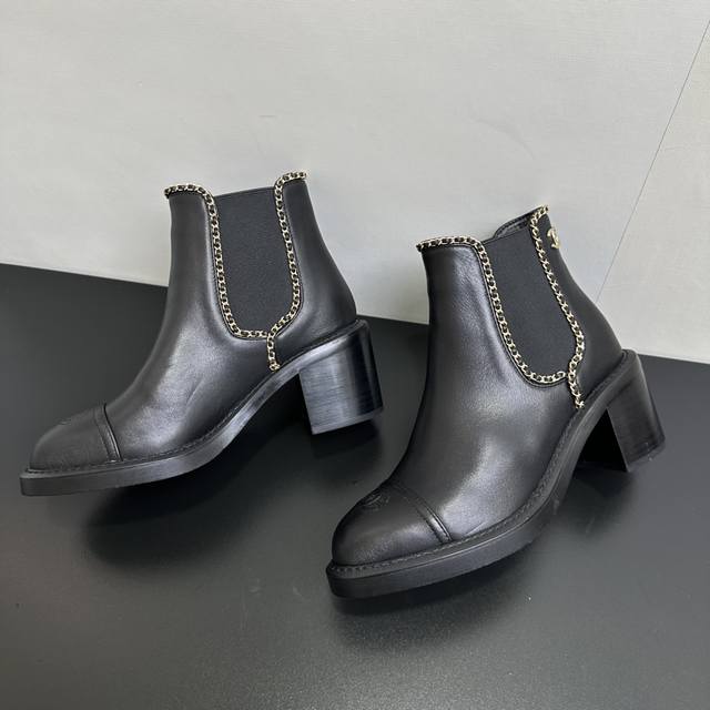 Chanel 25Ss New Autumn/Winter High-Heeled Chain Elastic Ankle Boots, Versatile and Slim Fit. Three-dimensional and full shape, comfortable and stylish on the foot. Easy slip-on design with classic chain hardware for a sophisticated and elegant look. Upper: Lambskin. Lining: Lambskin. Size: 35-39, 40-41 (pre-order).
