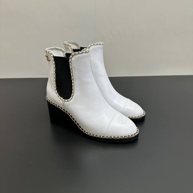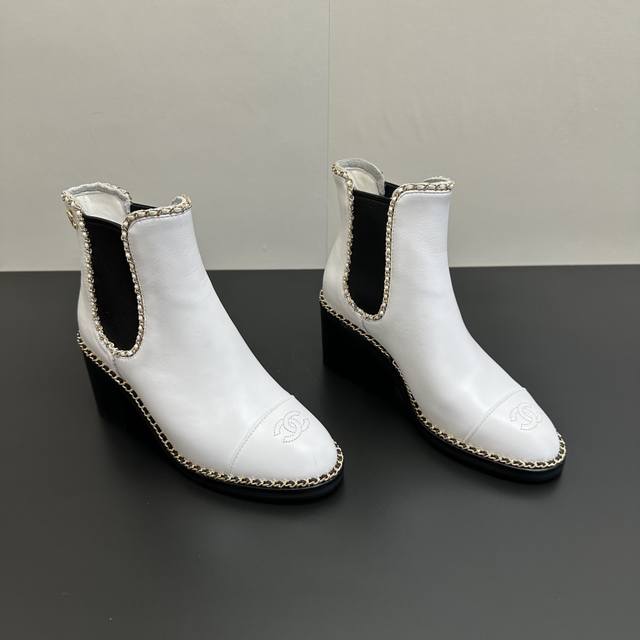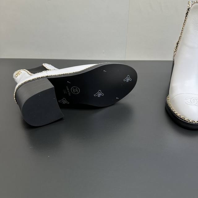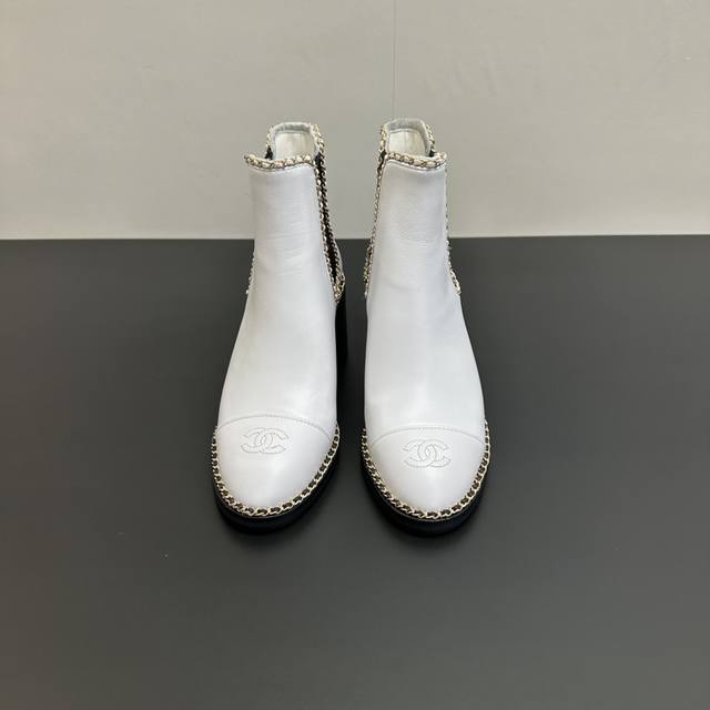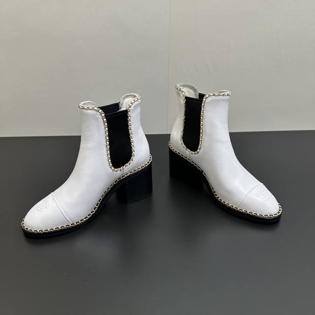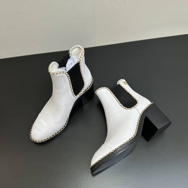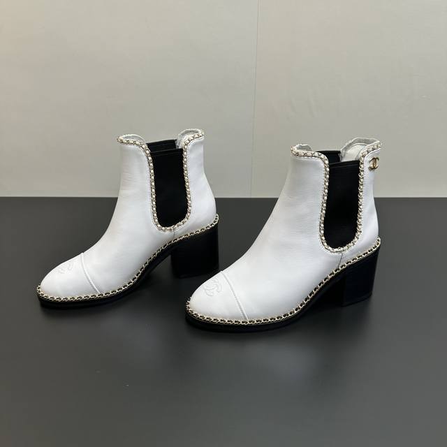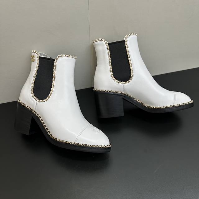 Chanel 25Ss New Autumn/Winter High-Heeled Chain Elastic Ankle Boots, Versatile and Slim Fit. Three-dimensional and full shape, comfortable and stylish on the foot. Elastic slip-on design for easy wear. Classic chain hardware for a sophisticated and elegant look. Upper: Lambskin. Lining: Lambskin. Sole: Genuine Leather. Size: 35-39, 40-41 (custom sizes available).