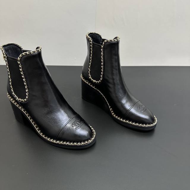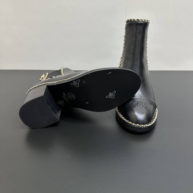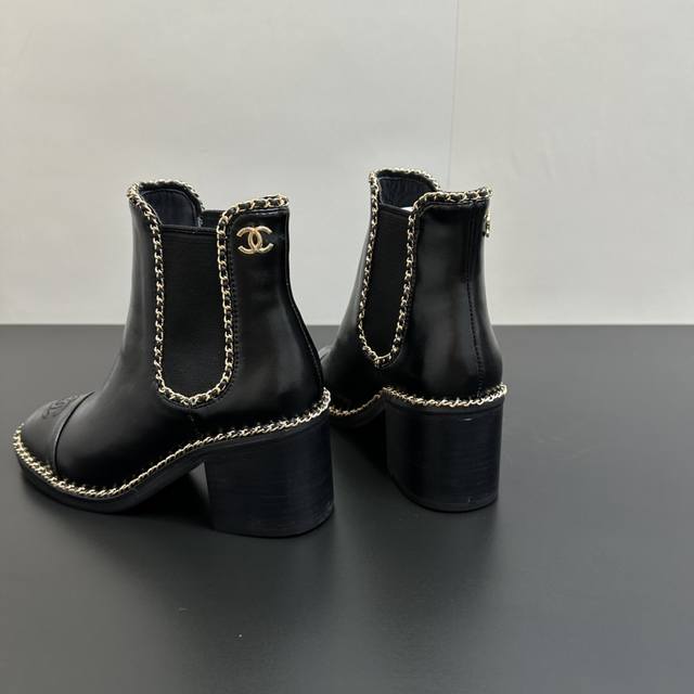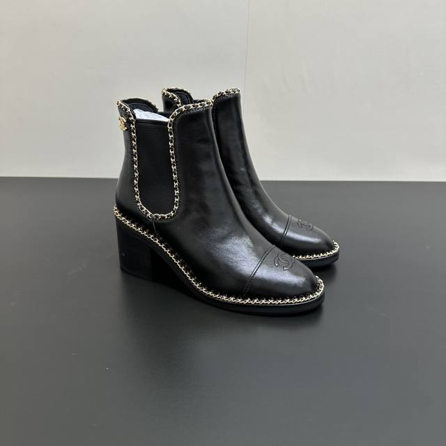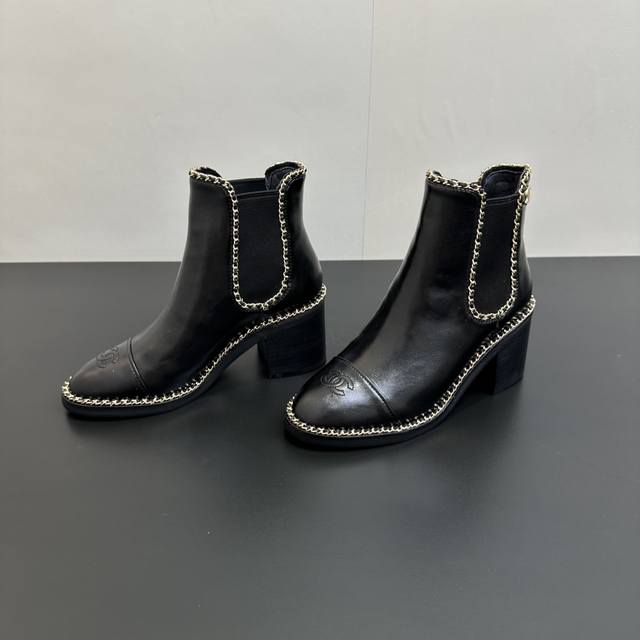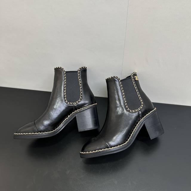 Chanel 25Ss New Autumn/Winter High-Heeled Chain Elastic Ankle Boots, Versatile and Slim Fit. Three-dimensional and full shape, comfortable and stylish on the foot. Elastic slip-on design for easy wear. Classic chain hardware for a sophisticated and elegant look. Upper: Lambskin. Lining: Lambskin. Sole: Genuine Leather. Size: 35-39, 40-41 (custom sizes available).