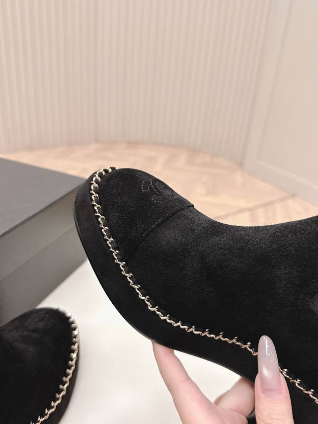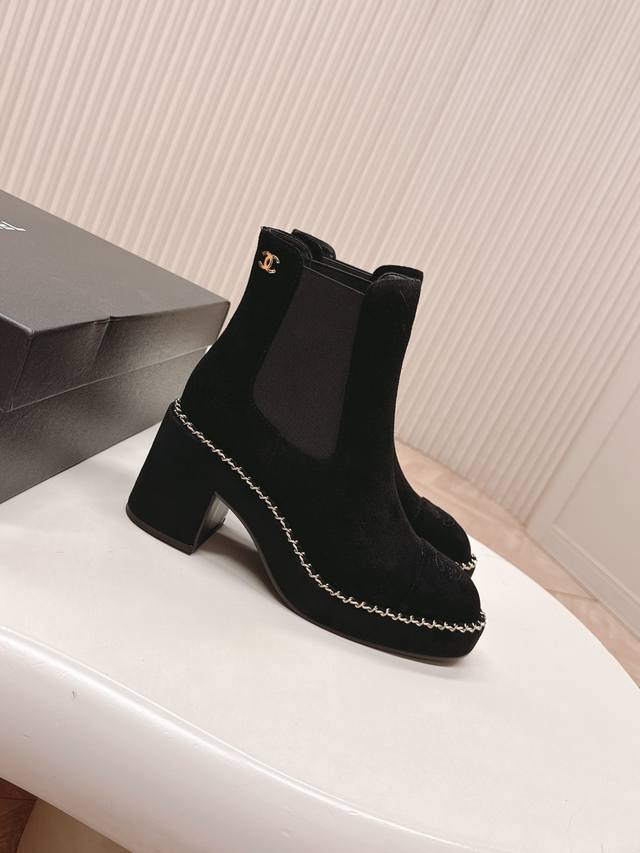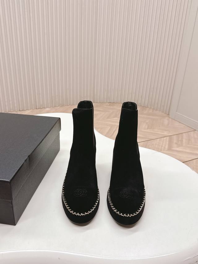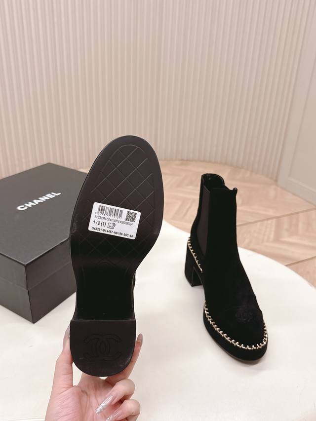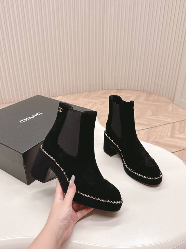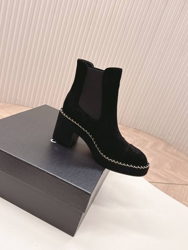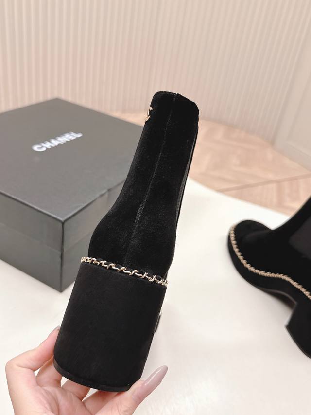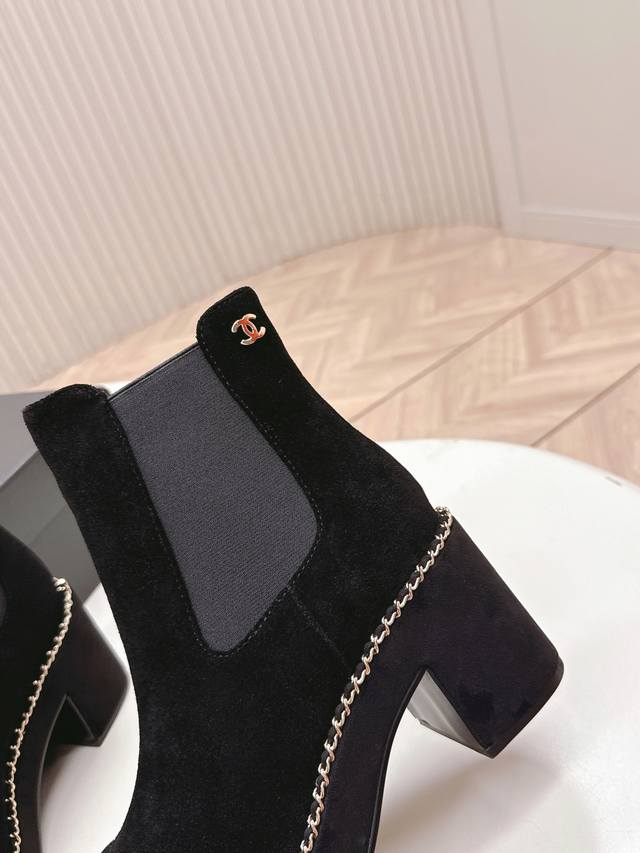 Chanel 25Ss New Autumn/Winter High-Heeled Martin Boots, Ankle Boots, Versatile and Slim Fit. Three-dimensional and full shape, comfortable to wear and exudes confidence. Elasticated slip-on design for easy wear. Classic chain hardware for a high-end and elegant look. Upper: Cowhide leather, rubber lining, insole. Size: 35-39 40