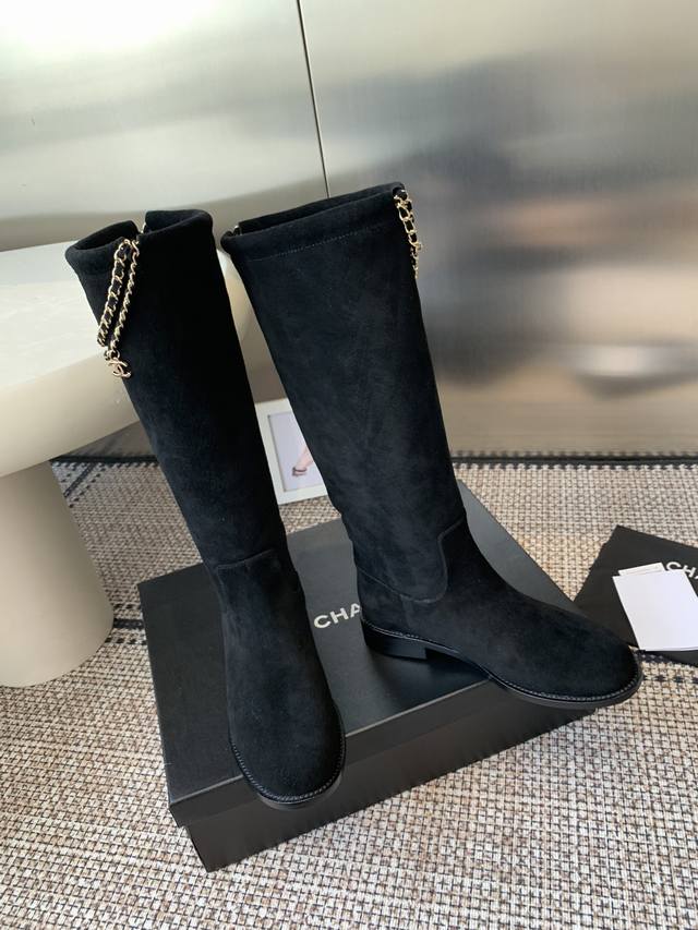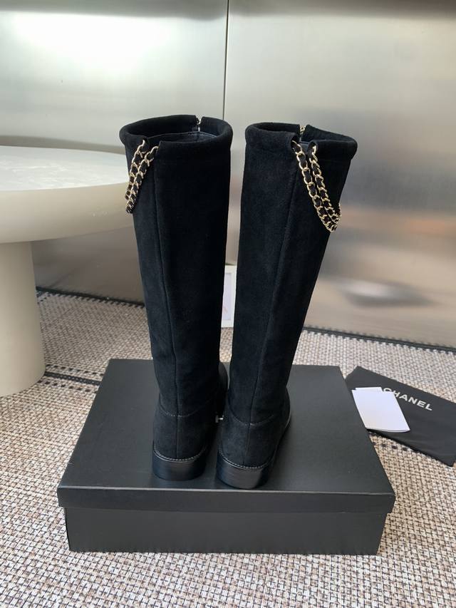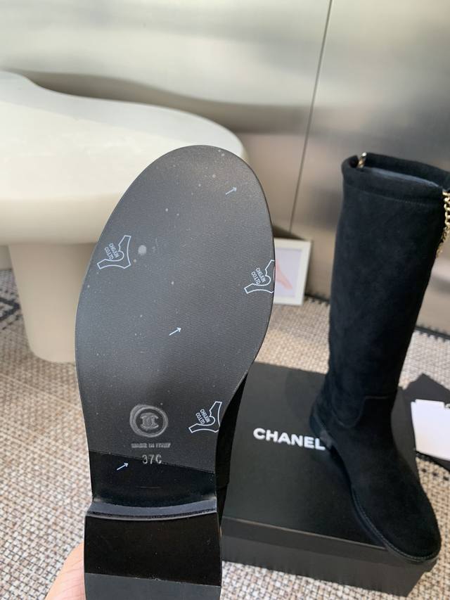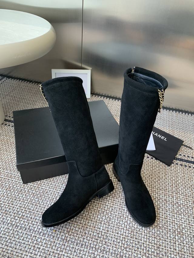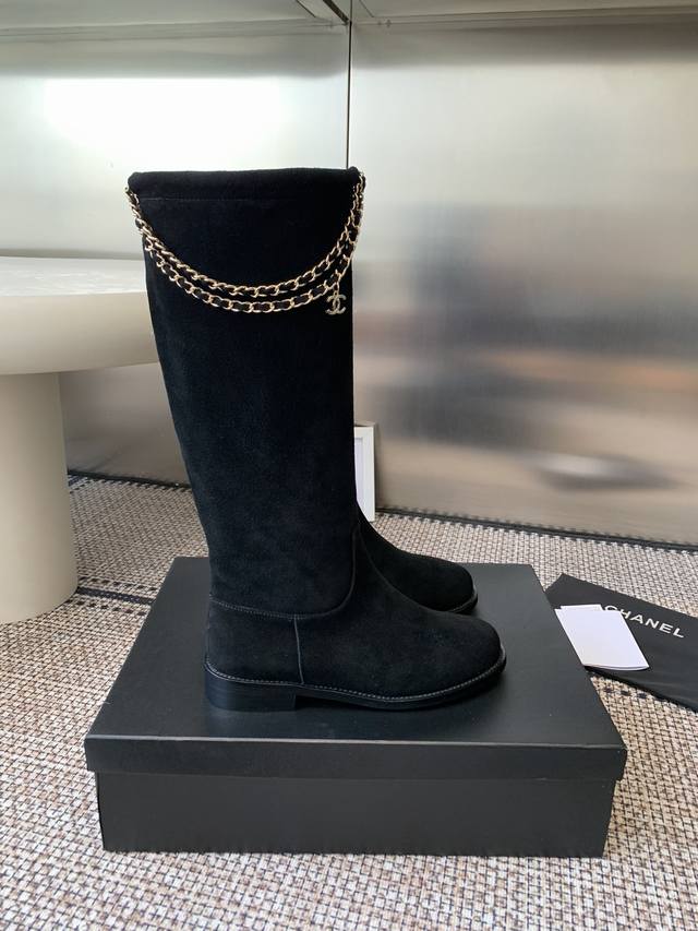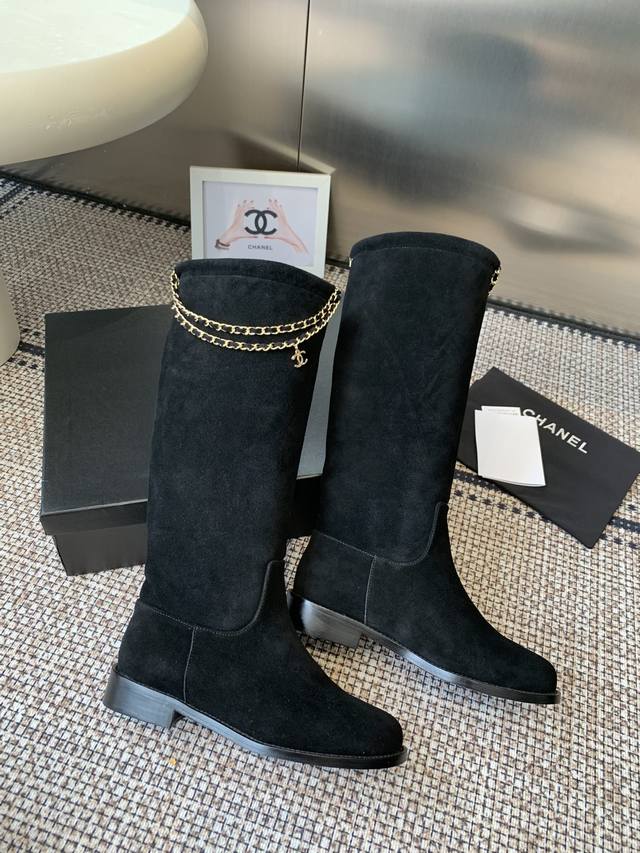 Chanel 25Ss top-of-the-line chain knight boots, new fall/winter styles, highly recommended by Xiaohongshu. A must-have for fashionistas, Chanel women love the simplicity and irresistibility. Gold hardware buckles create a unique style. Lined with water-dyed cowhide and Italian leather outsole. Sizes: 35-41. Made to order, no returns or exchanges.