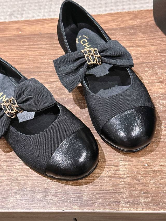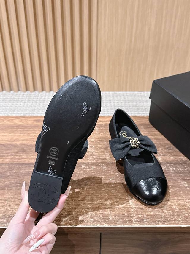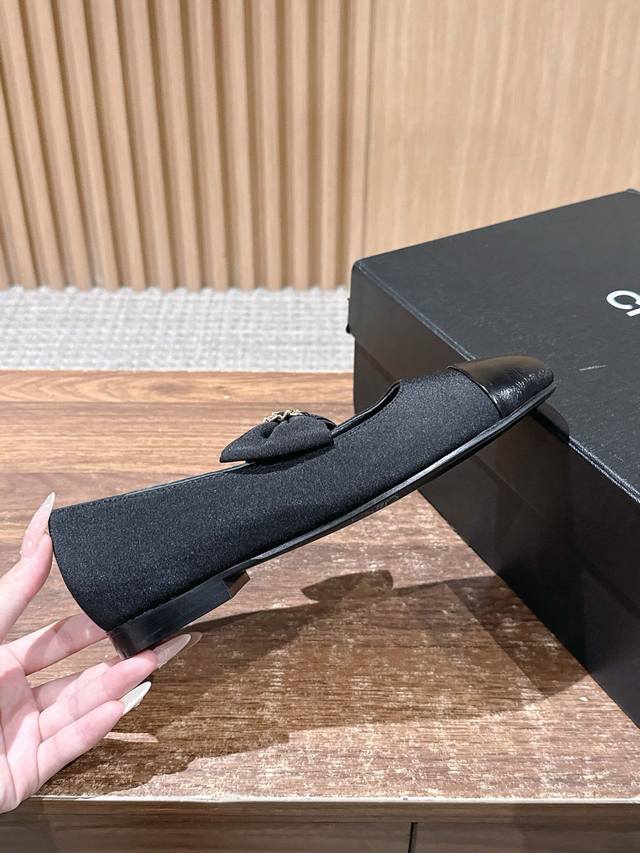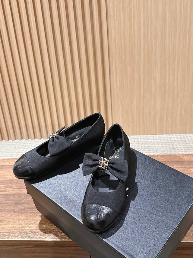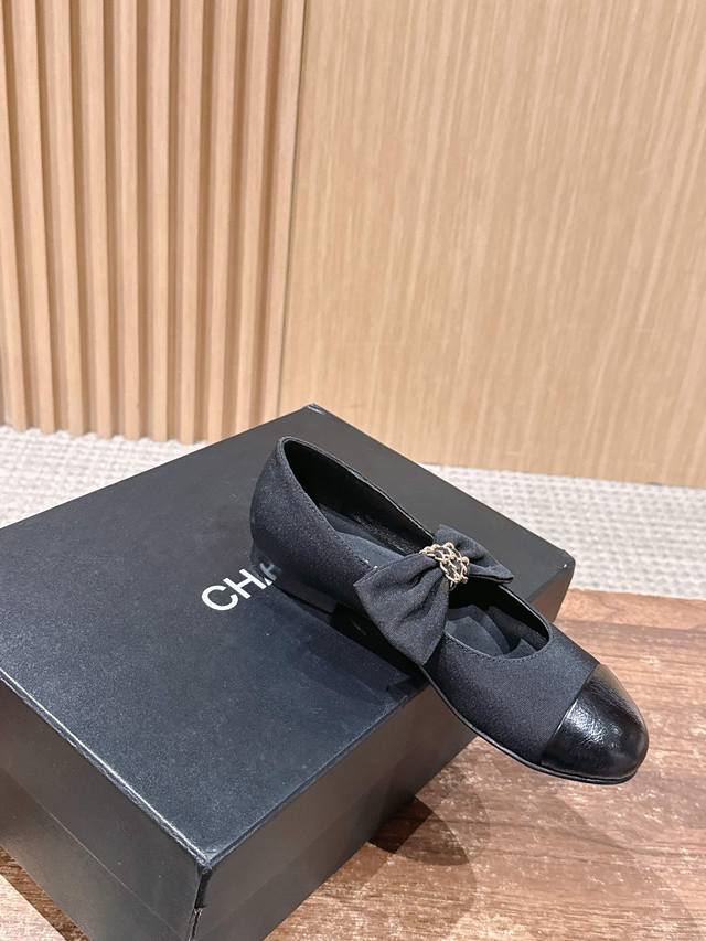 Chanel Bow Flat Shoes DDD Featuring a round toe design, the toe area is made of glossy leather, while the main body is made of black fabric, creating a layered look. A large bow adorns the upper, with a metal chain detail in the center, adding a touch of sophistication and brand recognition. The overall style is retro yet fashionable. DDD Paired with a white pleated skirt and a blue knit cardigan, it showcases a sweet, preppy style, suitable for students' everyday wear or campus activities. Paired with black straight-leg pants and a white shirt, it's simple and chic, adding a touch of sophistication to workplace attire, suitable for daily commutes. DDD Upper: Lambskin DDD Lining: Lambskin DDD Outsole: Genuine Leather Outsole DDD Size: 35~40 Size 40 is custom-made and non-refundable DDD