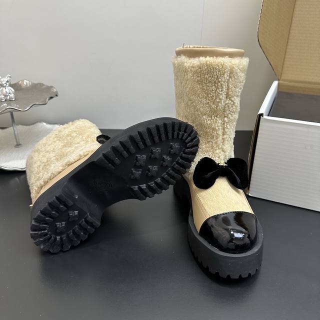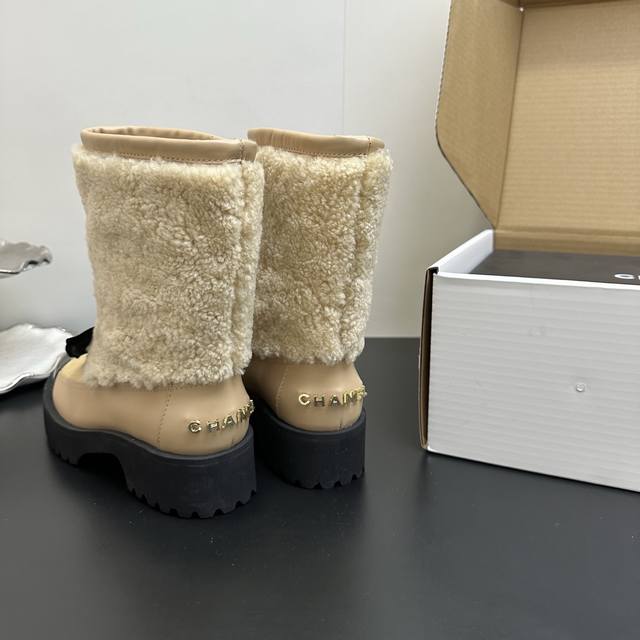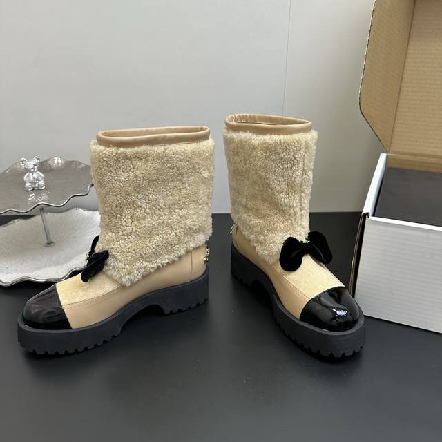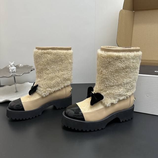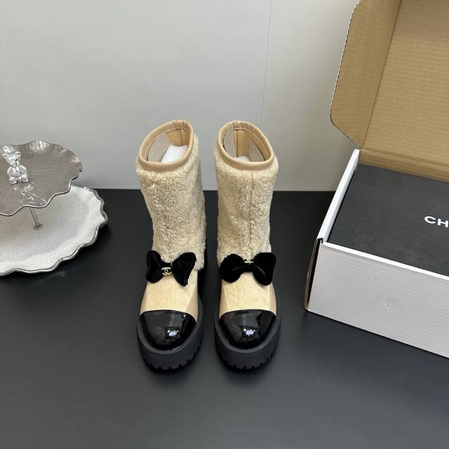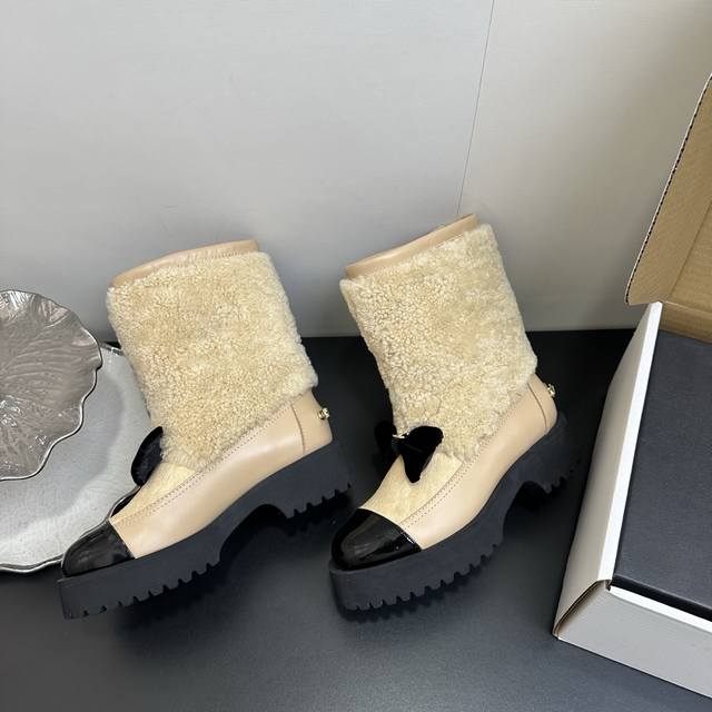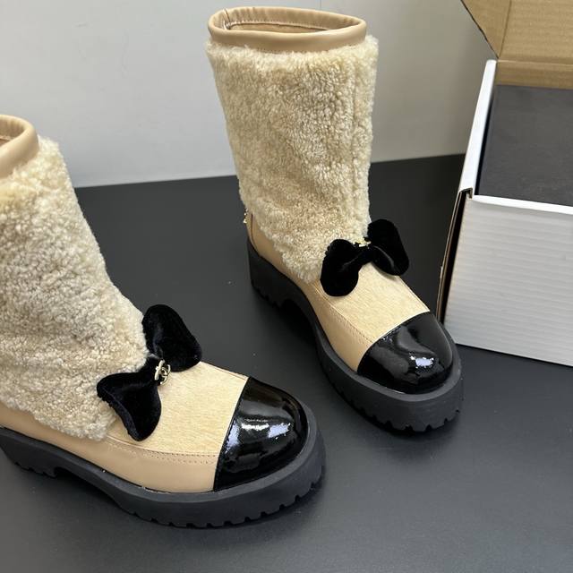 Chanel Fall/Winter Classic Short Boots with Sheepskin and Lambskin Trim, Platform Sole, Snow Boots. These Chanel boots can be both stylish and feminine. The sheepskin boot design is absolutely stunning; they look extraordinary. The straight, stylish shaft is both soft and flattering on all body types. The delicate bow embellishment adds a touch of sophistication and elegance. They look cool and stylish on the feet and make your legs appear longer. Upper: Horsehair with sheepskin and lambskin trim. Insole: Sheepskin. Sole: Combined sole, 19cm heel height. Sizes: 35-39, 40.41. Custom orders, no returns or exchanges.