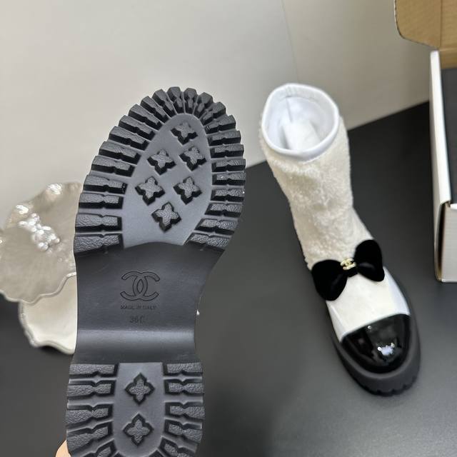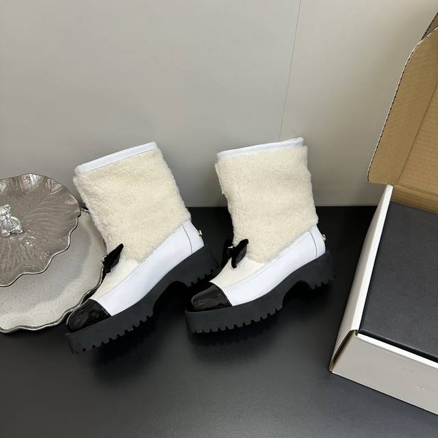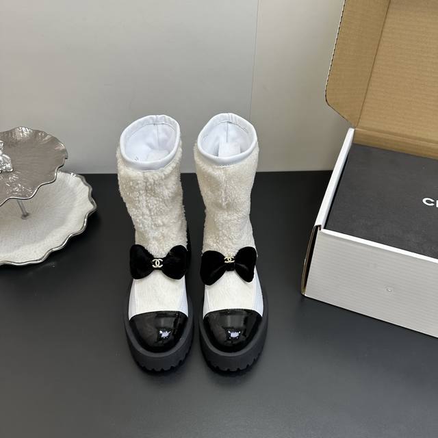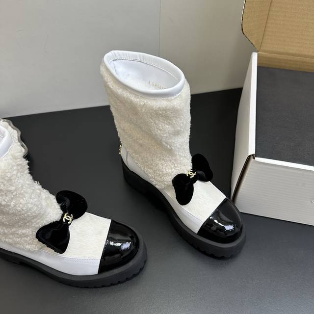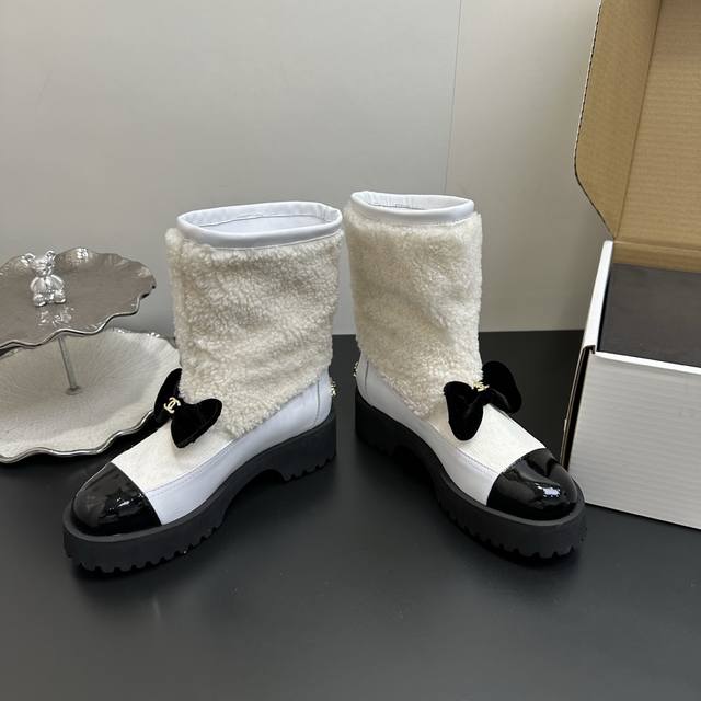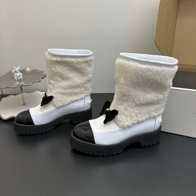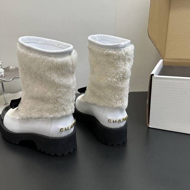 Chanel Fall/Winter Classic Short Boots with Sheepskin and Lambskin Trim - These short, platform snow boots are both stylish and feminine. The sheepskin shaft design is absolutely stunning, making them truly unique. The straight, structured shaft is both soft and flattering for all body types. The delicate bow embellishment adds a touch of sophistication and elegance. They look cool and stylish on the feet and make your legs appear longer. Upper: Horsehair with sheepskin and wool. Insole: Sheepskin. Sole: Combined sole, 19cm heel height. Sizes: 35-39, 40.41. Custom orders, no returns or exchanges.