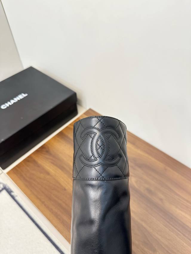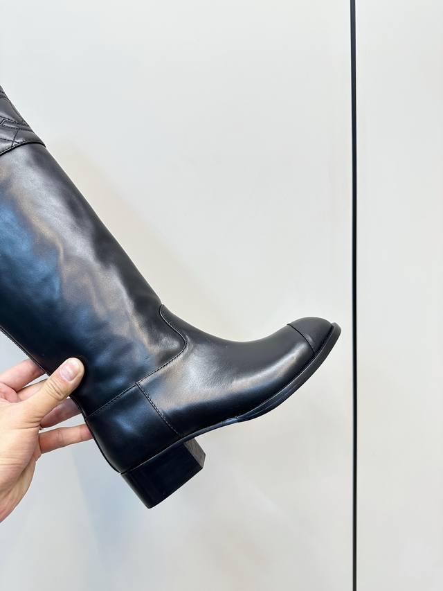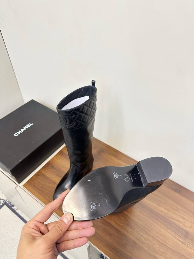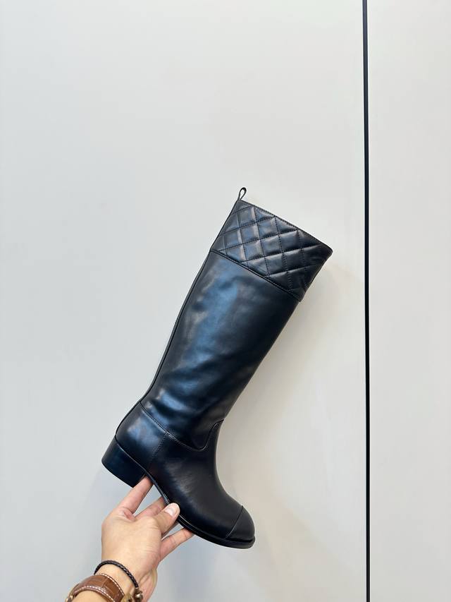 Chanel Fall/Winter New Arrival - Quilted Riding Boots These riding boots are truly a symbol of chic and style. The classic quilted design on the boot shaft and collar, along with the double C embroidered logo at the top, exudes understated luxury! Simple, stylish, and sophisticated! The natural, flowing lines create a timeless beauty, perfect for showing off long legs even in winter! Upper: Calfskin Lining: Water-dyed calfskin Heel Height: 2.5cm Boot Height: Approx. 37cm Sizes: 35-39, 40, 41 (custom orders are non-refundable and non-exchangeable) Outsole: Italian genuine leather outsole