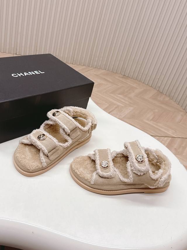 Chanel Fall/Winter New Style Furry Sandals with Velcro Straps - Superb! Casual and Versatile, Full of Luxury. Suede, Wool Lining, Genuine Leather Sole. Sizes 35-40.