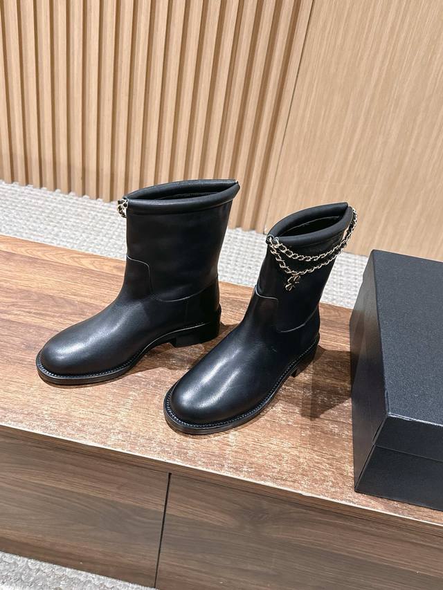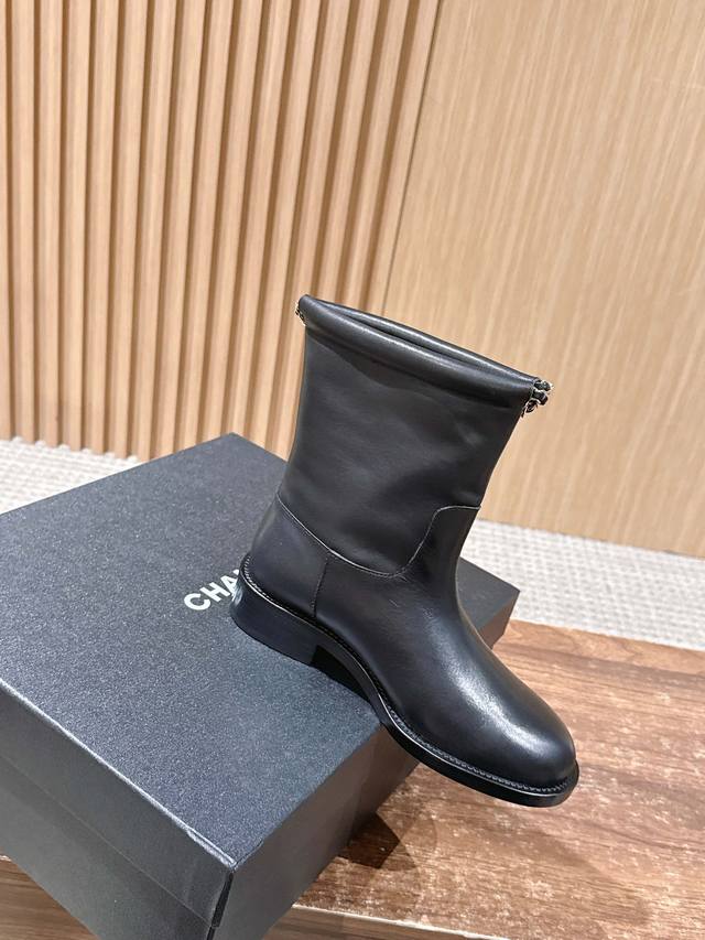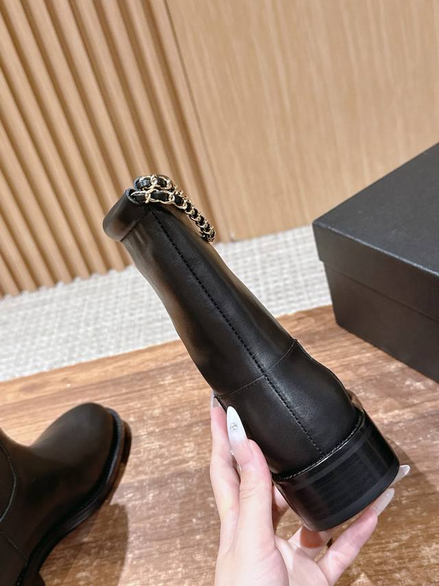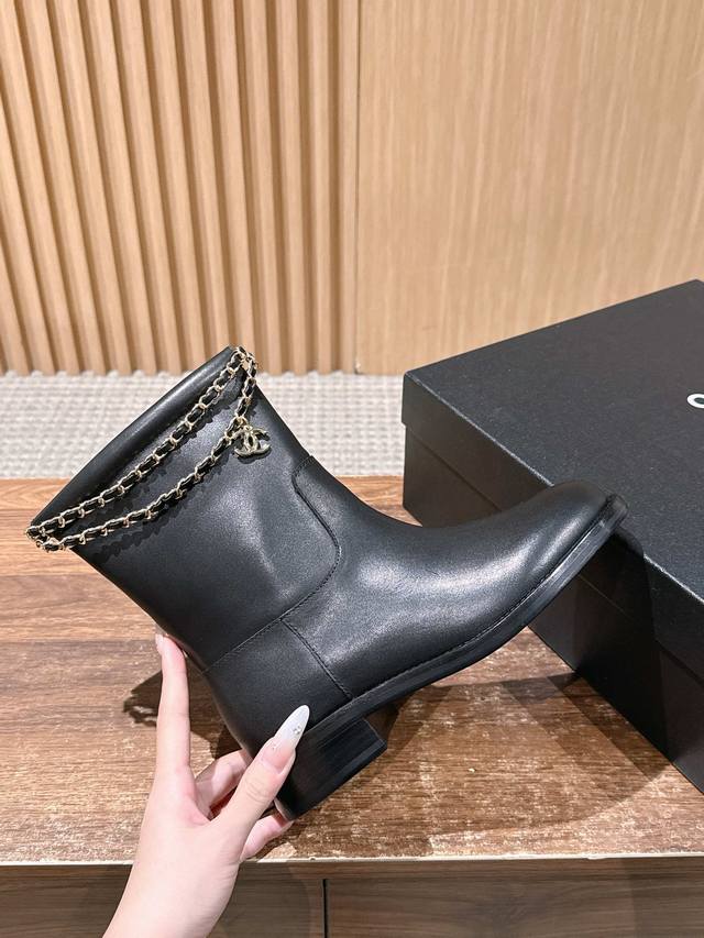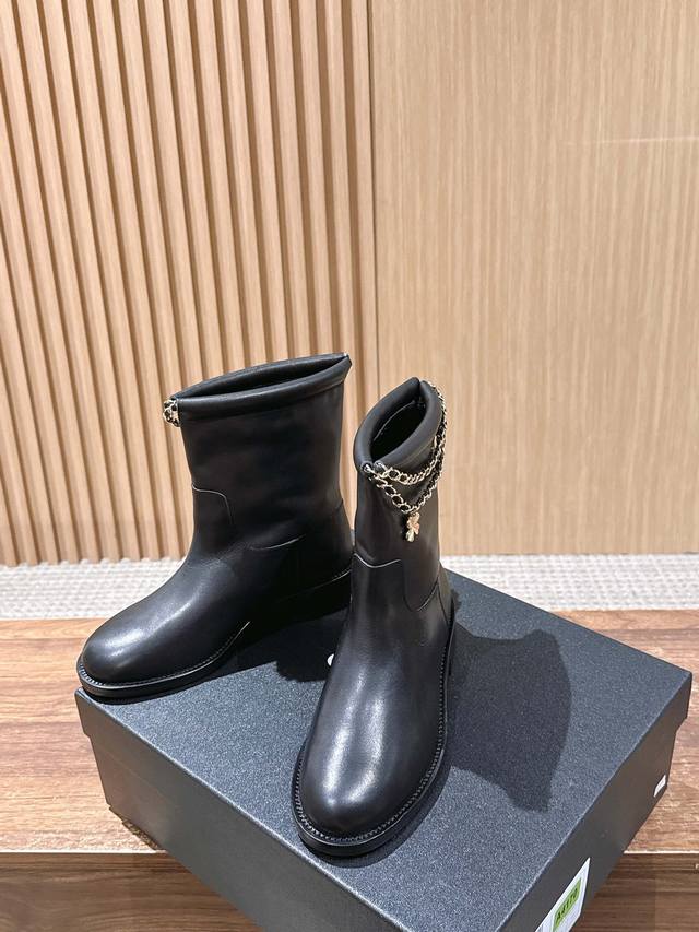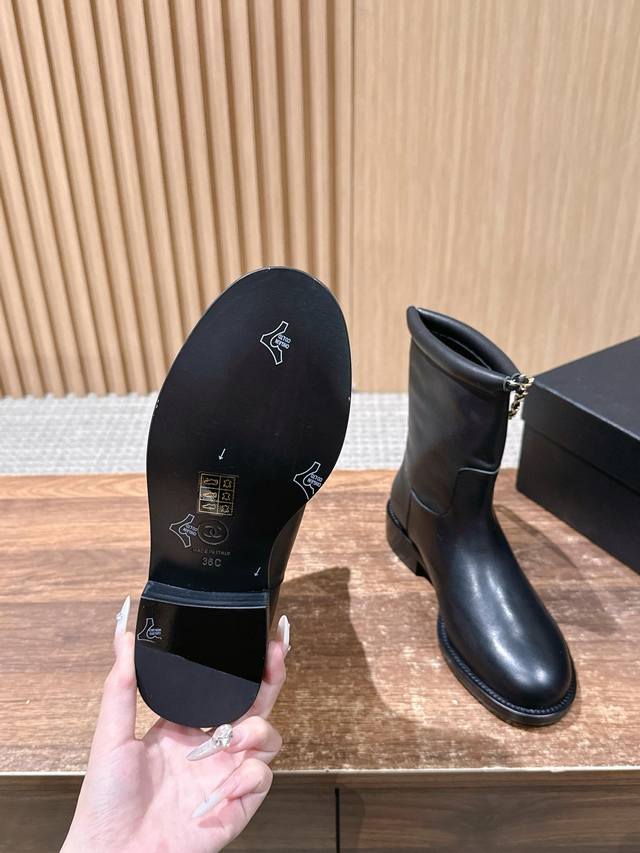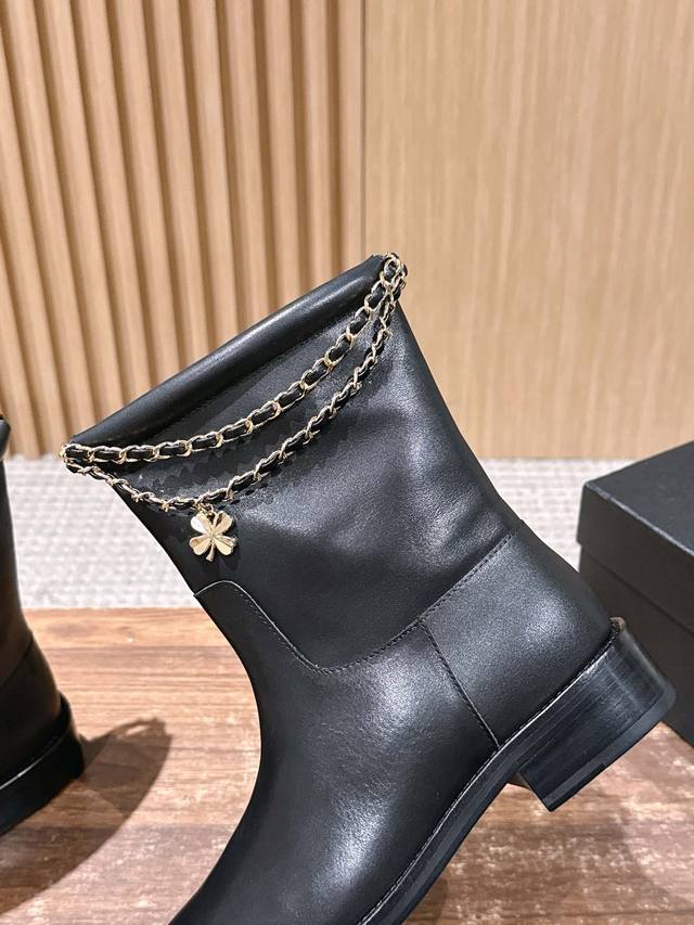 Chanel Leather Boots with Four-Leaf Clover and Double C Buckle Chain, Suede Ankle Boots DDD The iconic double C element is cleverly combined with the lucky four-leaf clover, and the chain decoration adds a touch of casualness and freedom to the boots! DDD The chain sways gently as you walk, exuding a unique charm. DDD The ankle boots have a simple and elegant design, and the just-right boot height can modify the ankle line, showing the elegance and competence of women. DDD The long boots exude a sense of grandeur and nobility, not only keeping you warm but also giving you a powerful presence. Easily become the focus of attention. DDD Whether paired with jeans for a casual and fashionable everyday look or combined with a dress for an important occasion, this series of boots can easily handle any outfit and add a lot of points to the overall look! DDD Upper: Custom material DDD Insole: Sheepskin DDD Sole: Italian genuine leather outsole DDD Sizes: 35 36 37 38 39 40 40 No returns or exchanges DDD