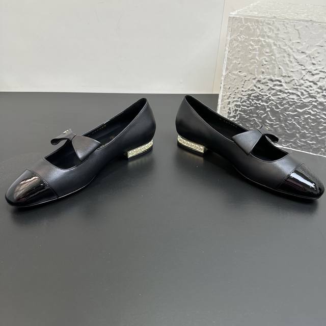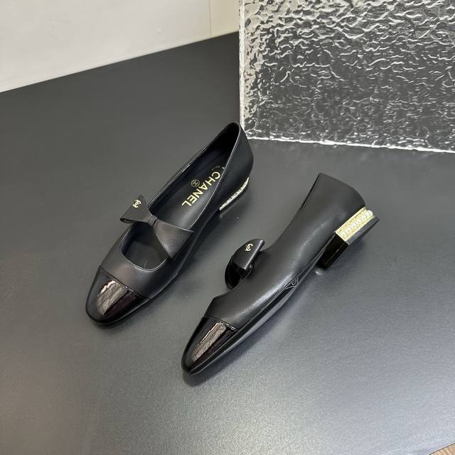 Chanel Mary Jane shoes with pearl heels and bows, perfectly blending classic elegance with modern fashion. The iconic color-blocking design, with glossy patent leather contrasting with soft leather, is both retro and eye-catching. A small bow embellishment, along with the delicate double-C logo, exudes luxurious detail. The Mary Jane strap adds a playful touch while conforming to the foot, showcasing feminine grace with every step. Material: Silk fabric; Lining: Sheepskin; Leather sole; Sizes 35-39, 40-41 (custom sizes available).