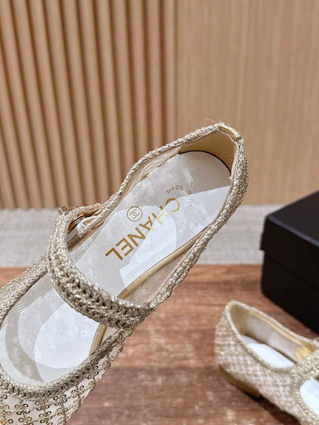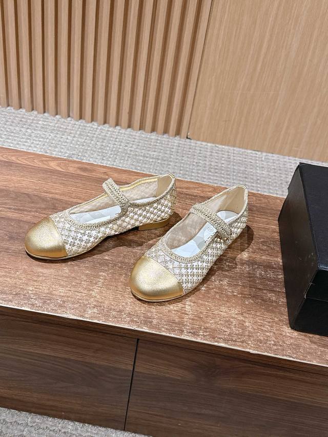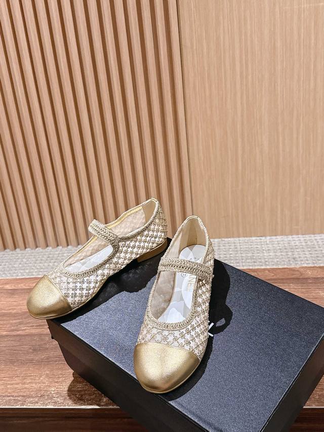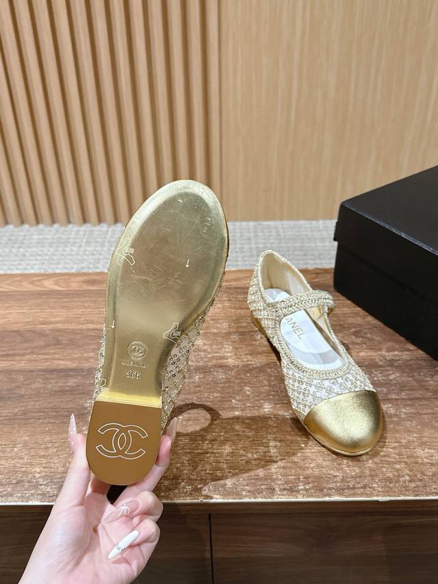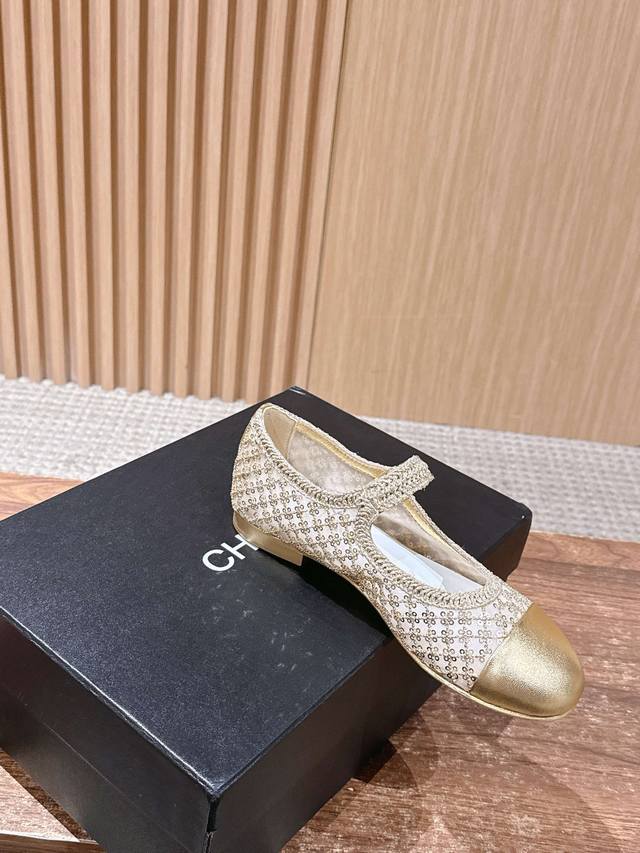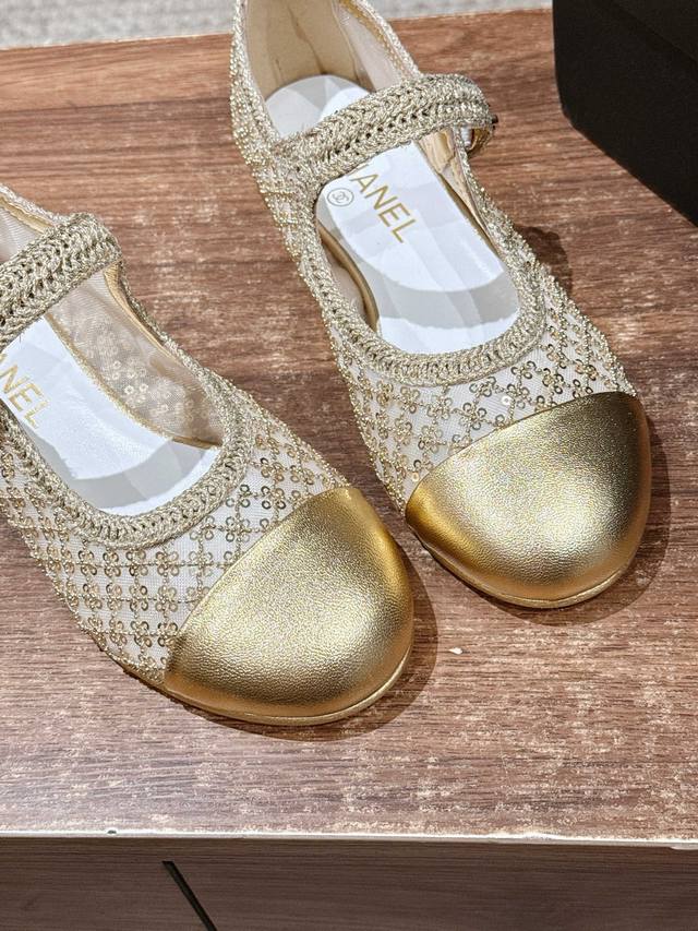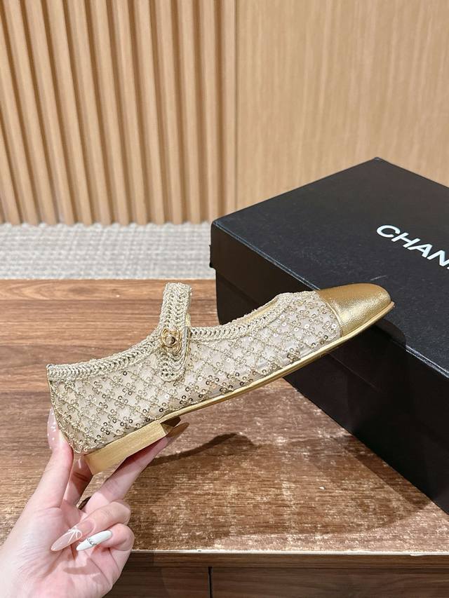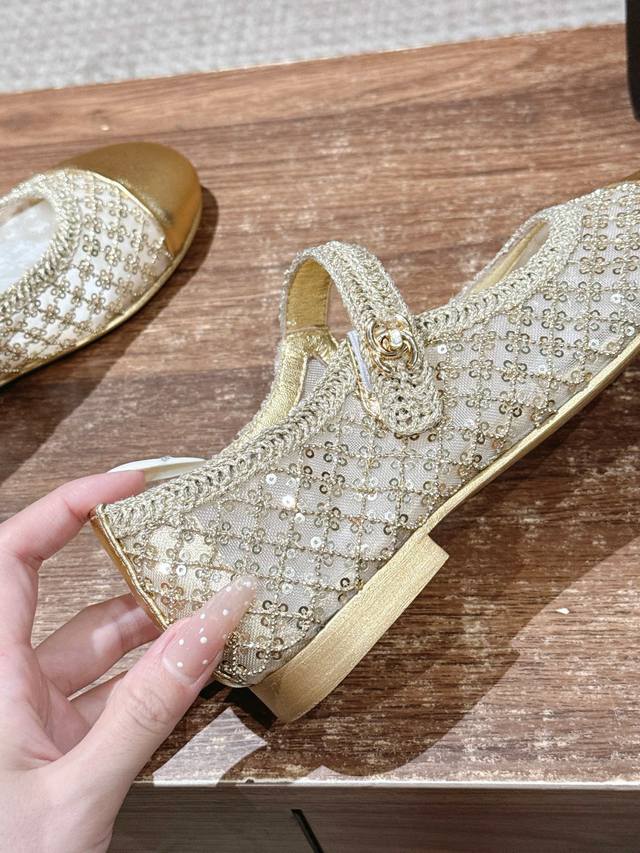 Chanel New Mary Jane Flats, Gold Sequined Ballet Flats, Exquisite and Elegant, Sparkling with a Luxurious Feel, Beautiful and Comfortable, Made with Specific Sequined Mesh Material and Genuine Leather Sole. Size: 35~40. Size 40 is custom-made and non-refundable.