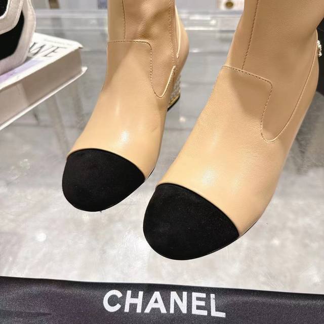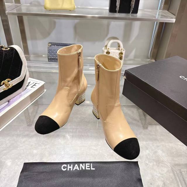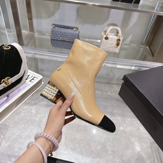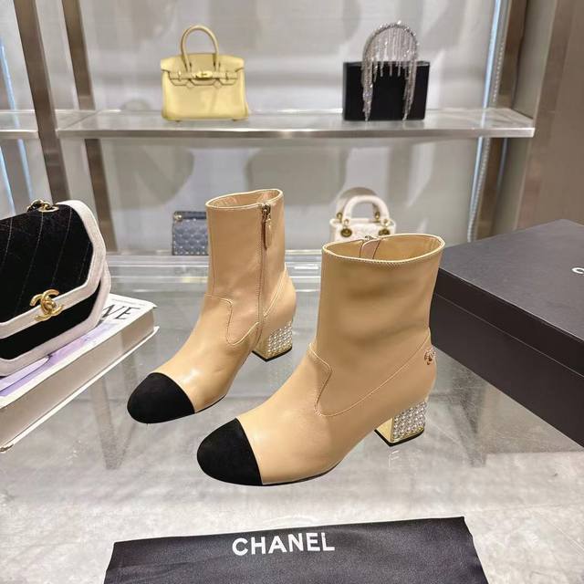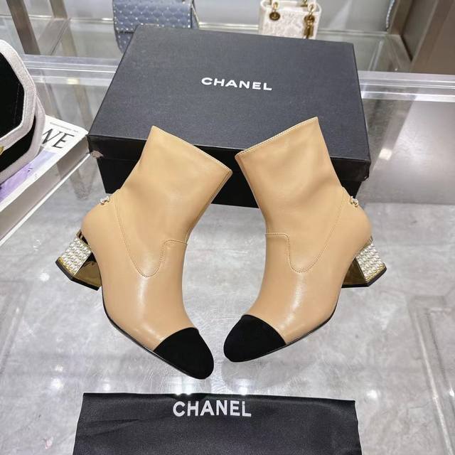 Chanel official website synchronized new products! New autumn and winter ankle boots, pearl heel classic splicing lambskin + sheepskin bare boots, heel height 5cm, sizes 35-42 40 41 42 non-refundable and non-exchangeable