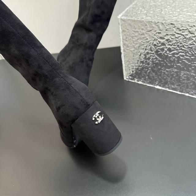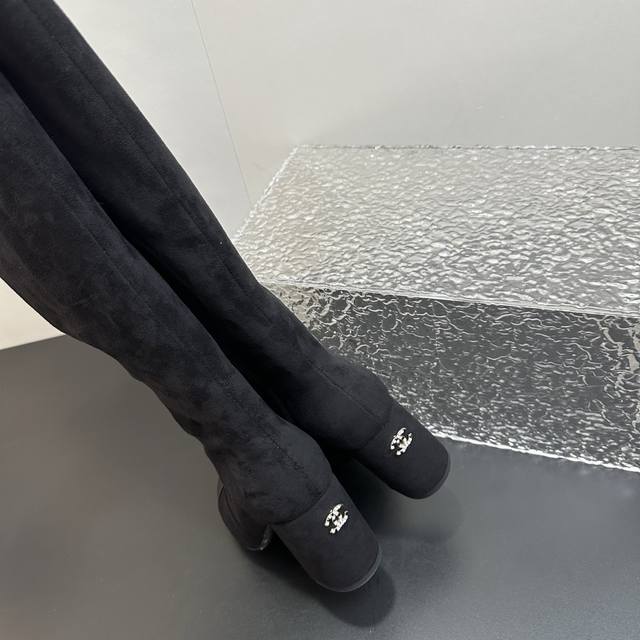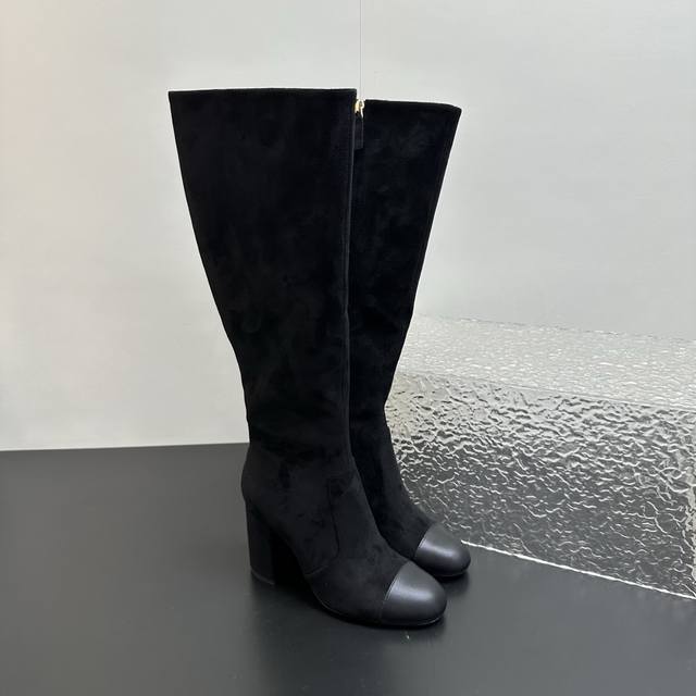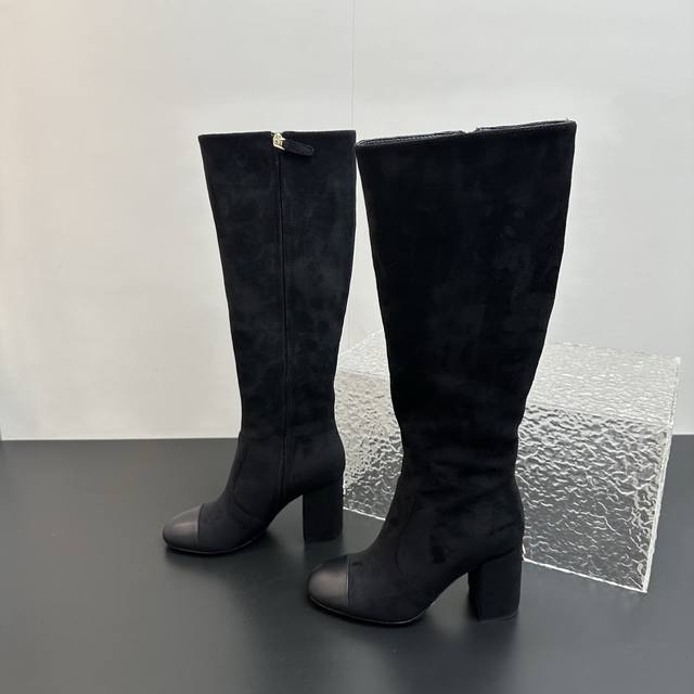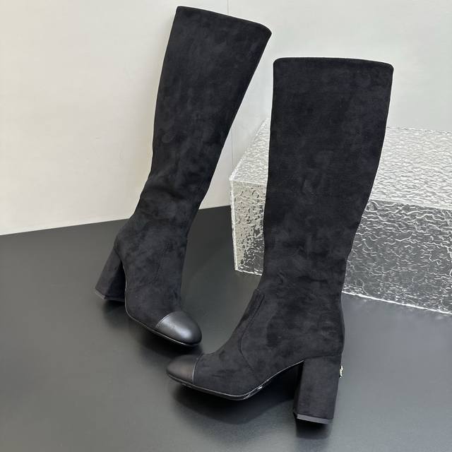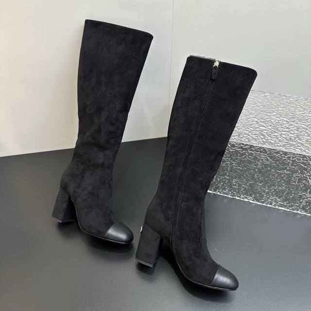 Chanel 's new patchwork knee-high boots, simple and elegant, fashionable and versatile, comfortable to wear, with a suede upper, sheepskin lining, genuine leather outsole, and a 7cm heel. Sizes: 35-39, 40, 41. Custom orders are non-refundable and non-exchangeable.