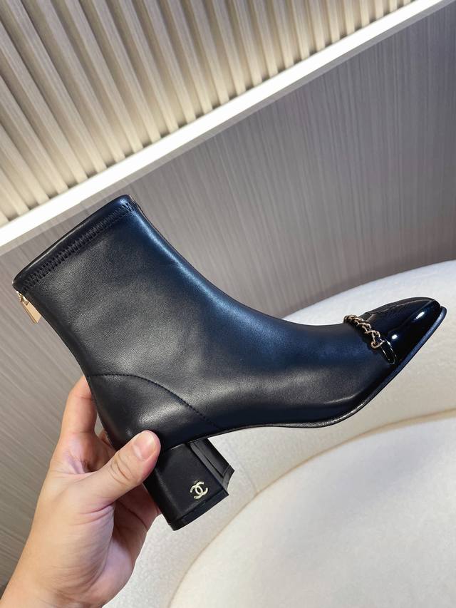 Chanel~~Chanel ankle boots, a super classic and versatile style, a favorite height-enhancing artifact for kids, perfectly elongating the legs visually, super slimming for legs and feet. Original imported craftsmanship, genuine leather outsole, imported elastic sheepskin upper, chain and leather strap embellishments, zipper design on the heel, embroidered double C logo on the toe, 6.5cm chunky heel. Sizes 34 and 41. Custom orders, no returns or exchanges.