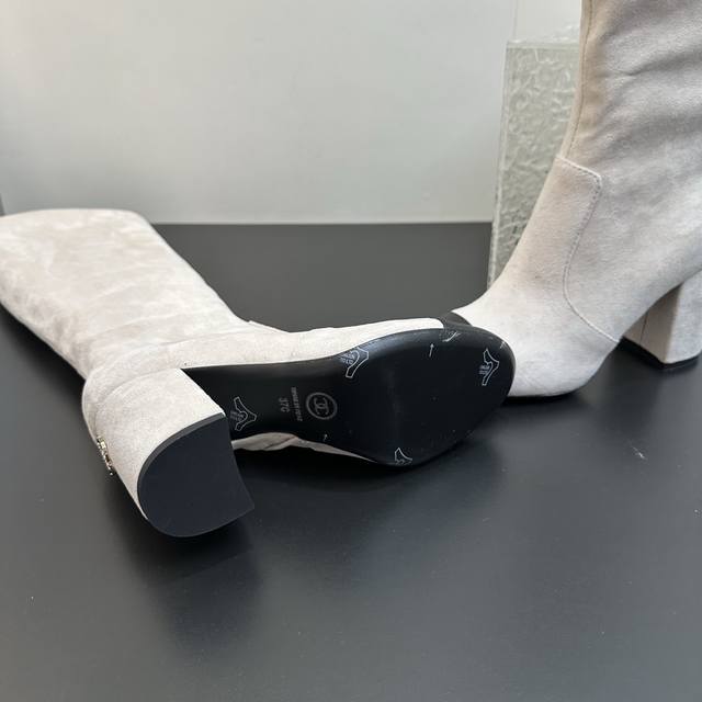 Chanel's new patchwork knee-high boots, simple and elegant, fashionable and versatile, comfortable to wear, with a suede upper, sheepskin lining, genuine leather outsole, and a 7cm heel. Sizes: 35-39, 40, 41. Custom orders are non-refundable and non-exchangeable.