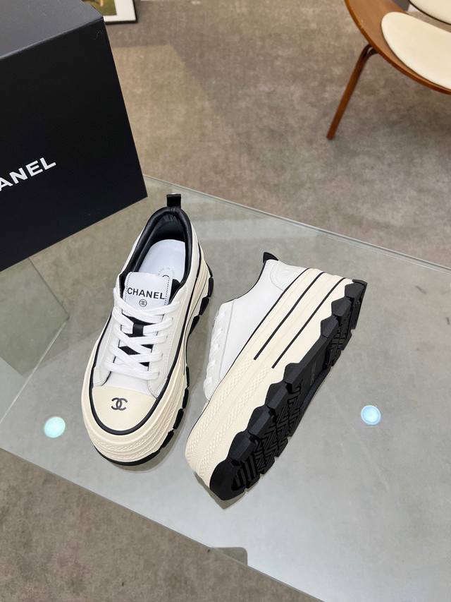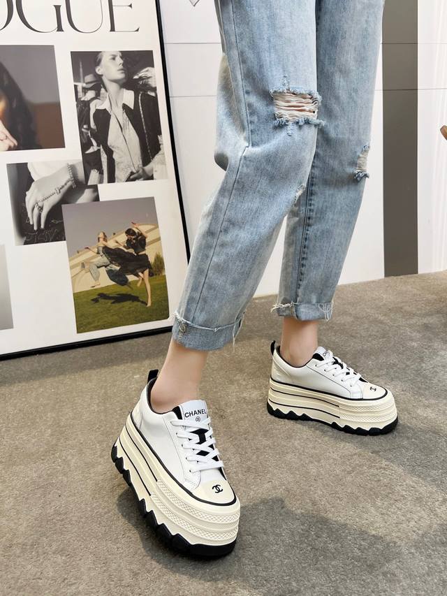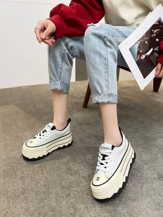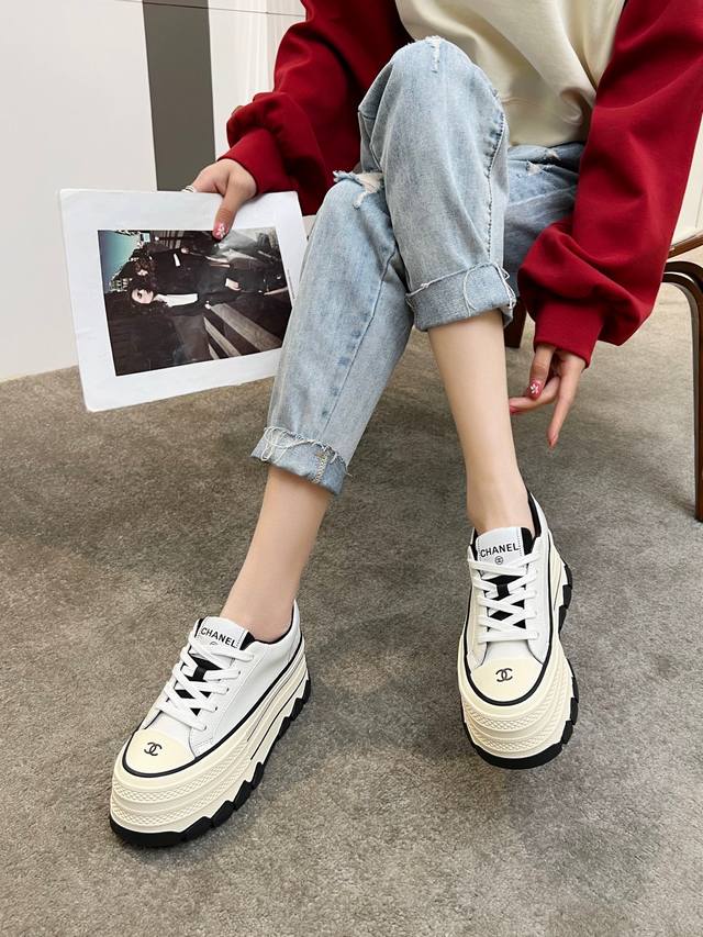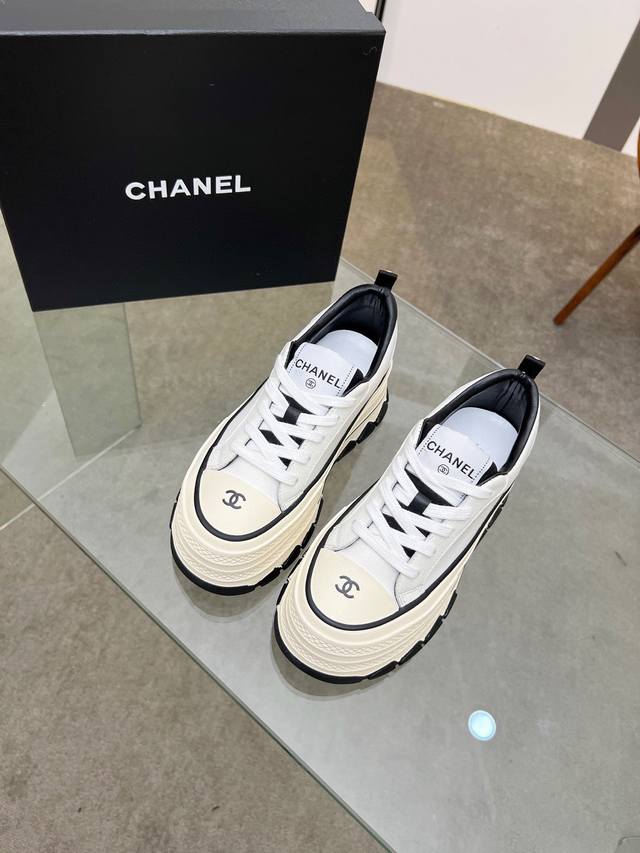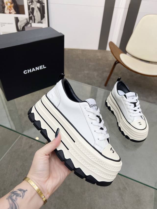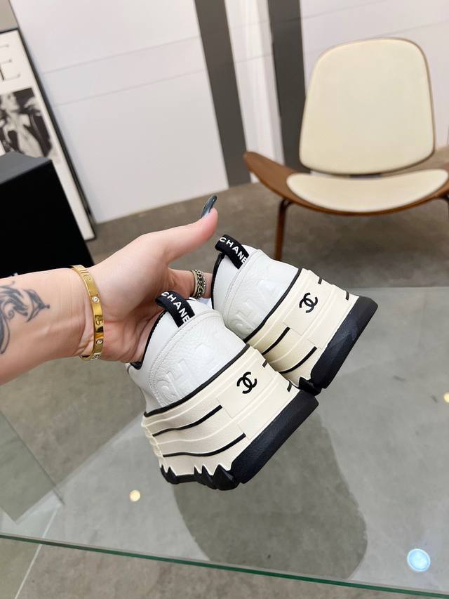 Chanel's new retro-inspired platform sneakers present a relaxed and lightweight feel, perfect for summer. Continuing Chanel's signature deconstructed silhouette, the shoe features simple, three-dimensional lines and a double logo. The upper is made of top-grain cowhide leather, providing a soft and comfortable feel. It features a platform rubber sole with geometric patterns and rubber trim details. The height-enhancing and leg-lengthening effect is comparable to leg augmentation, making legs appear slimmer and longer. Easily styled with any look! Upper Material: Cowhide Lining Material: Sheepskin Sizes: 35-40