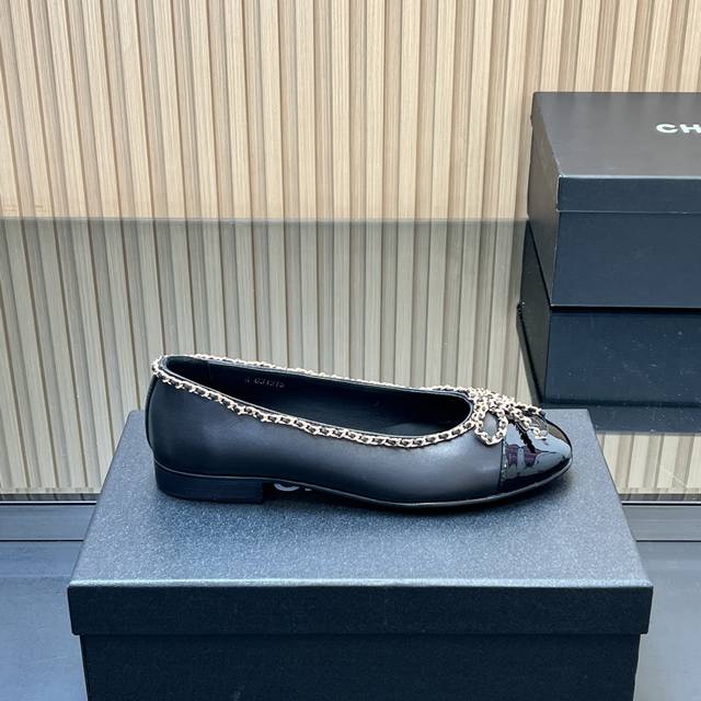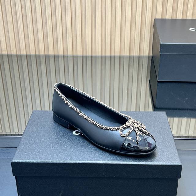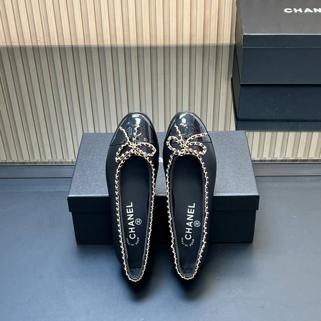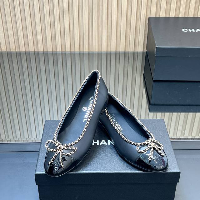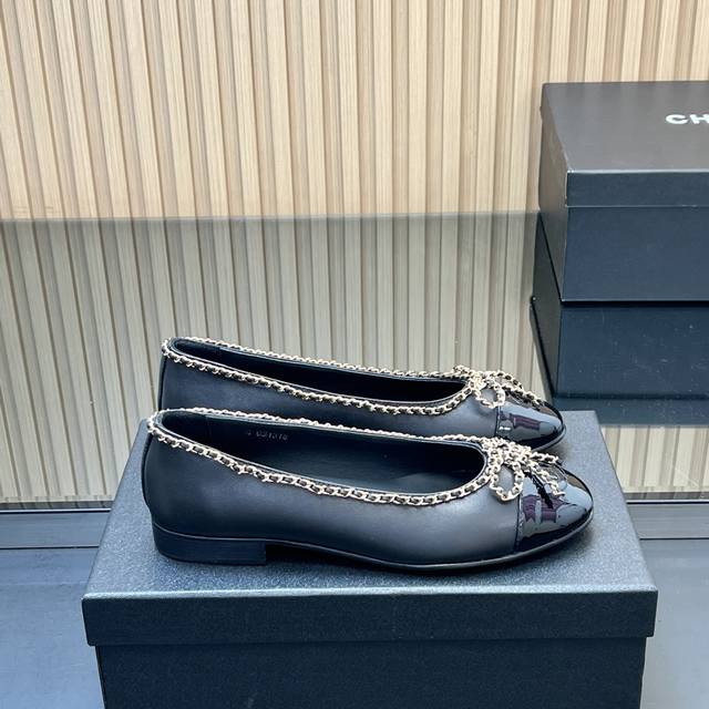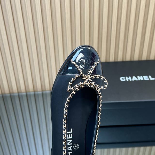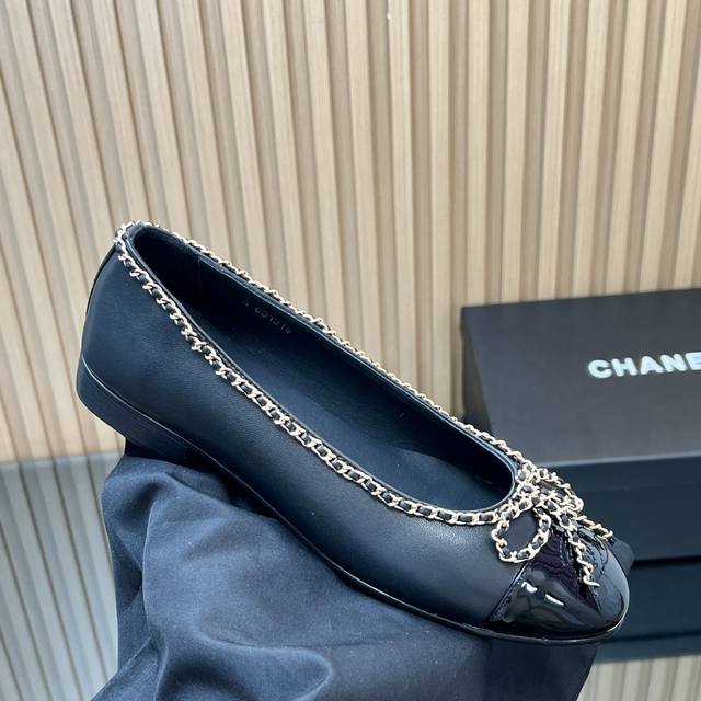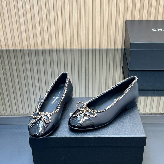 , correct high version! Chanel's classic chain bow ballet flats, featuring a two-tone color-block design, debuted in 1957. The Two-Tone design later became a Chanel classic. This particular two-tone design is simple yet exquisite, with a square toe that exudes elegance and visually elongates the legs. The contrasting colors at the toe and the simple yet elegant back lace-up design make this a timeless classic. The latest upgraded version has been refined and optimized in terms of materials, details, and last lines. The 25 version boasts even more beautiful, delicate lines that flatter the foot shape, making it more comfortable and snug. It looks amazing on the feet, exuding a sophisticated and elegant style. Upper: Selected imported sheepskin patent leather; Lining: Grade A sheepskin; Heel height: 2cm; Outsole: Italian genuine leather; Sizes: 35-39; 34, 40-44 (custom sizes, no returns or exchanges); Comes with full boutique packaging.