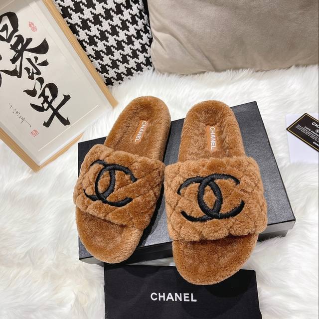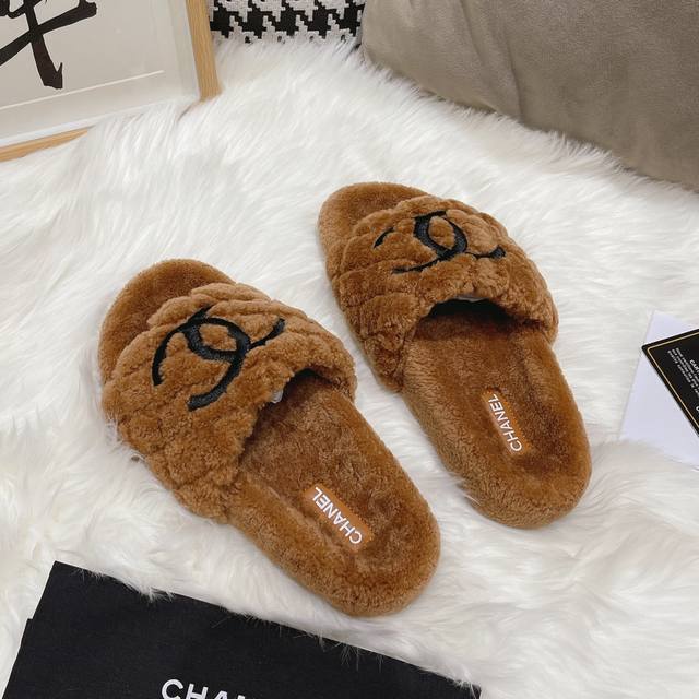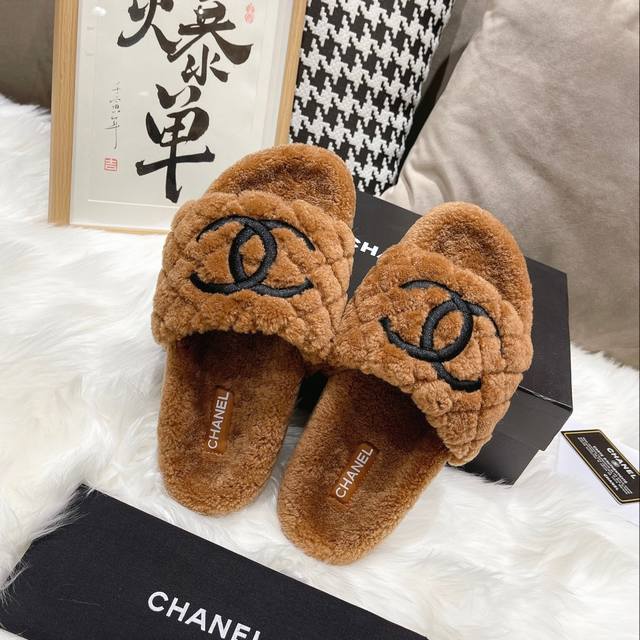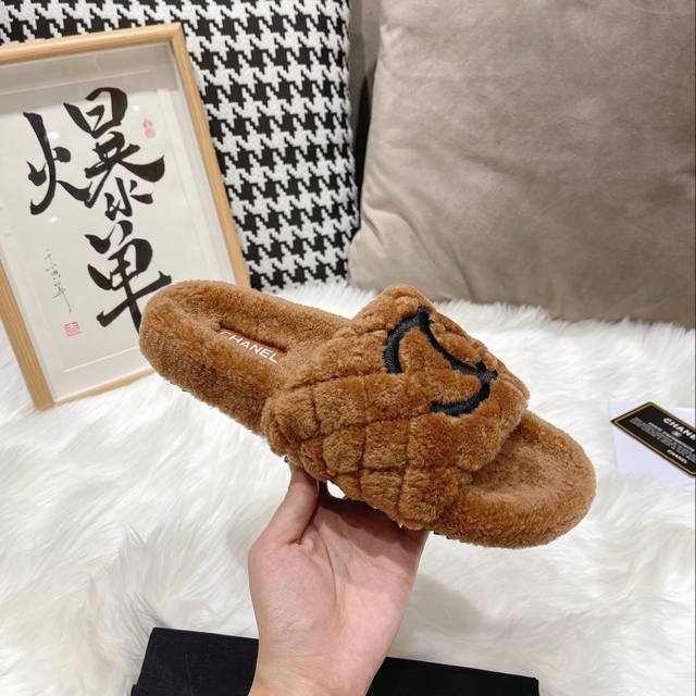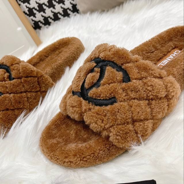 Checkered 3D three-dimensional embroidery Chanel autumn and winter lazy fashion, leisure style series trendy fragrant fur slippers, only made of real fur, counter quality