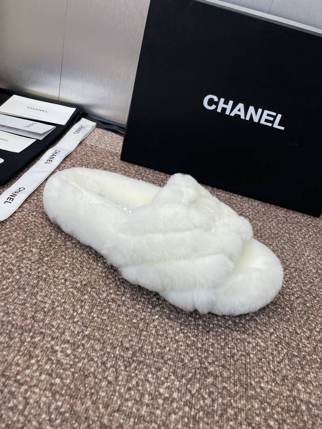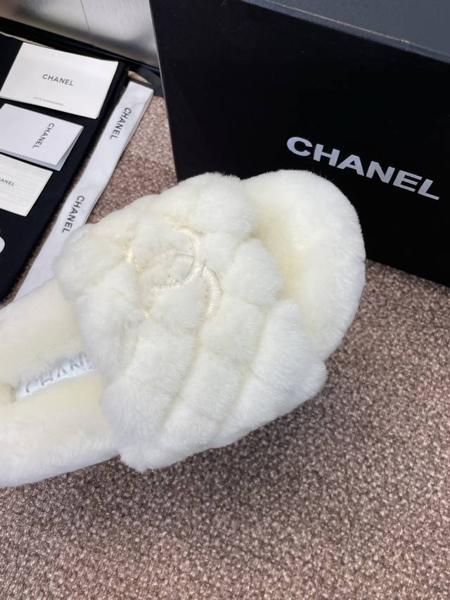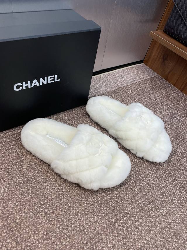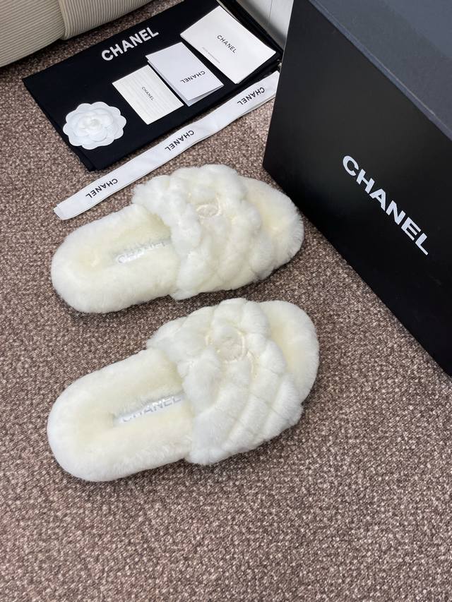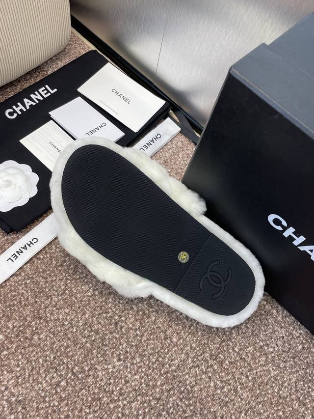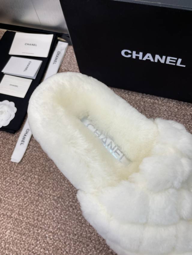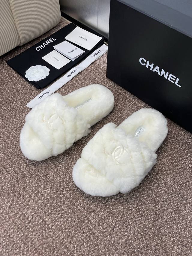 Chanel Chanel 2025 autumn and winter new fashion diamond embroidery versatile lambswool women's slippers Chanel letter logo flat round head color matching open toe home shoes