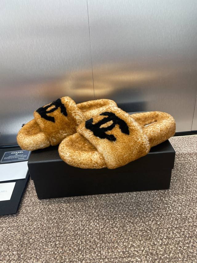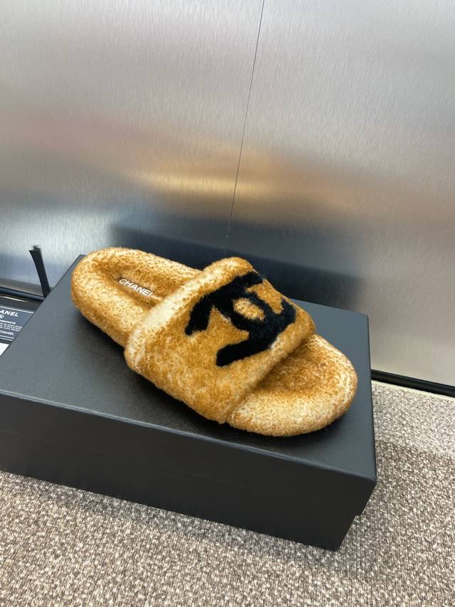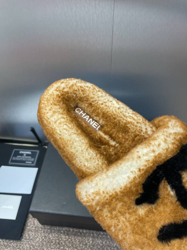 Chanel Chanel 2025 autumn and winter new fashion with lambswool women's slippers Xiaochan letter logo flat round head color matching open toe home shoes