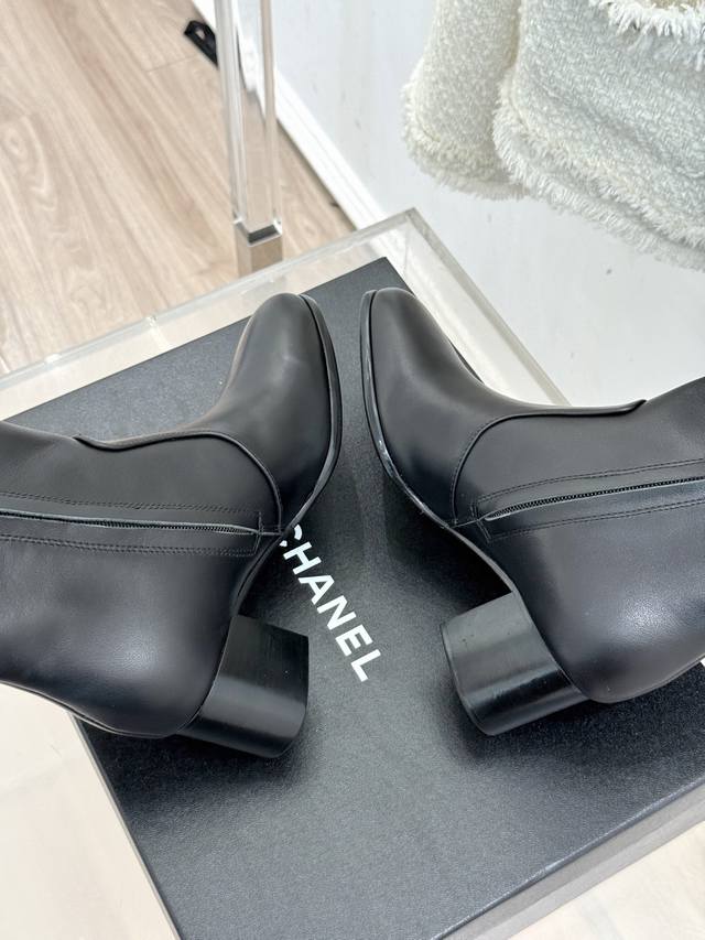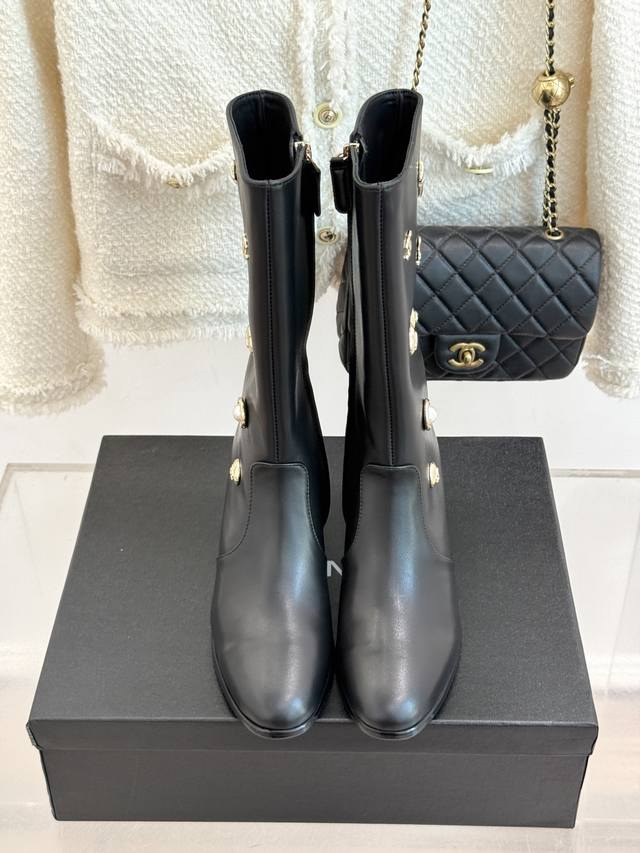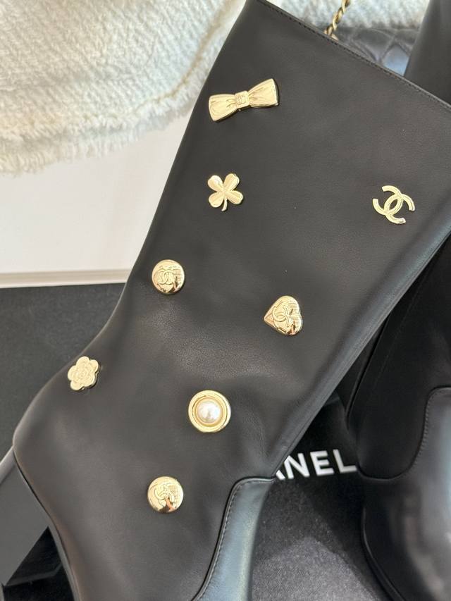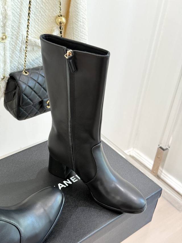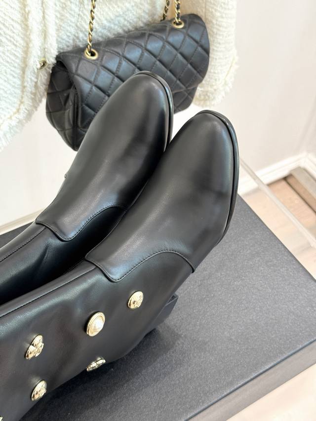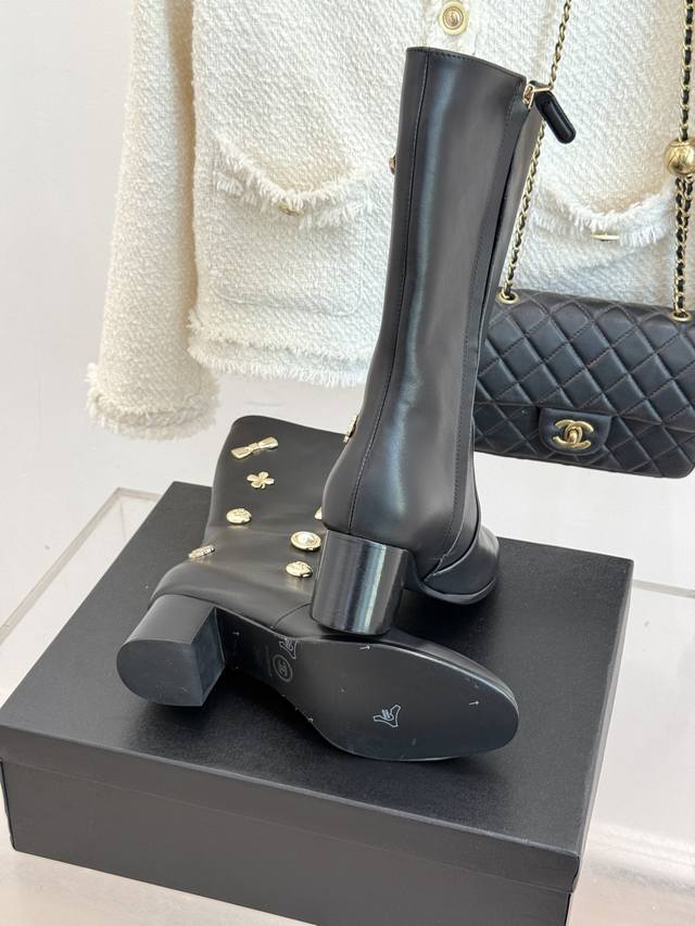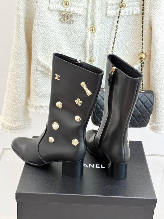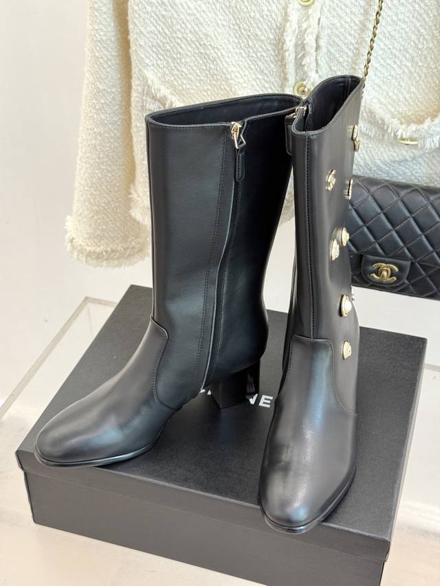 Factory Price: Chane* | 25K Double C Metal Buckle High-Heeled Boots. These boots, with their classic silhouette, embody a modern look, making every step a statement of elegance and strength. The shoe's adorning metal buckles, each with its own unique style, creates a retro yet modern aesthetic. The 5cm heel, with its ergonomic design, elongates the leg, providing a commanding presence while maintaining stability. The ergonomically shaped shaft of the boot contours seamlessly contours the leg, creating a sculpted silhouette even for those with slightly thicker calves. These boots are a true ode to Chanel's century-old aesthetic and a tangible expression of the confident stance of contemporary women. Elegance, effortless and effortless, shines through in every step.