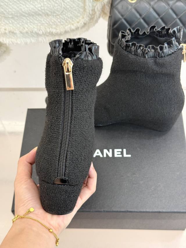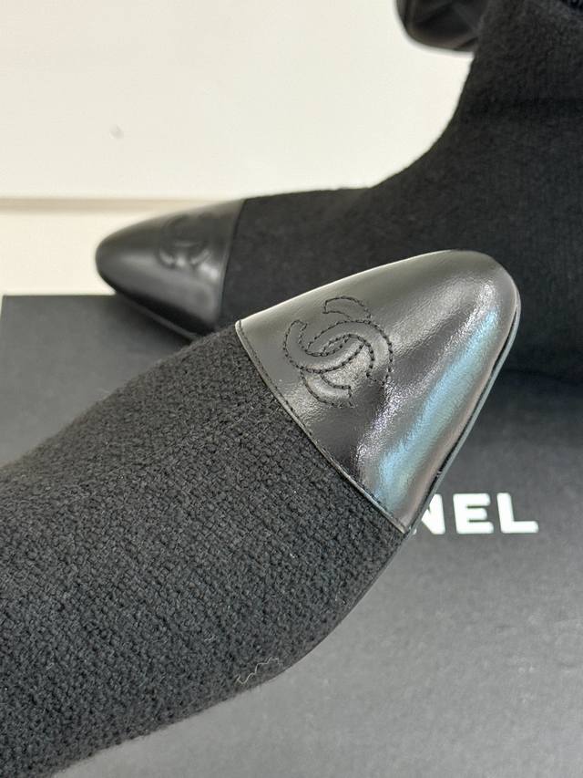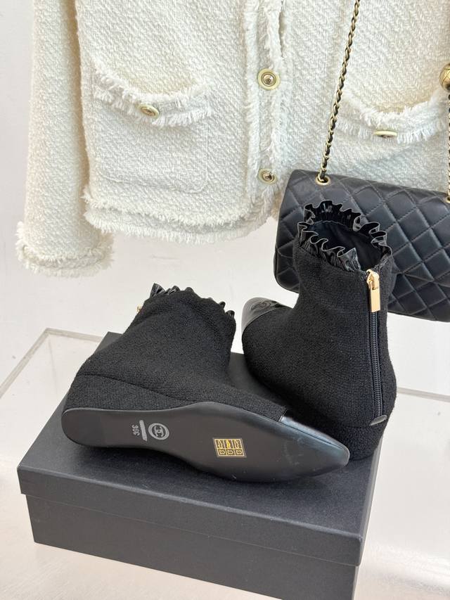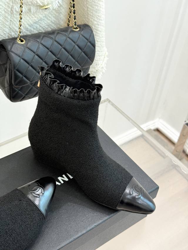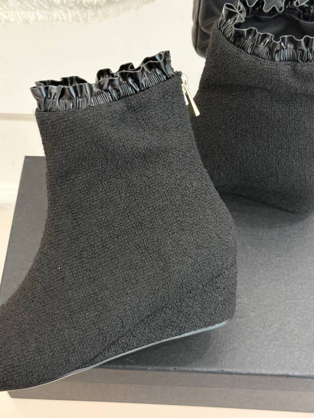 Chane* | Chanel 25A New Pointed-Toe Double C Colorblock Wedge Heel Ankle Boots. The classic Double C logo meets a cutting-edge colorblock design, adding a striking touch to the 2025 fashion landscape. These boots instantly became a trendsetter's new streetwear favorite. Their unique colorblock design immediately captured attention. The pointed toe is a finishing touch, while the sleek lines extending upwards visually elongate the legs. Even petite individuals can achieve supermodel-esque slender legs. Whether paired with sharp trousers or playful skirts, these boots are perfect for a variety of styles. The iconic Double C embroidery on the toe cap is a dazzling brilliance, a symbol of the brand's identity and a testament to its exquisite detail. The perfectly heightened wedge heel is another highlight.
