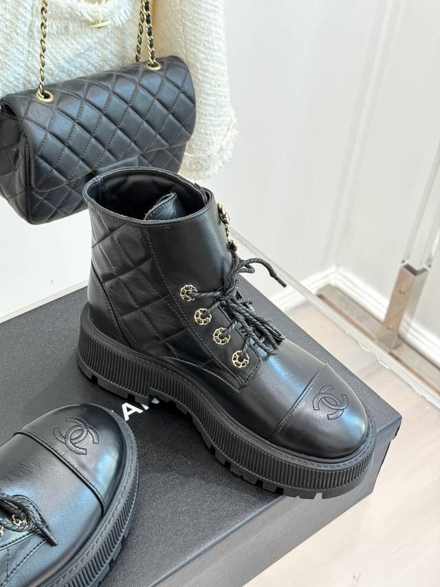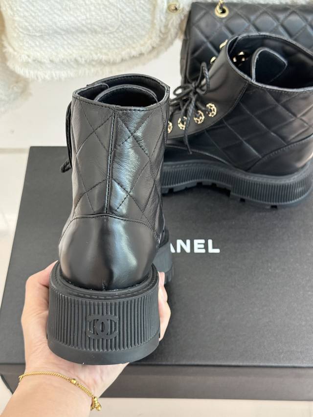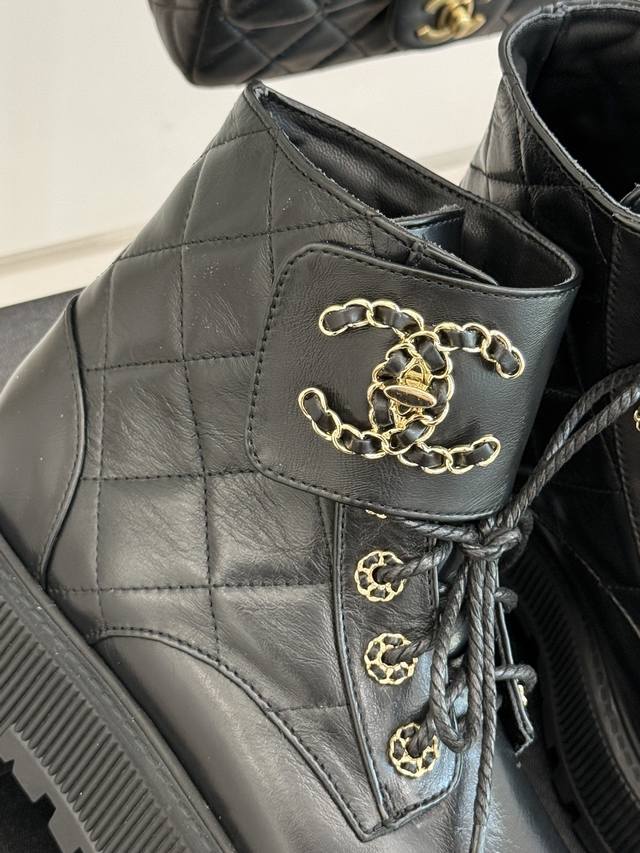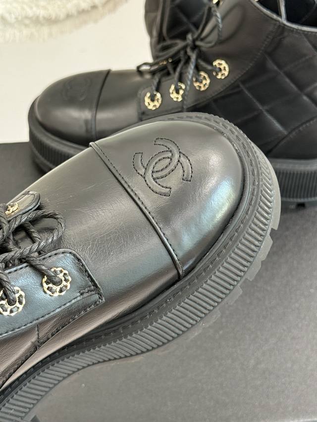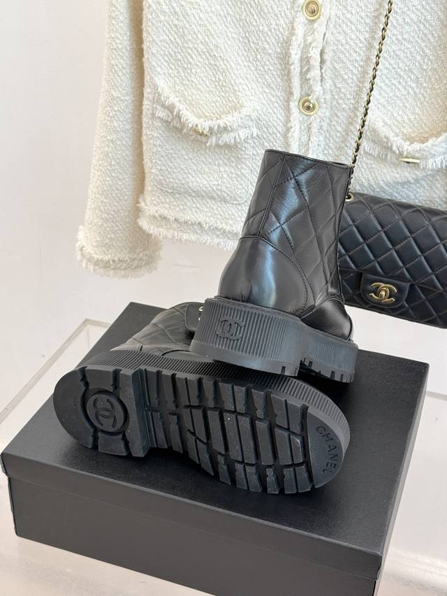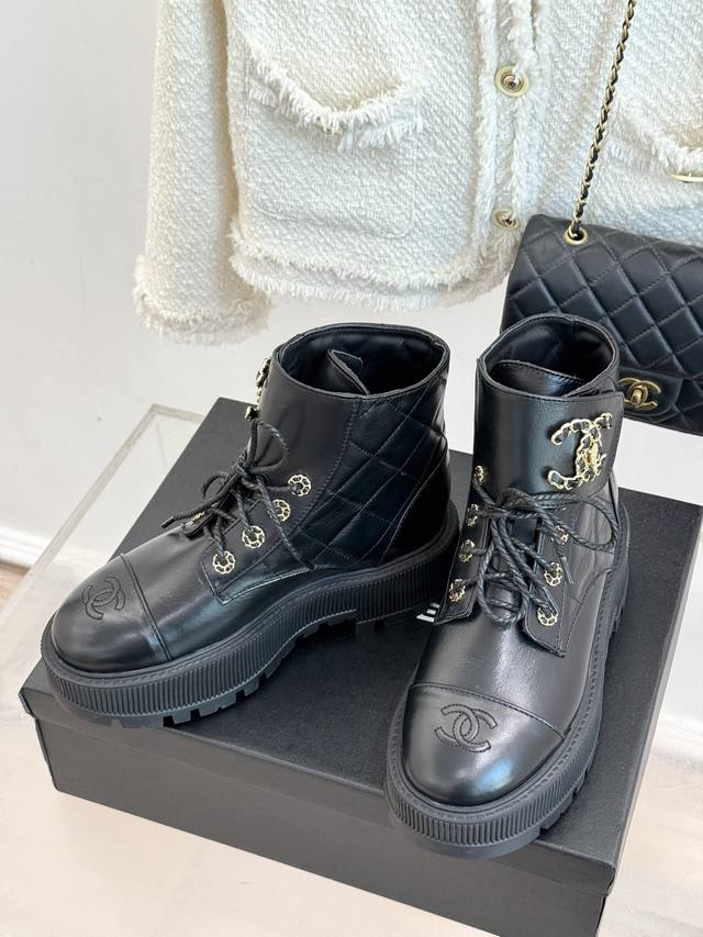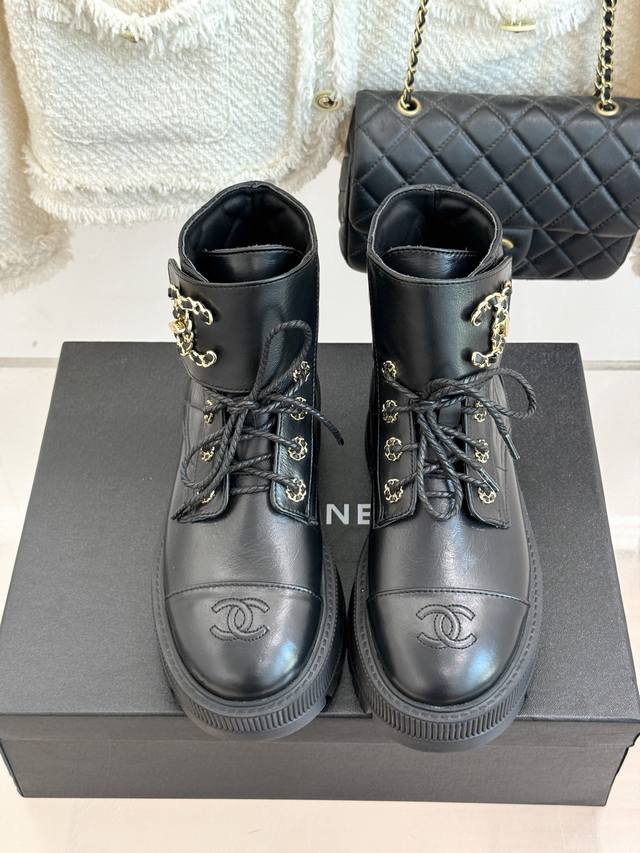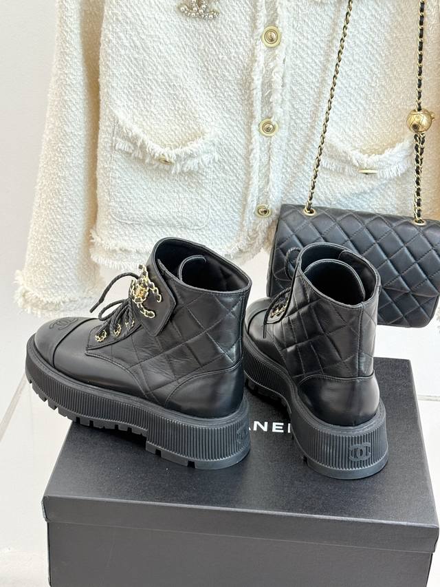 Factory Price: Chane* | Chanel's classic Velcro quilted chain with a double C buckle. These platform motorcycle boots are designed to complement Chanel's classic style. When equestrian-inspired quilting meets the rugged silhouette of streetwear, Chanel redefines the boundaries between classic and unique with this pair of boots. The classic quilted pattern on the side conceals the brand's signature, while the chain-linked double C buckle is the ultimate finishing touch. The two smoothly interlocking letters embody Coco Chanel's commitment to minimalist aesthetics and a timeless fashion metaphor. The combination of a 3cm thick sole and genuine leather welt conceals a comfortable, ingenious design, ensuring every step is light and secure. Paired with a leather jacket, they create a casual street style. Paired with a coat, they exude an elegant look. Paired with a short skirt, they create a sweet and cool effect. Even a long skirt can be complemented with a casual mix-and-match aesthetic. The delicate finish of the double C buckle and the metallic sheen of the chain have long evoked a sense of understated elegance. These ankle boots are more than just fall and winter footwear; they're a seasonal style statement, perfectly embodying elegance and sharpness at the ankle. Made from custom-made sheepskin, the lining is also sheepskin. Custom-made, non-slip outsoles are custom-made from the original mold. Sizes: 35-39, 40, 41.