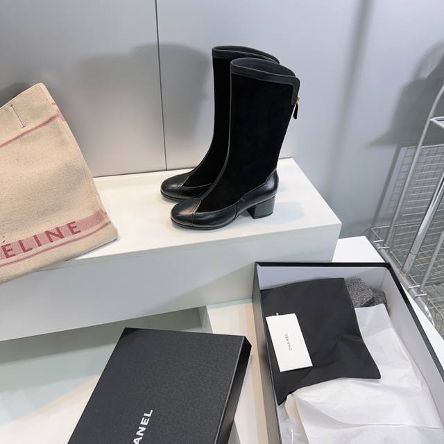 High-quality factory! Top-quality Chanel Fall/Winter 2025 suede color-blocked chunky heel round toe back zipper riding boots! Retro-style boots, Western cowboy ankle boots! When Chanel elegance meets Western style, these boots are the best interpretation. The toughness of leather and the softness of suede intertwine to outline a unique silhouette, a collision of classic elements! The unique Western boot shaft design features smooth curves and irregular edges like free lines in the wilderness! It carries a casual and unrestrained feel. Let every step exude both freedom and sophistication! Whether paired with tailored suit trousers for a cool urban look, or with a flowing dress for a harmonious blend of strength and softness, or even with jeans for an authentic Western style! The upper is made of top-grain cowhide combined with sheepskin suede. The insole is made of water-dyed cowhide. The outsole is made of thickened genuine Italian leather. Heel height: 4.5cm. Sizes: 35-41. Sizes 40 and 41 are custom-made and non-refundable. Comes with original packaging.
